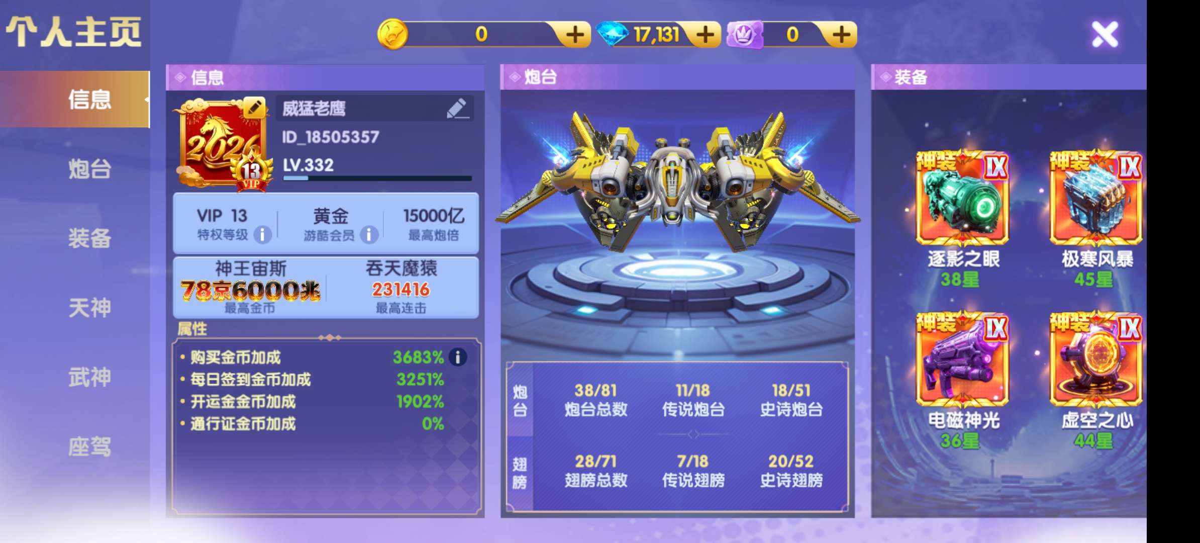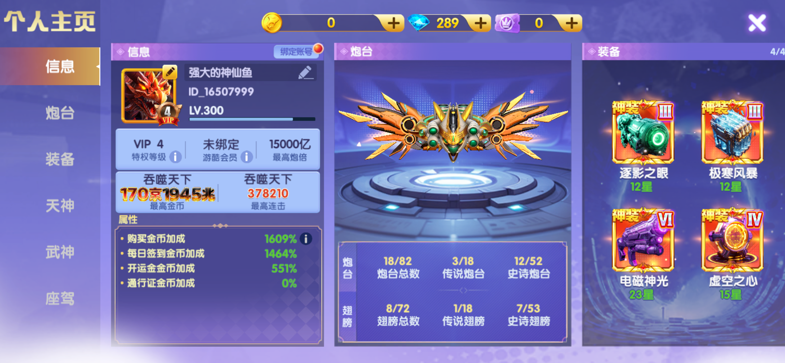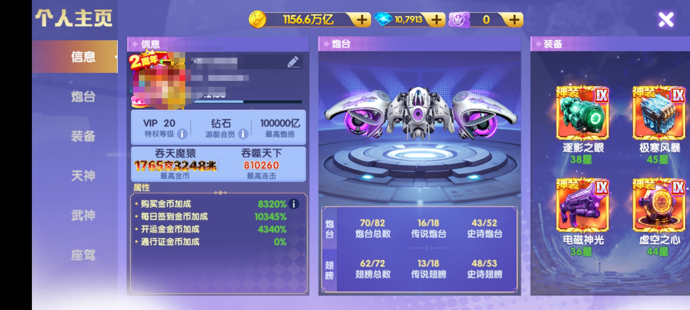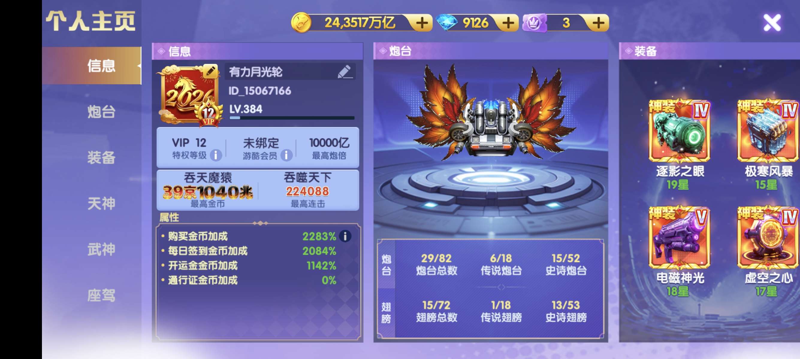 米340兆 两万炮 天神5-4-5三慌 西游套 10武神连击 1200斩 道具充足 优惠出