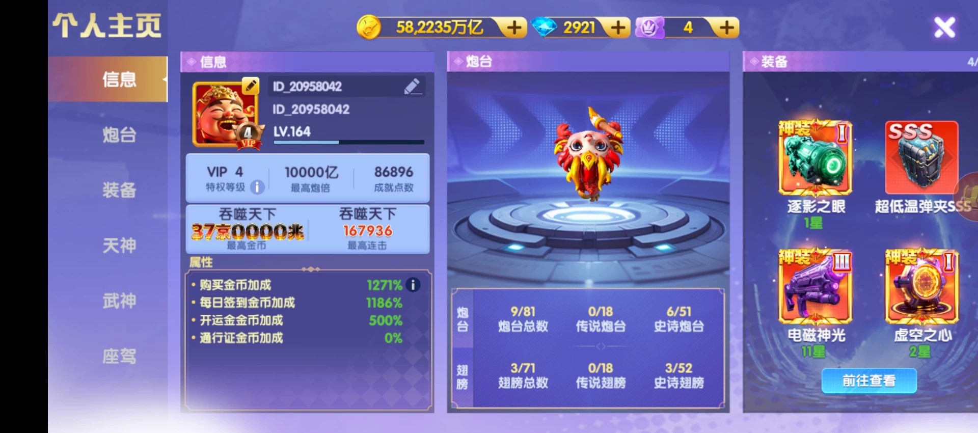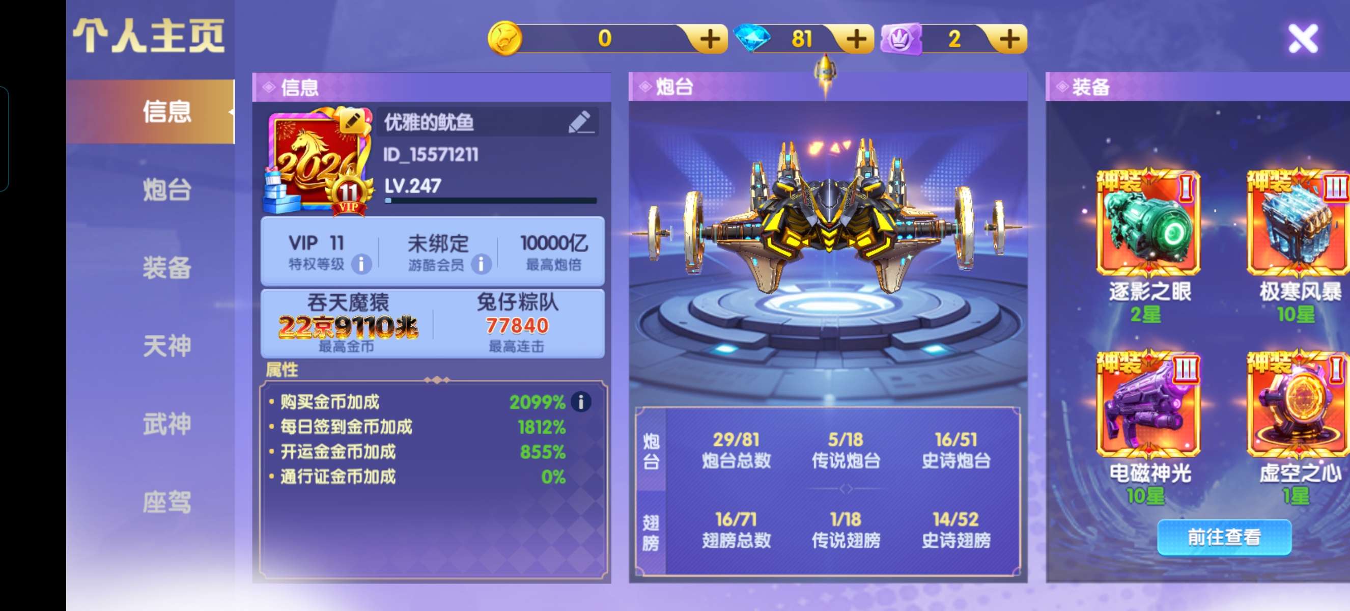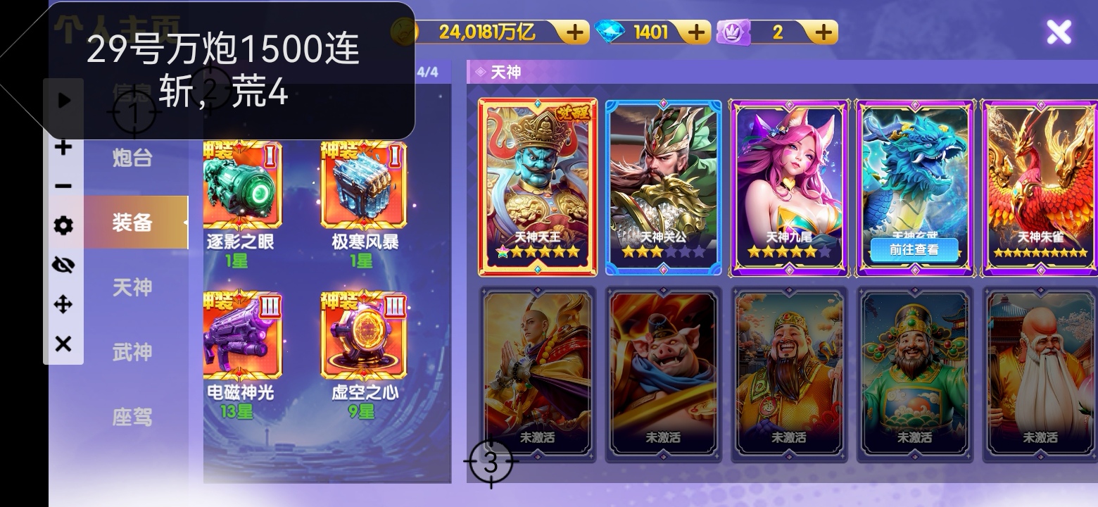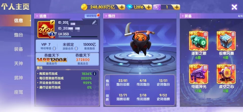 官Q-V7-1836加成-1.5万亿炮-248京-卖断-三级洪荒-多武神-带座驾