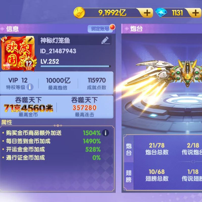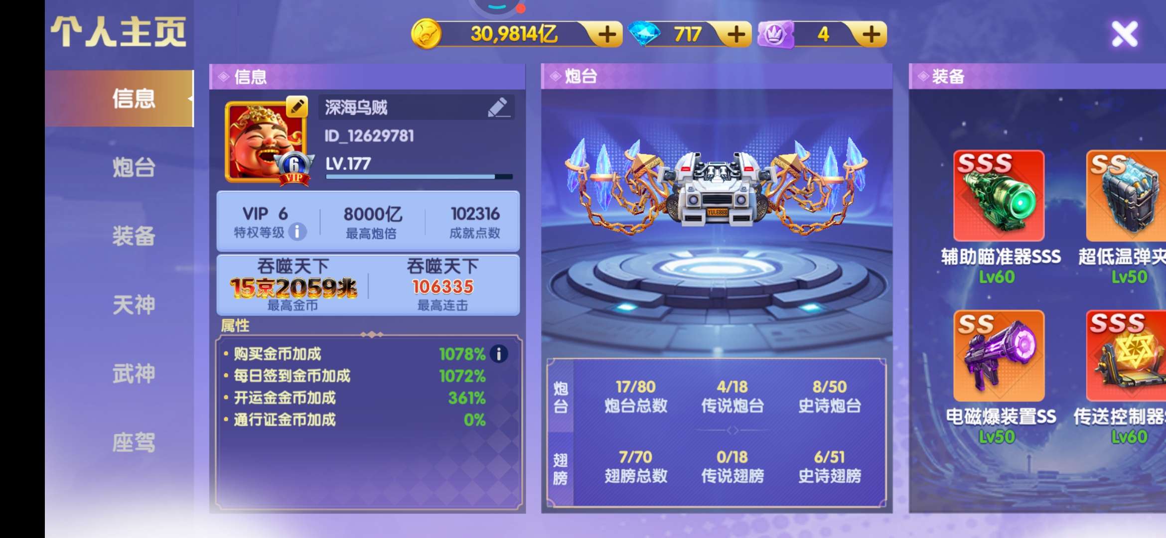 鱼乐达人号官方q出,170京 15000炮,3级洪荒,11个武神,装备多