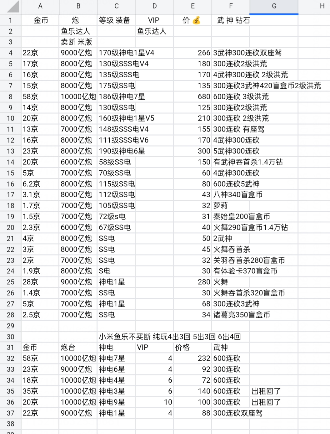 小米万炮神装破产号。3荒4神。还没爆发过不想玩了。8开新号可换绑。议价勿扰
