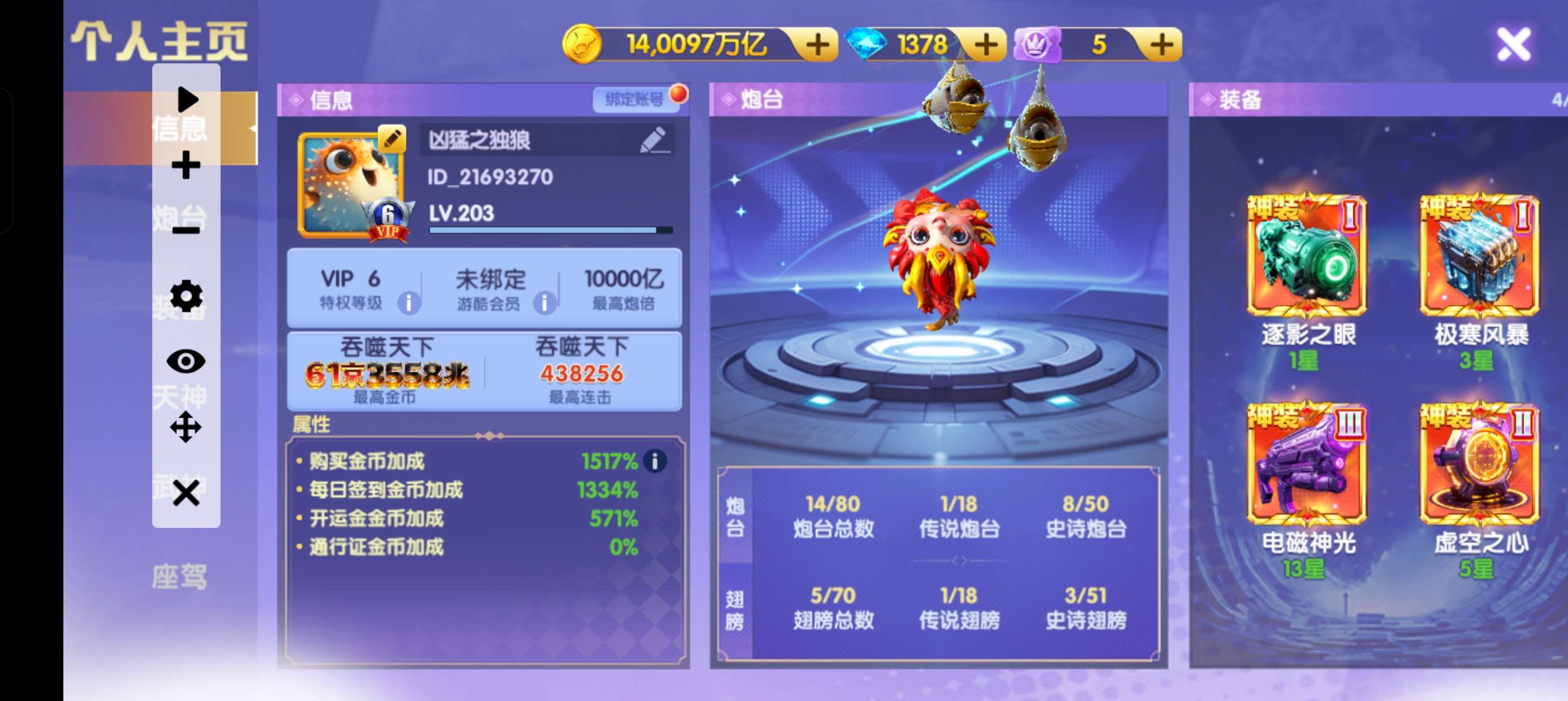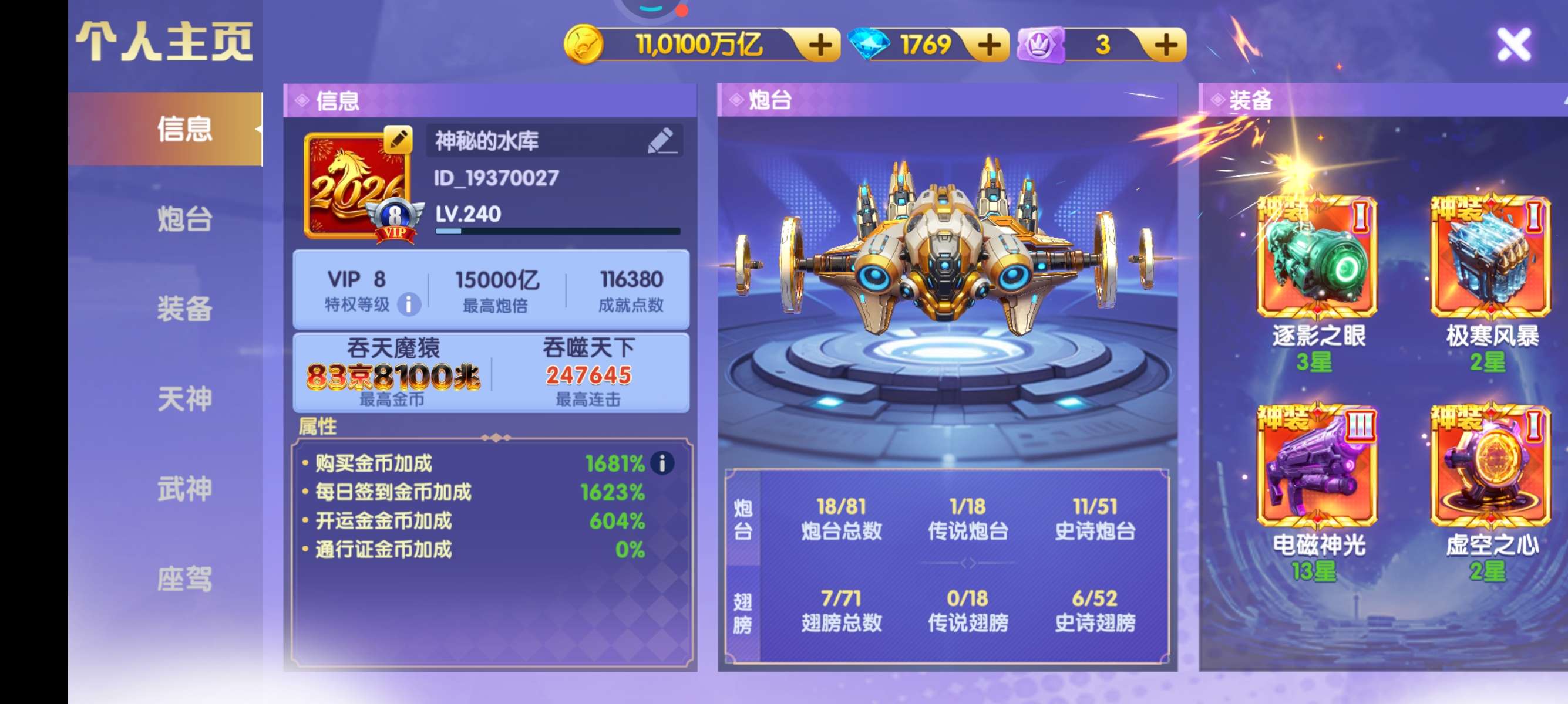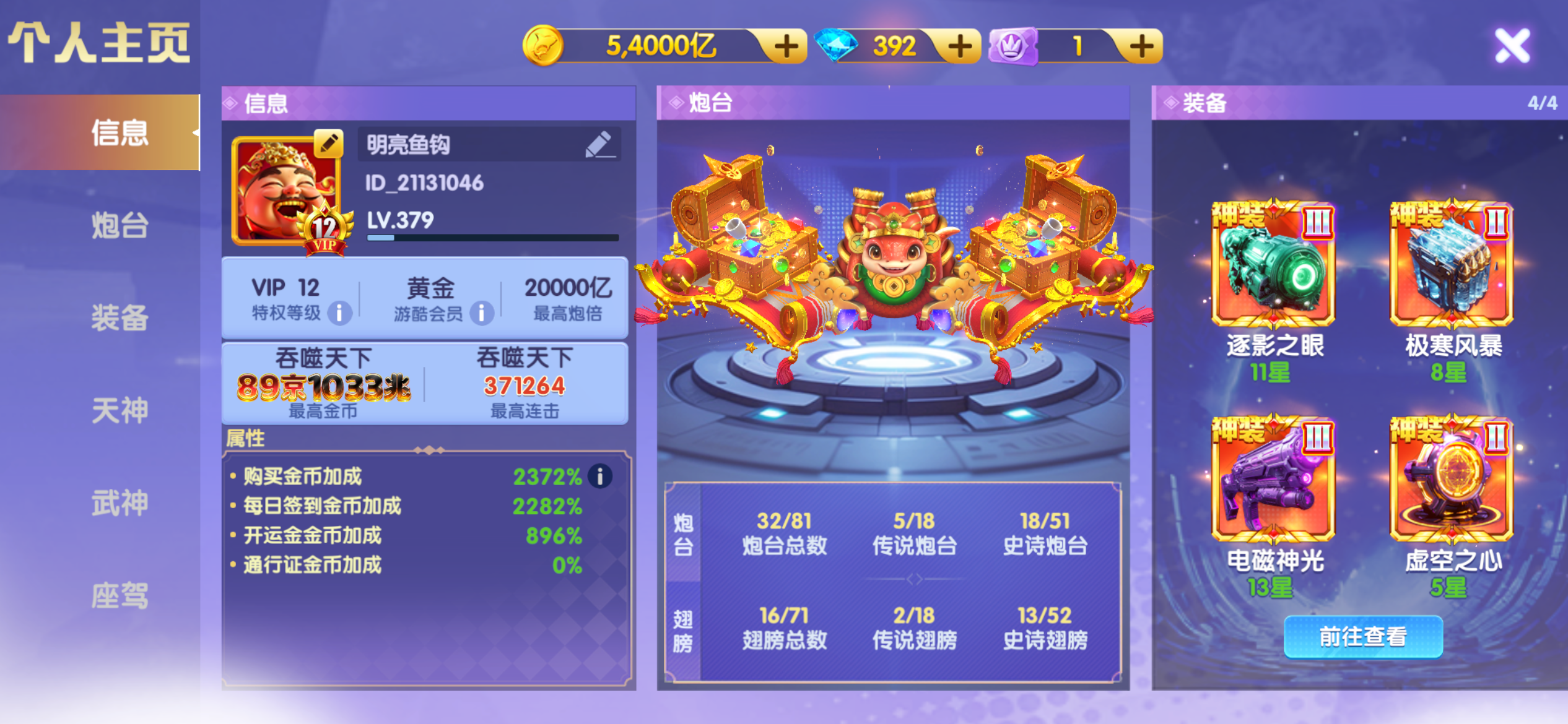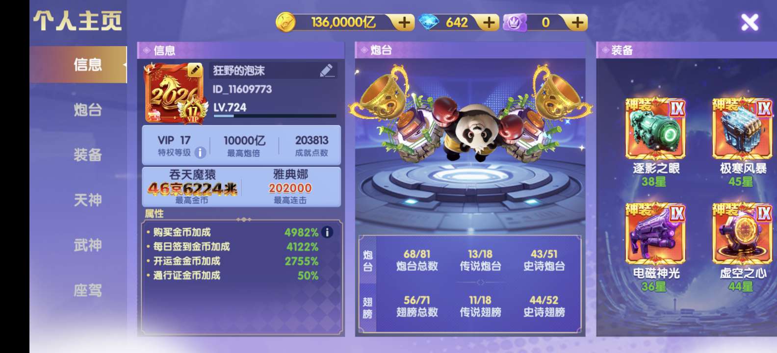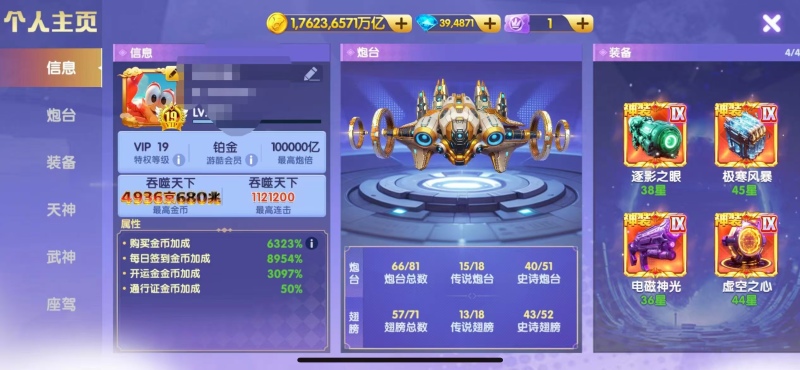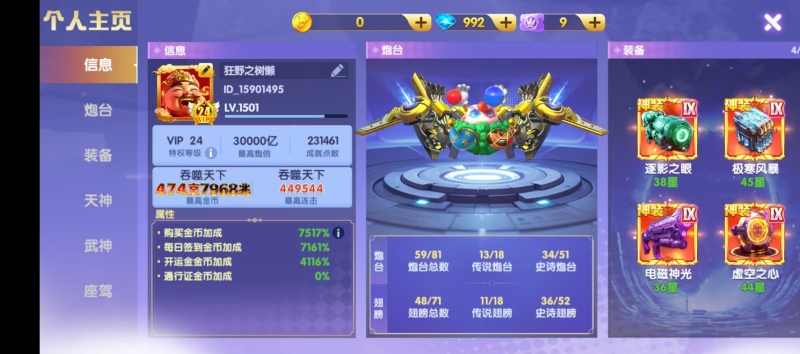 买断顶配v24破产号,差一点v25,特权快13秒换绑,金币加成7247%,碾压大多数顶配号,配置自己看。满天神 五福霜降全部6星以上,配置高,脱坑价出