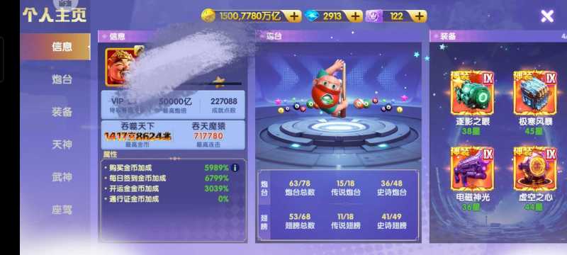 万炮精品破产号:全神装+天神444,洪荒三阶,西游羁绊+武神连击,8开头安全换绑