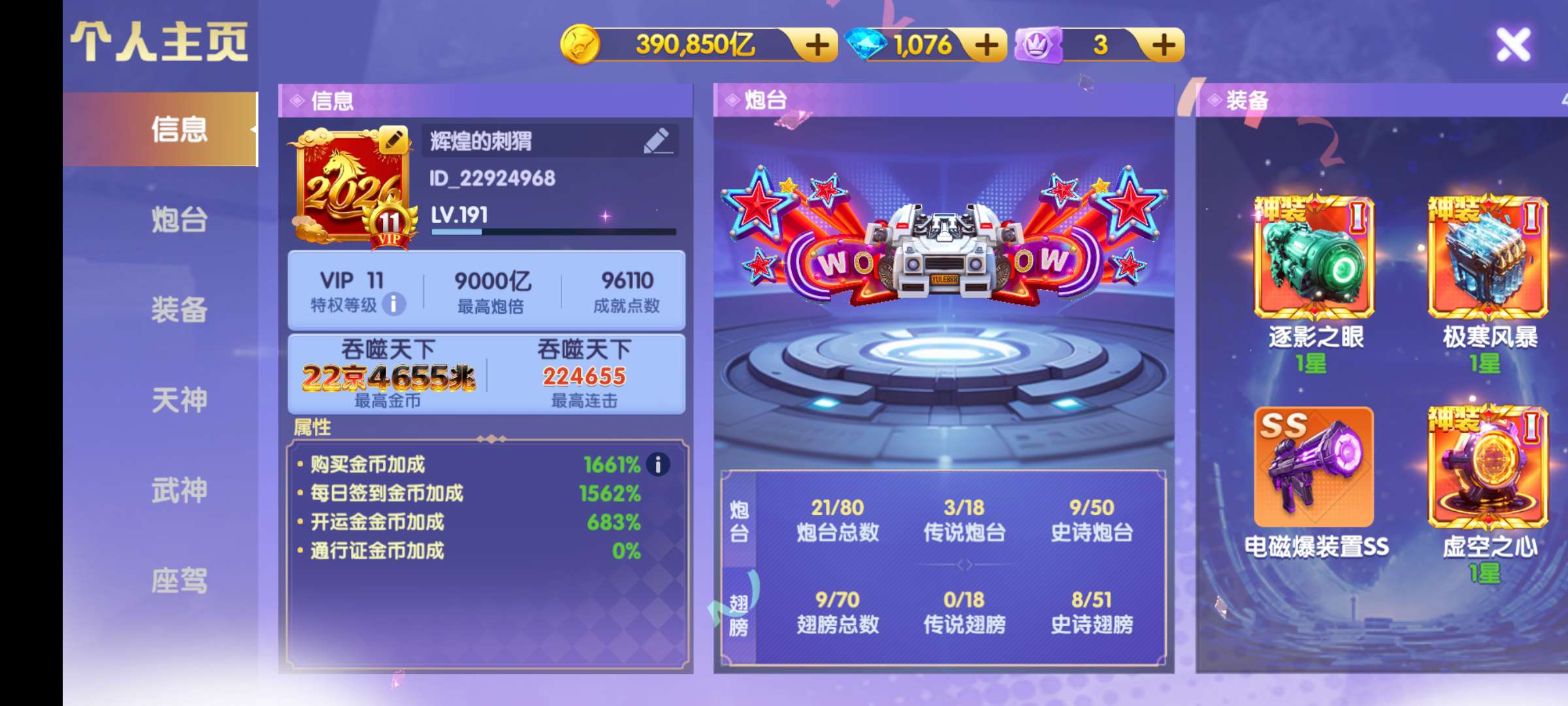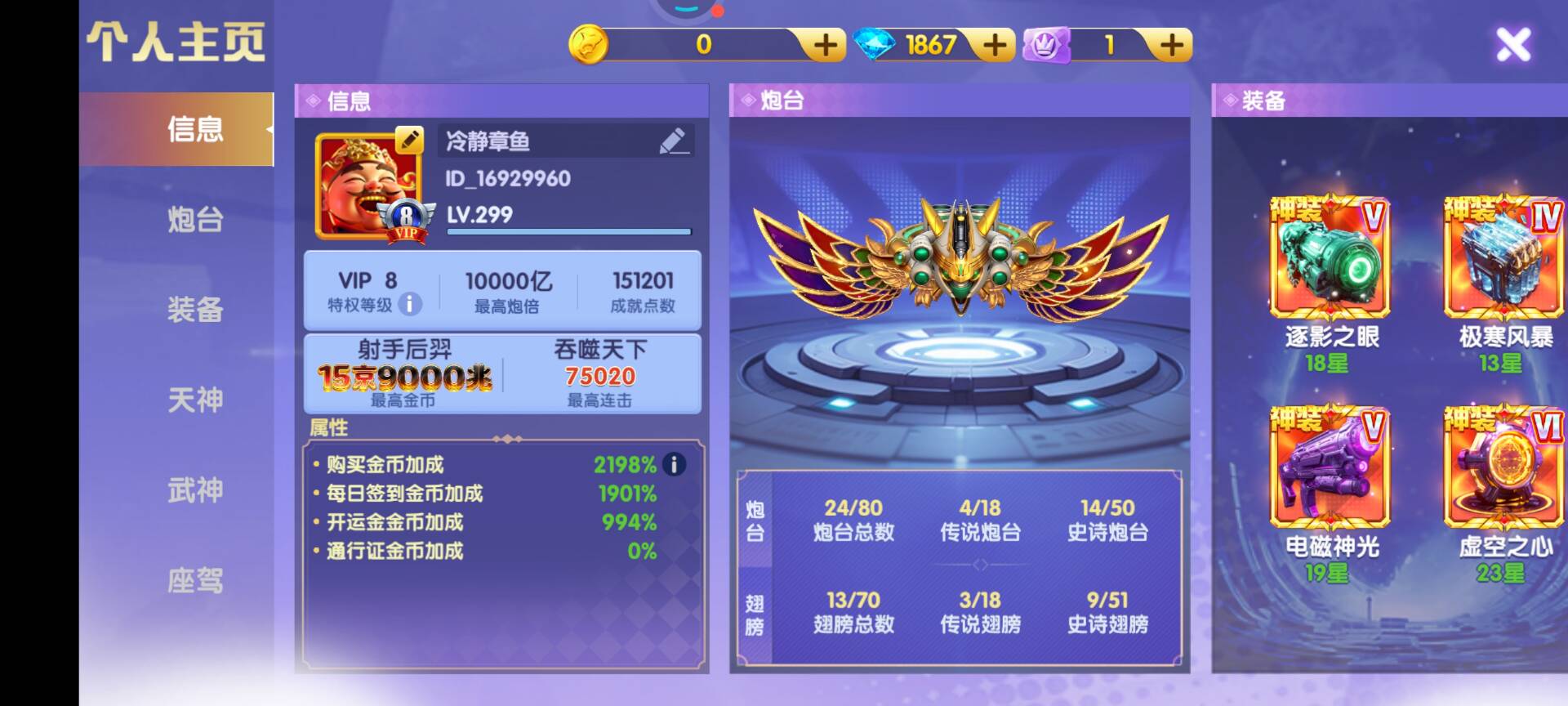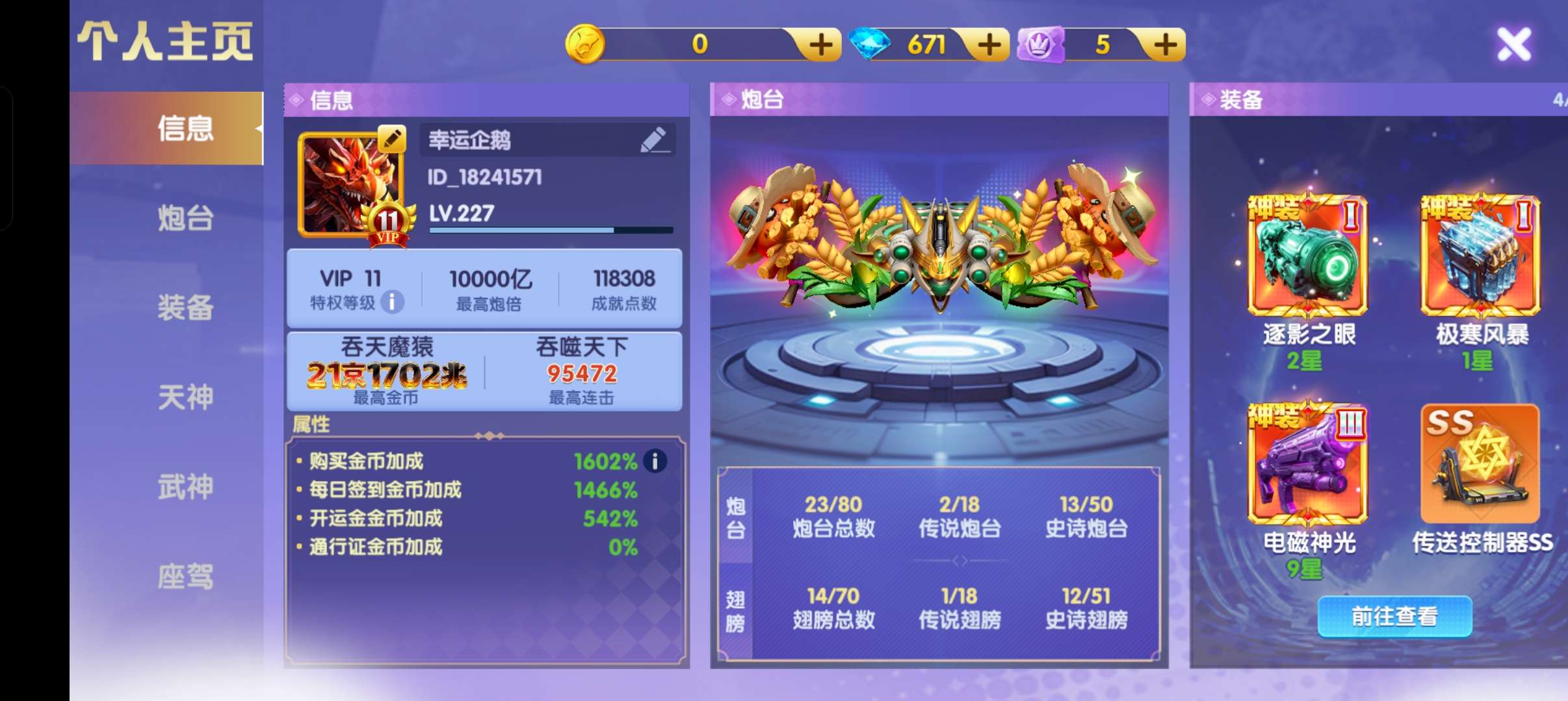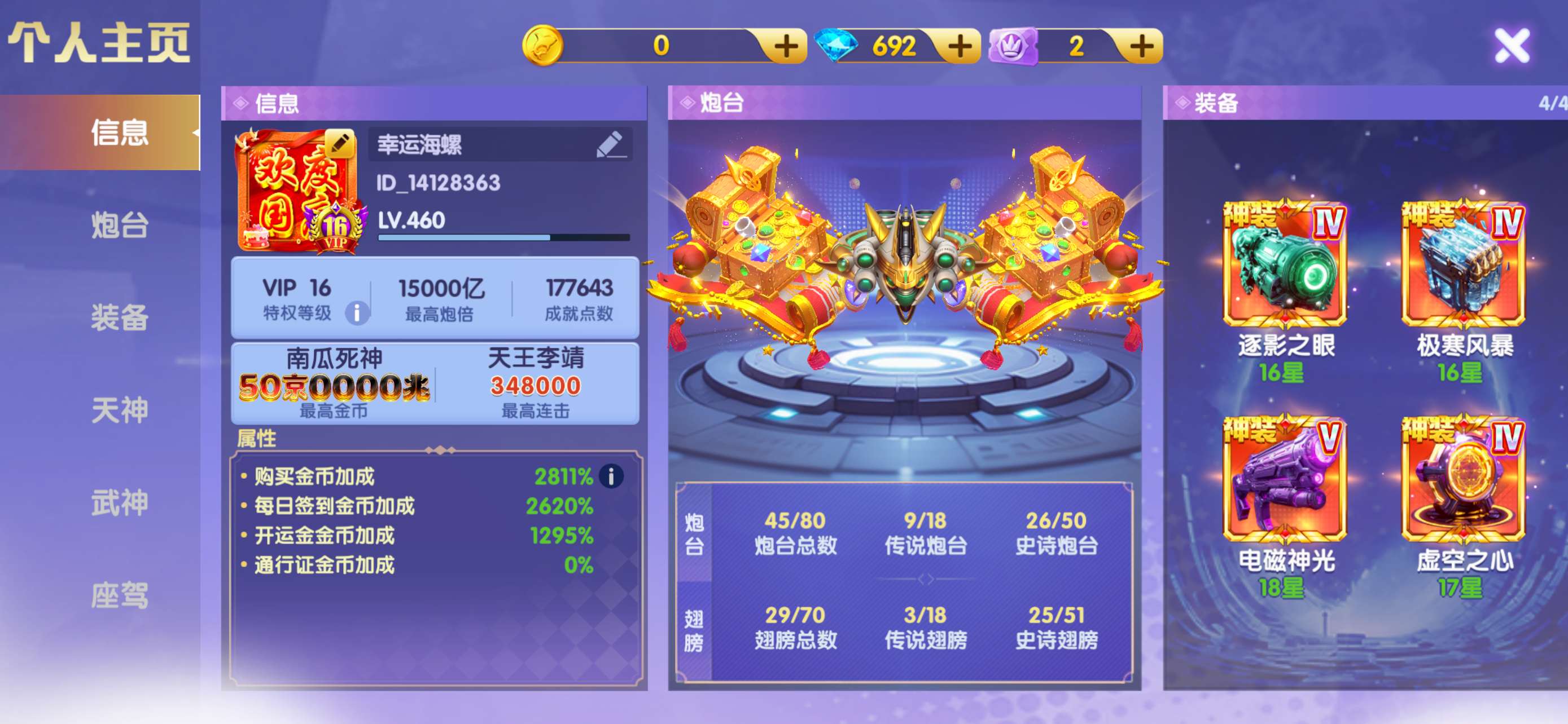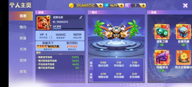 V10 加成2800 快2万炮三条翻倍羁绊,绝版武神翻倍。