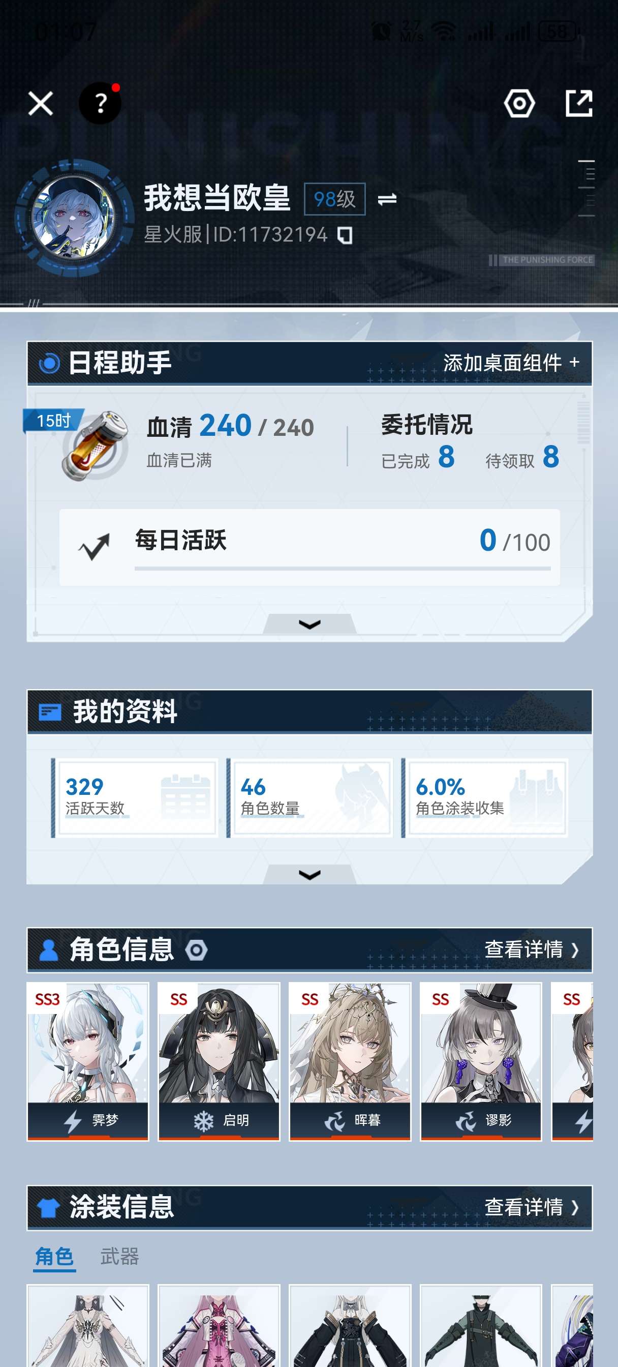 OPPO的账号,三个六星专武,主玩的满意识全超频了,深红等很多,图片看,可小刀