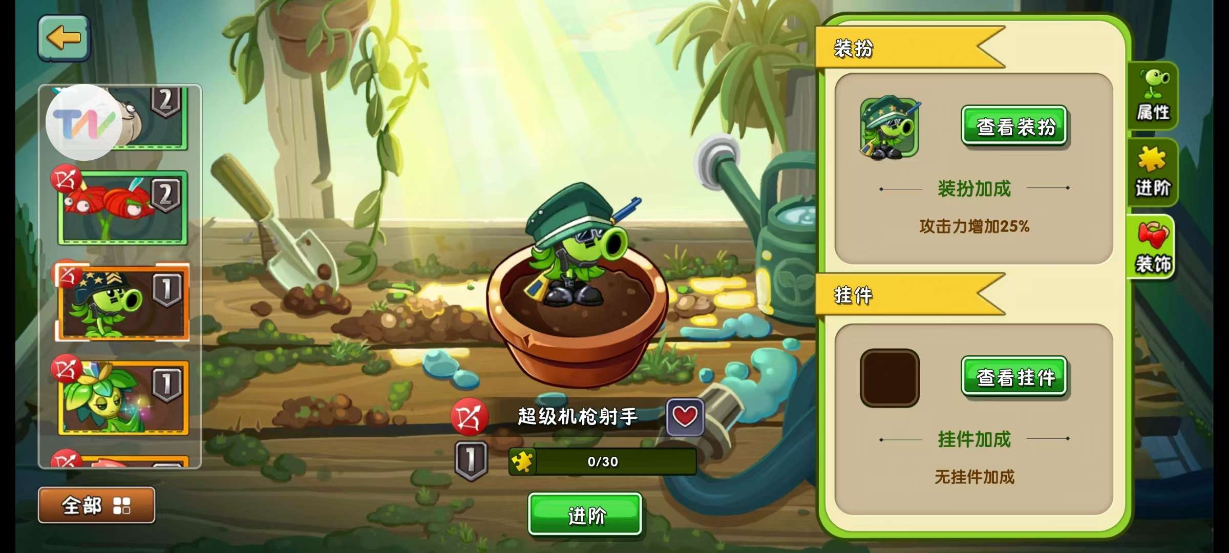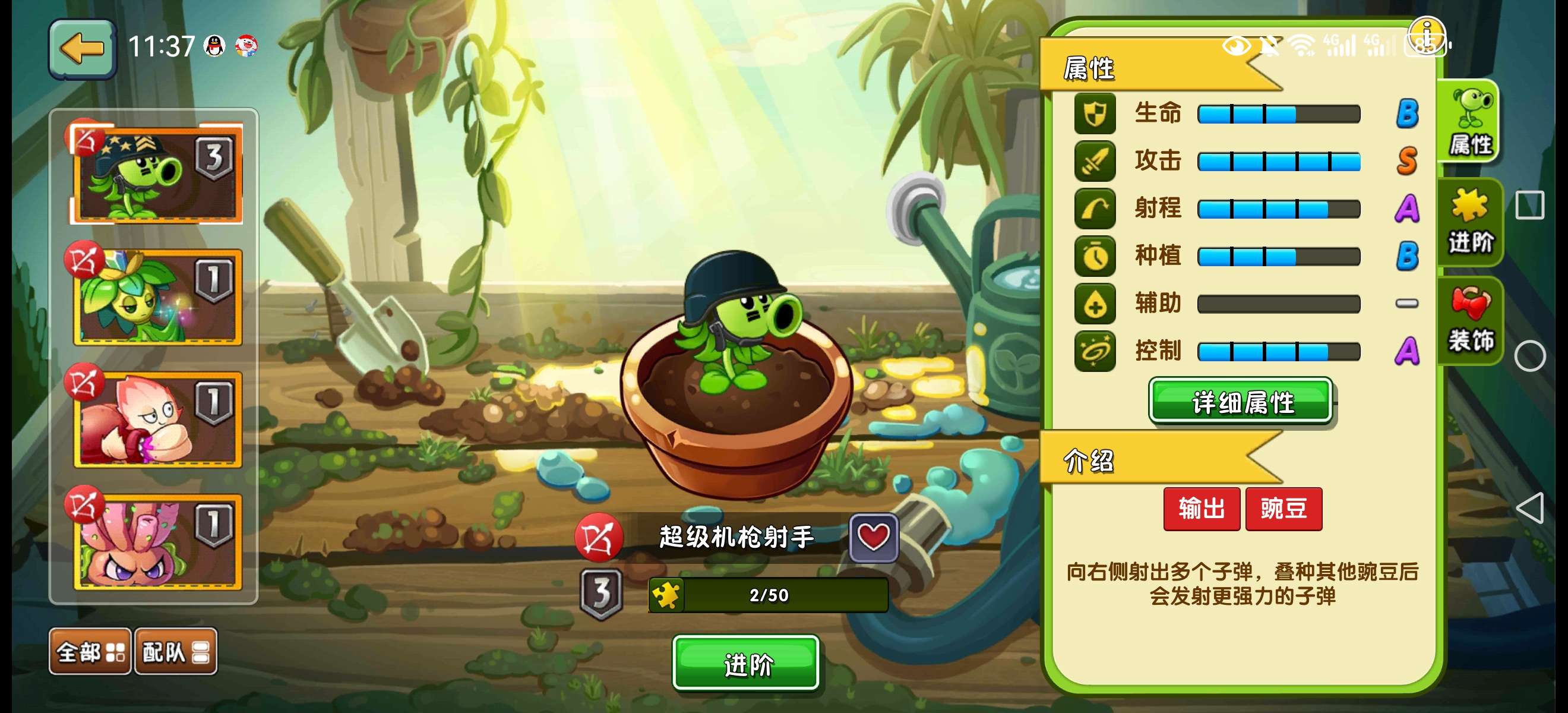 有3阶超级机枪豌豆大哥,贪吃龙草牛蒡桑葚瓷砖魔豆阳光韭菜,可上传云端,有满级紫手套,5阶机枪仙人掌猫