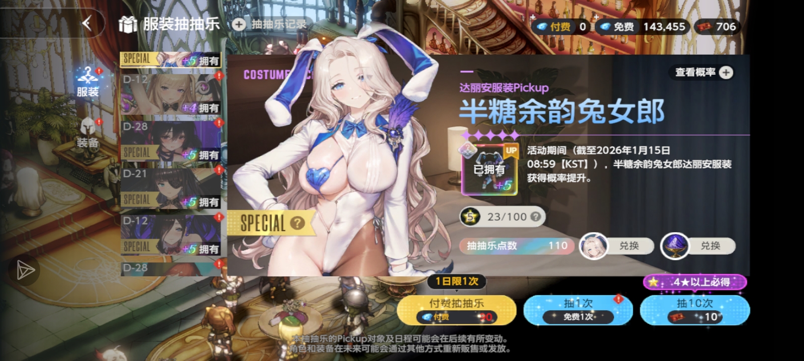 【国际服直登】67000钻+单抽卷1300+10-15限定组合(含重复)+泳装泰瑞斯+噩梦兔女郎