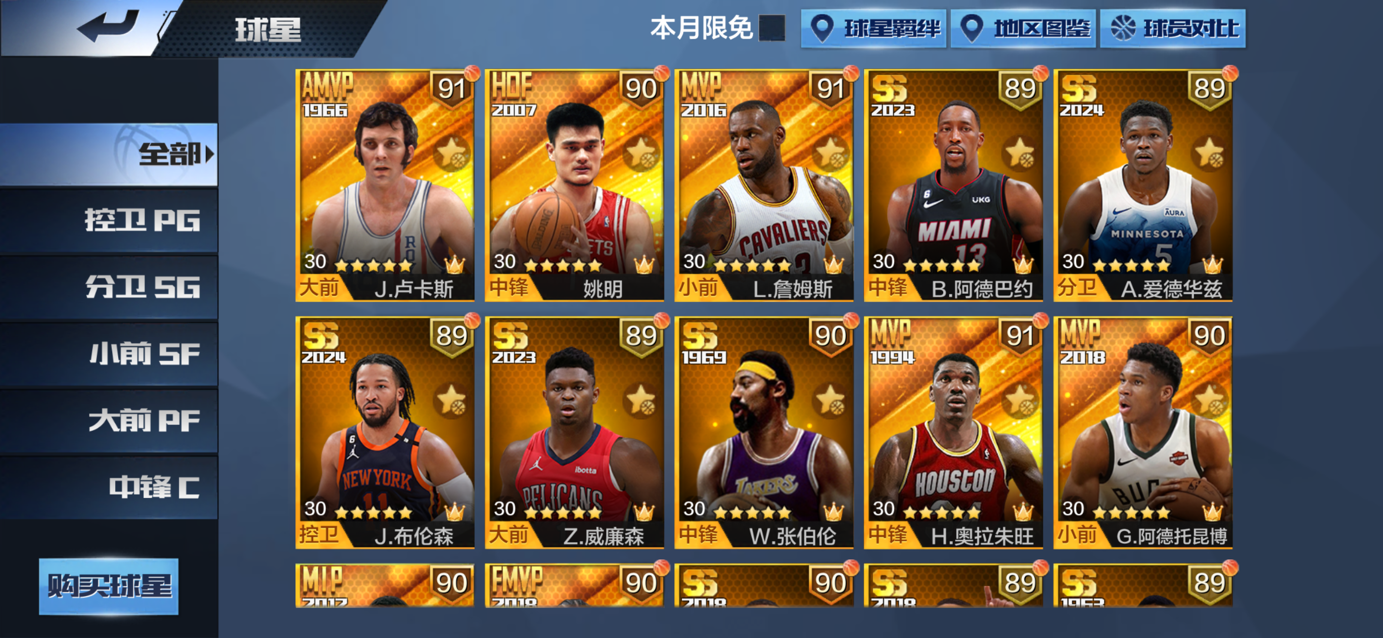 新拉,邓肯华子浓眉姚明哈弗基德教父,球探卡111个,巨星卡过半资源多多