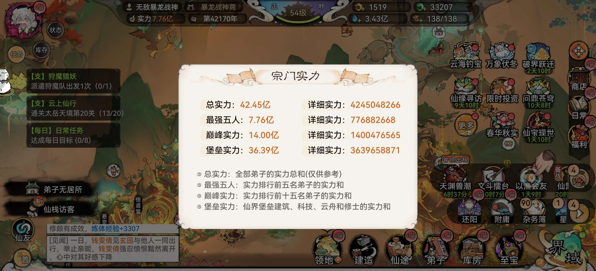 7.7亿战力,氪金鸣金 青莲 玉霄等基础功法也都有,42亿总战力,可组多队,满星巨灵 满星红尘 四星