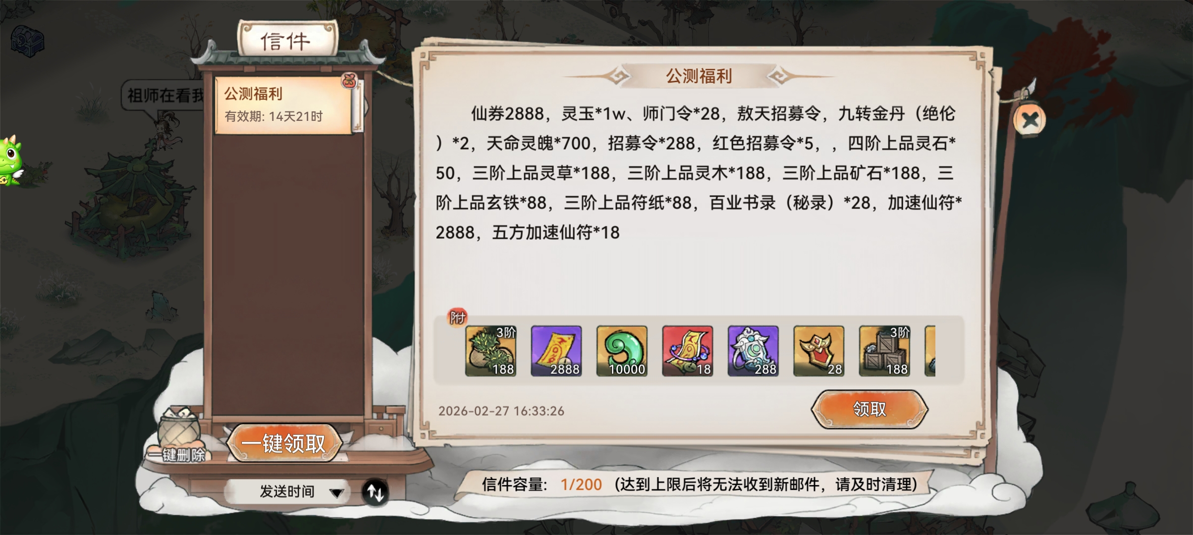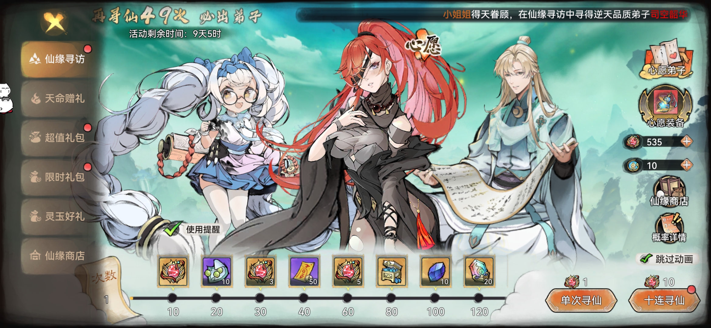 2个逆天弟子+灵玉40000+寻仙令125+招募令110+许愿币85
