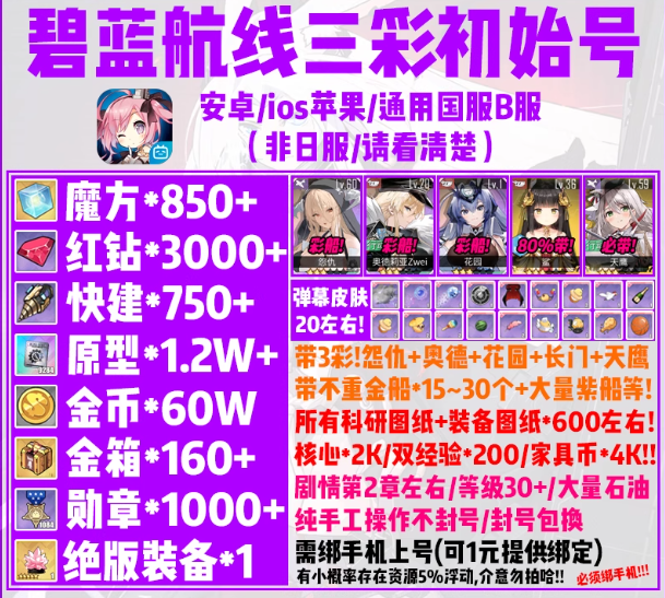 碧蓝航线【安卓B服】需绑手机-3000钻850魔方+3彩(怨奥花)+天鹰+长门+15金船