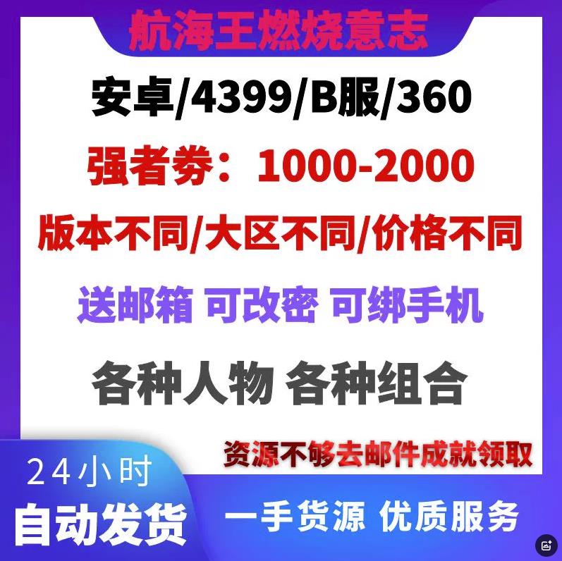安卓360版佐乌随机大区,必带罗杰+老鹰+新世界黑胡子+强者卷1850-2000张+UR卷240+金魂500左右,必带3-8个SSR+10个自选7级宝石+7W蓝钻。可绑手机,可改密码,安全可绑,畅玩无忧!!!