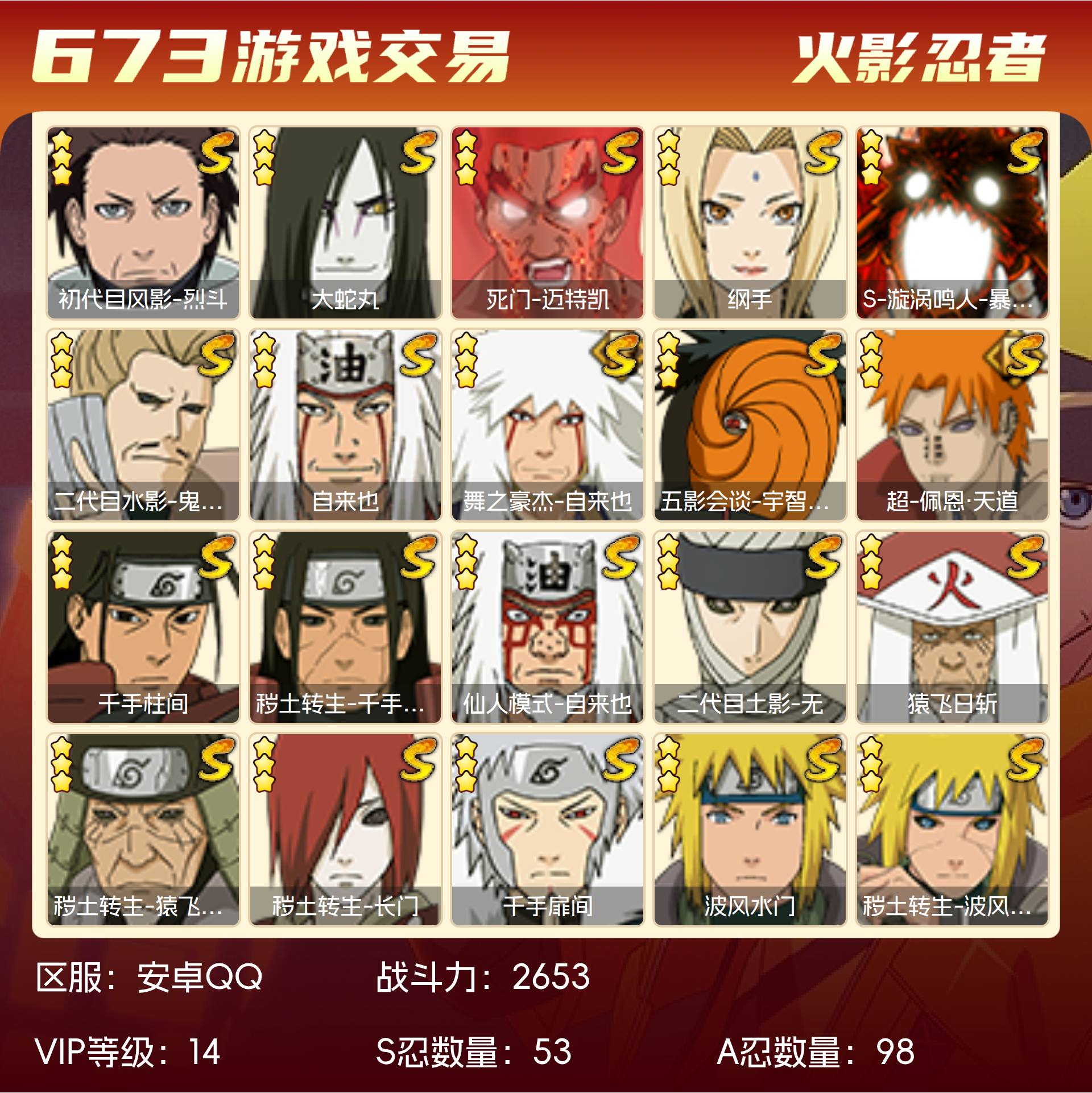 【31S忍者准32S忍者57A忍者1418W战力】纲手、日斩、大蛇丸、九喇嘛鸣人、自来也、舞杰自来也、百豪纲、S门凯、秽土水门、秽土日斩、秽土扉间、秽土柱间、秽土斑、木叶创立斑、须佐能乎鼬、秽土鼬、神秘面具男、白面具、忍战带土、罗砂、鬼灯幻月、三代目雷影、金角银角、秽土半藏、忍战大野木、无、天道佩恩、天道超、秽土长门、仙人兜、博人传金式、S司凭血飞段、疾风传我爱罗、青年水门、半蛇斗篷兜、博人传木叶丸、仙人鸣人、忍者之路面麻、九尾鸣人、鹰小队佐助、须佐佐助、疾风咒印佐助、百豪樱、忍战丁次、神威卡卡西、忍战卡卡西、元气卡卡西、惊门凯、秽土阿斯玛、七夕阿斯玛、新春水门、新春止水、忍战我爱罗、半蛇斗篷兜、仙人鸣人、九尾鸣人、忍战樱84碎片