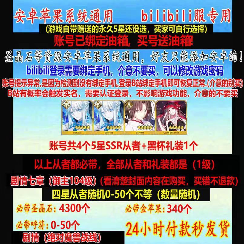 安卓苹果通用,含4个5星SSR从者+黑杯礼装+4300石头+340金苹果,已绑邮箱,可绑手机可改密,登陆需要绑手机,介意勿拍!