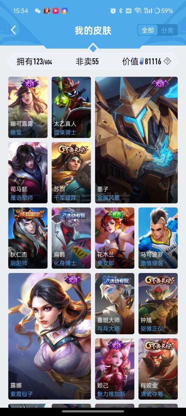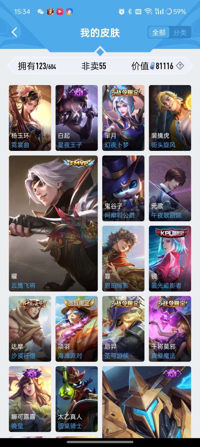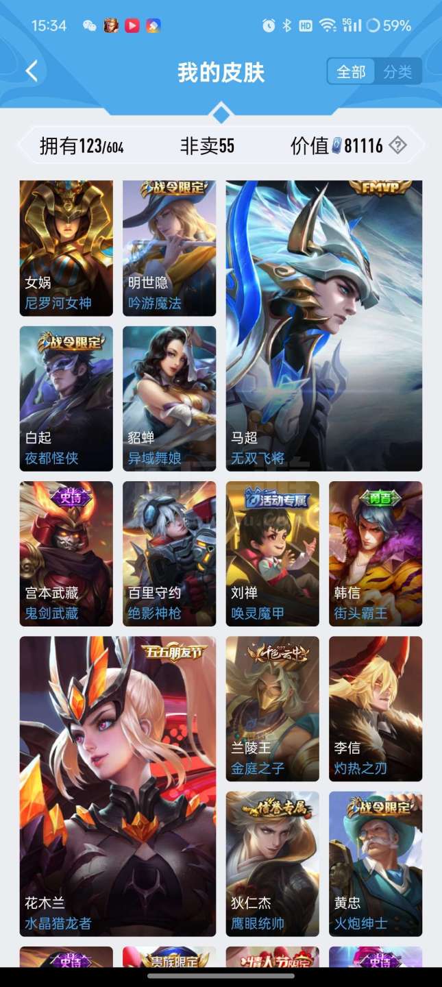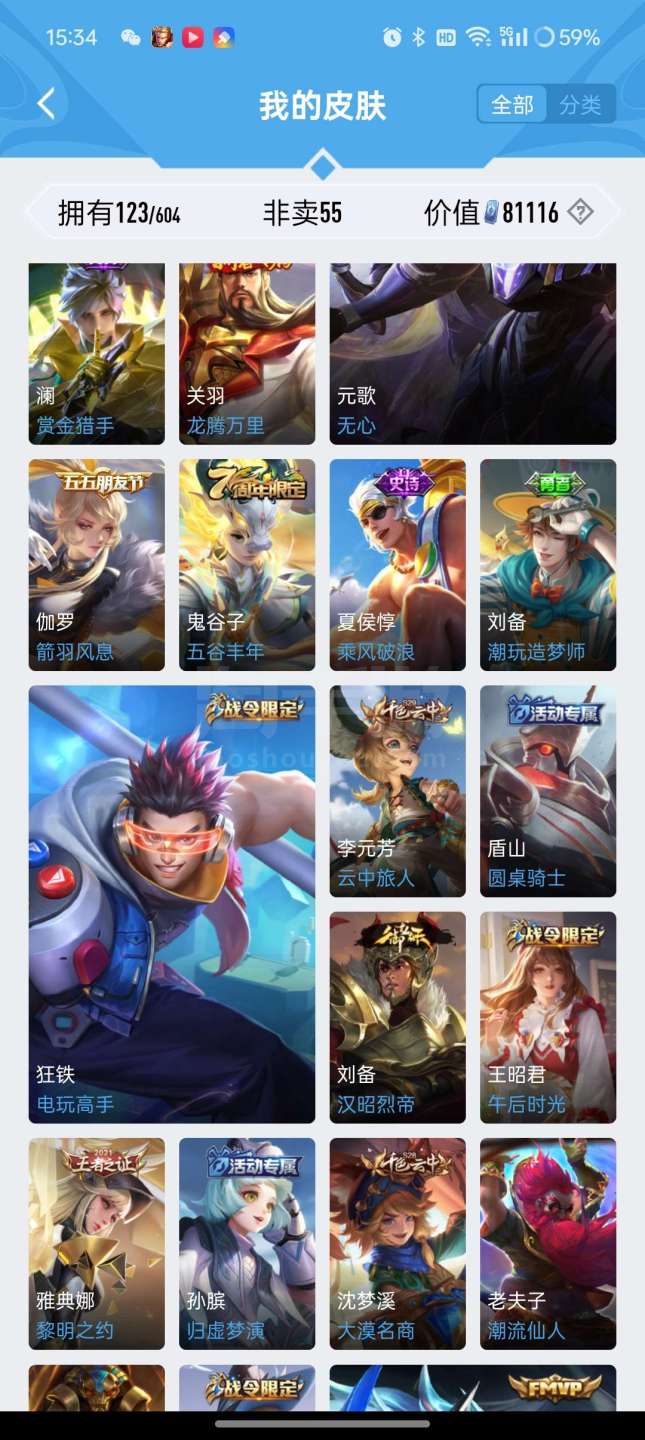 王者荣耀【安卓微信】极品号满铭文万战露娜澜马可全英雄200皮肤碎片