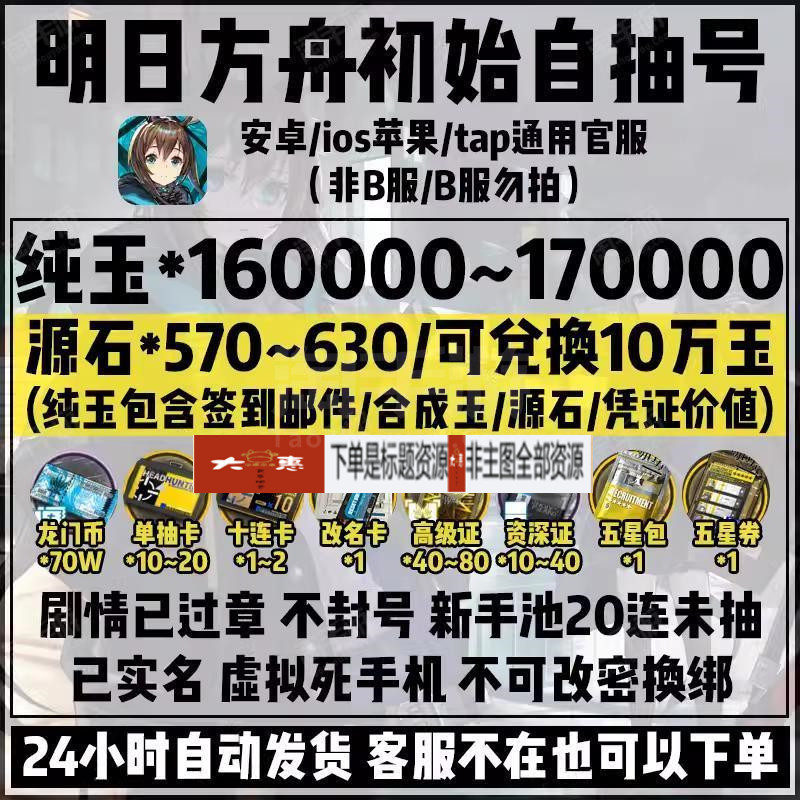 1个号上号直接40000左右红玉+560左右源石(可兑换102600玉)+10~20个单抽凭证价值(6000~12000玉)+1~2个十连凭证价值(6000~12000玉),合计总价值1600000!介意此算法勿拍即可!买卖双方自愿才行哈,下单即默认此算法2:新手卡池2次10连没抽+新手卡池10连必出6星3:源石只在安卓端显示,IOS苹果用户需要到安卓转换成玉