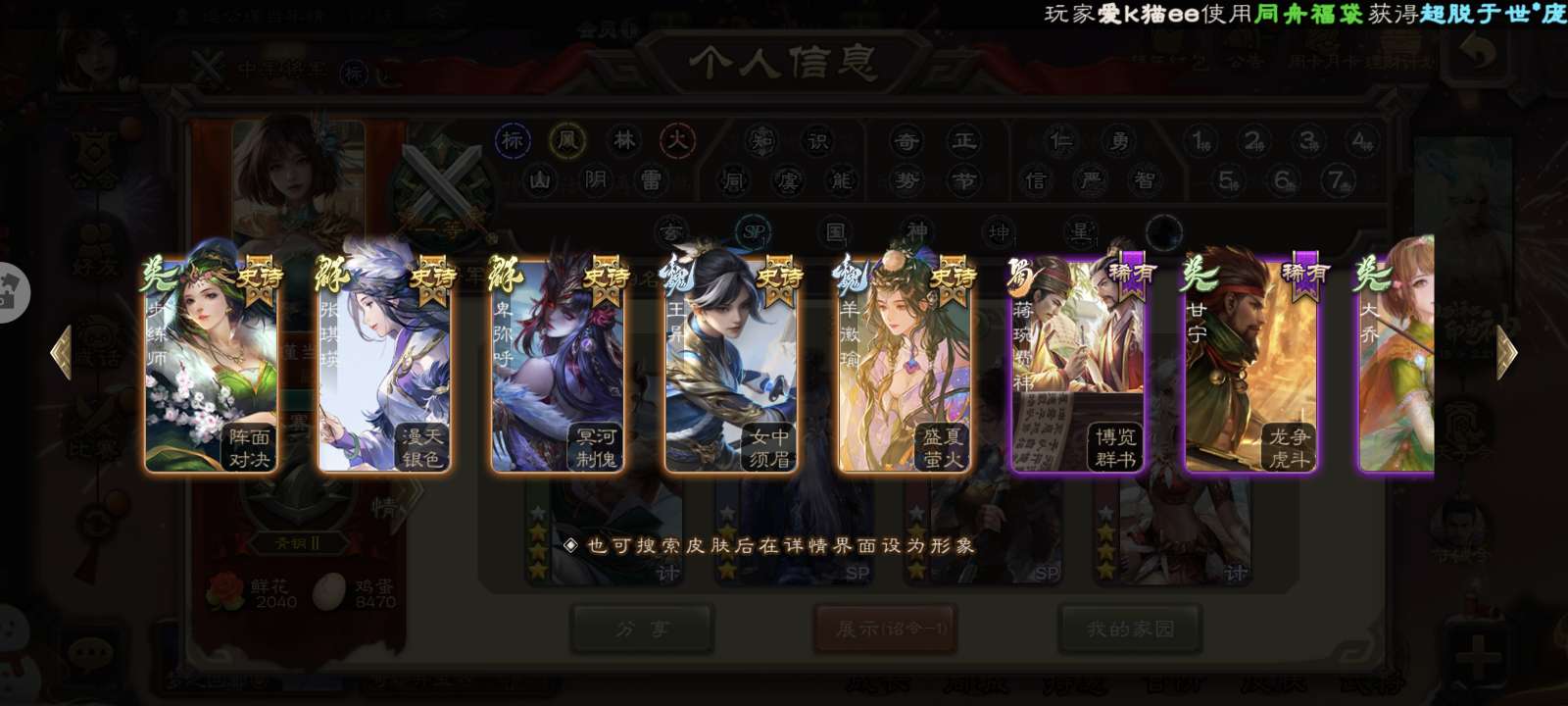 七个史诗武将,七个史诗皮,三个动态,号上还有2000浆糊