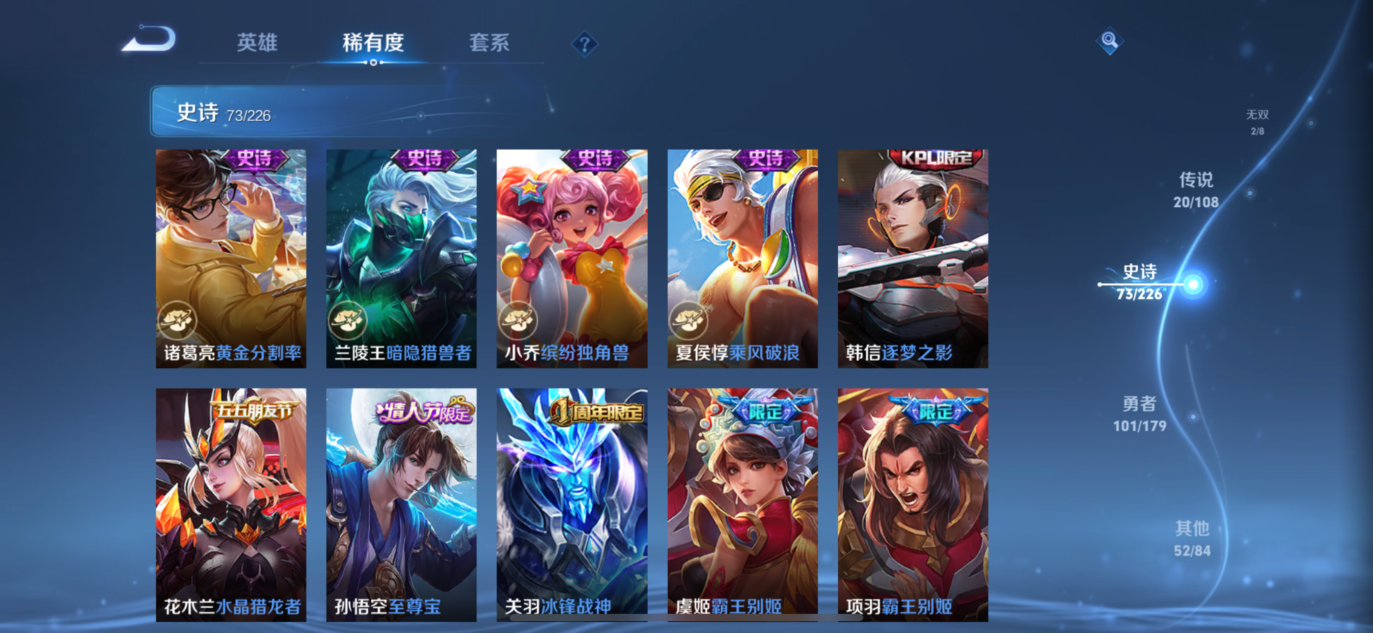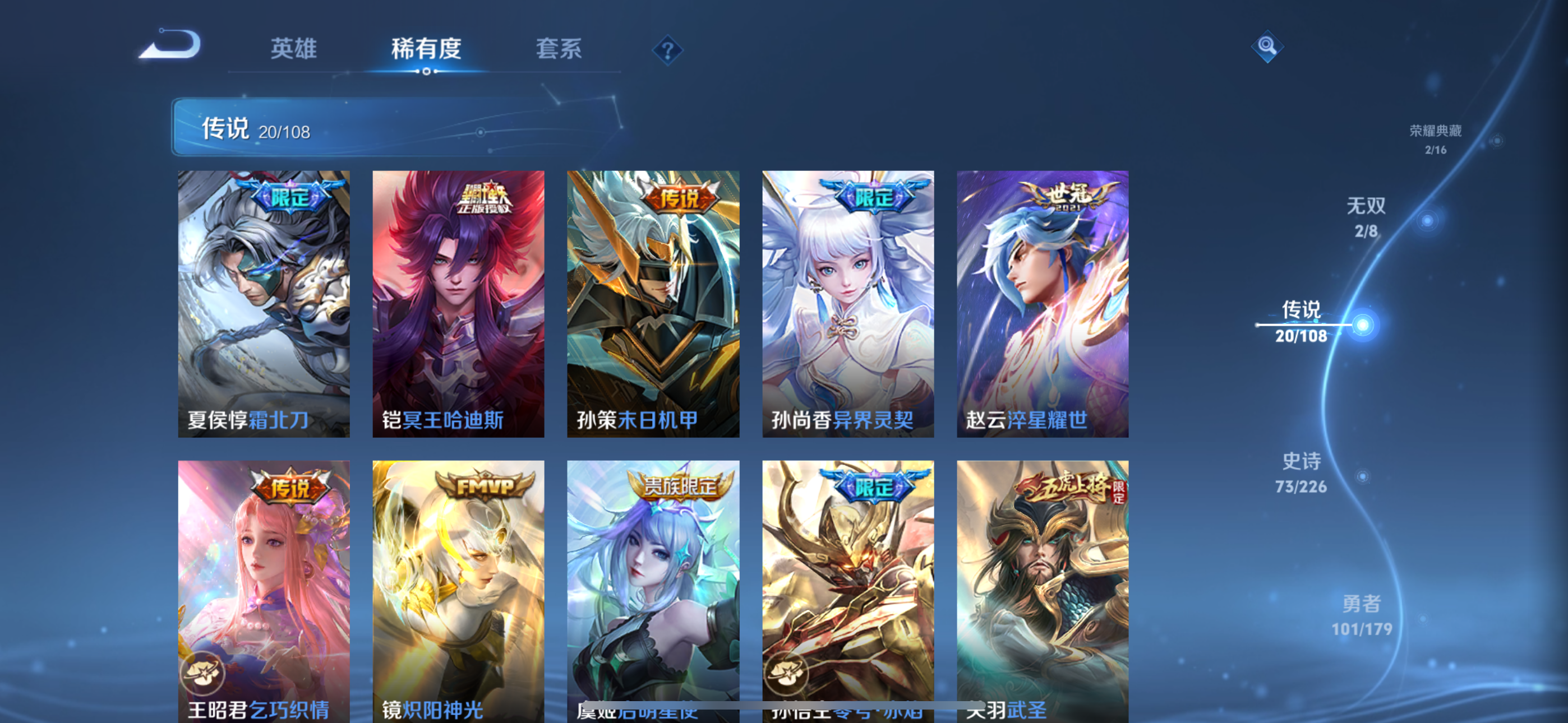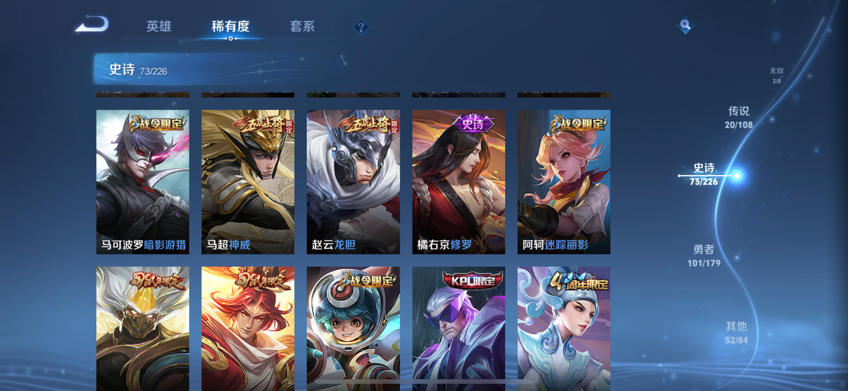 王者荣耀【苹果QQ】v9典藏2无双2传说20史诗73大多数都是限定,有二次实名