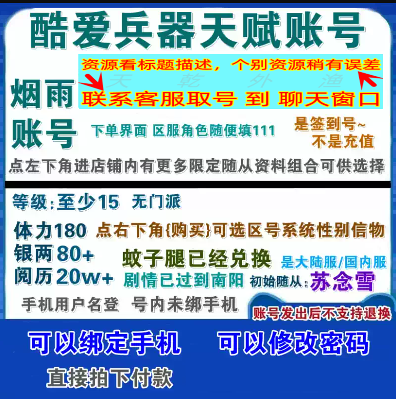 号是国内服、官服版本,手机用户名方式登录,号内未绑定手机,号可绑定手机修改密码 号内只有元宝和每日签到送的物品,号只做了角色建号、小部分剧情,无练其他玩法内容,注:修改密码后依旧需要使用原来的用户名登录,不能用新绑定的手机格式登录。1个手机号码只能注册绑定1个号