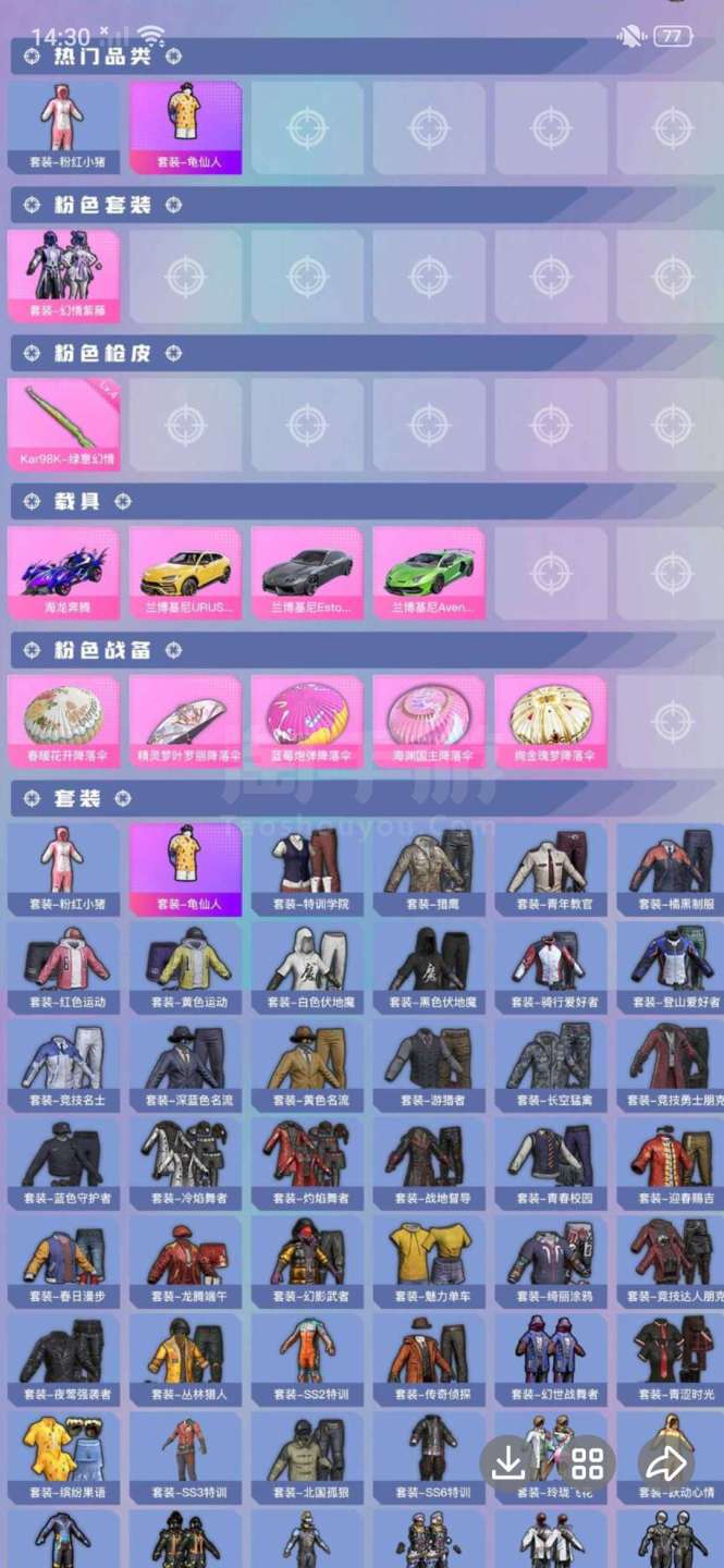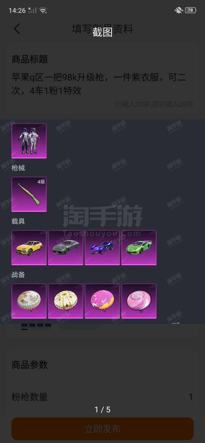 苹果q区一把98k升级枪,一件紫衣服,可二次,4车1粉1特效