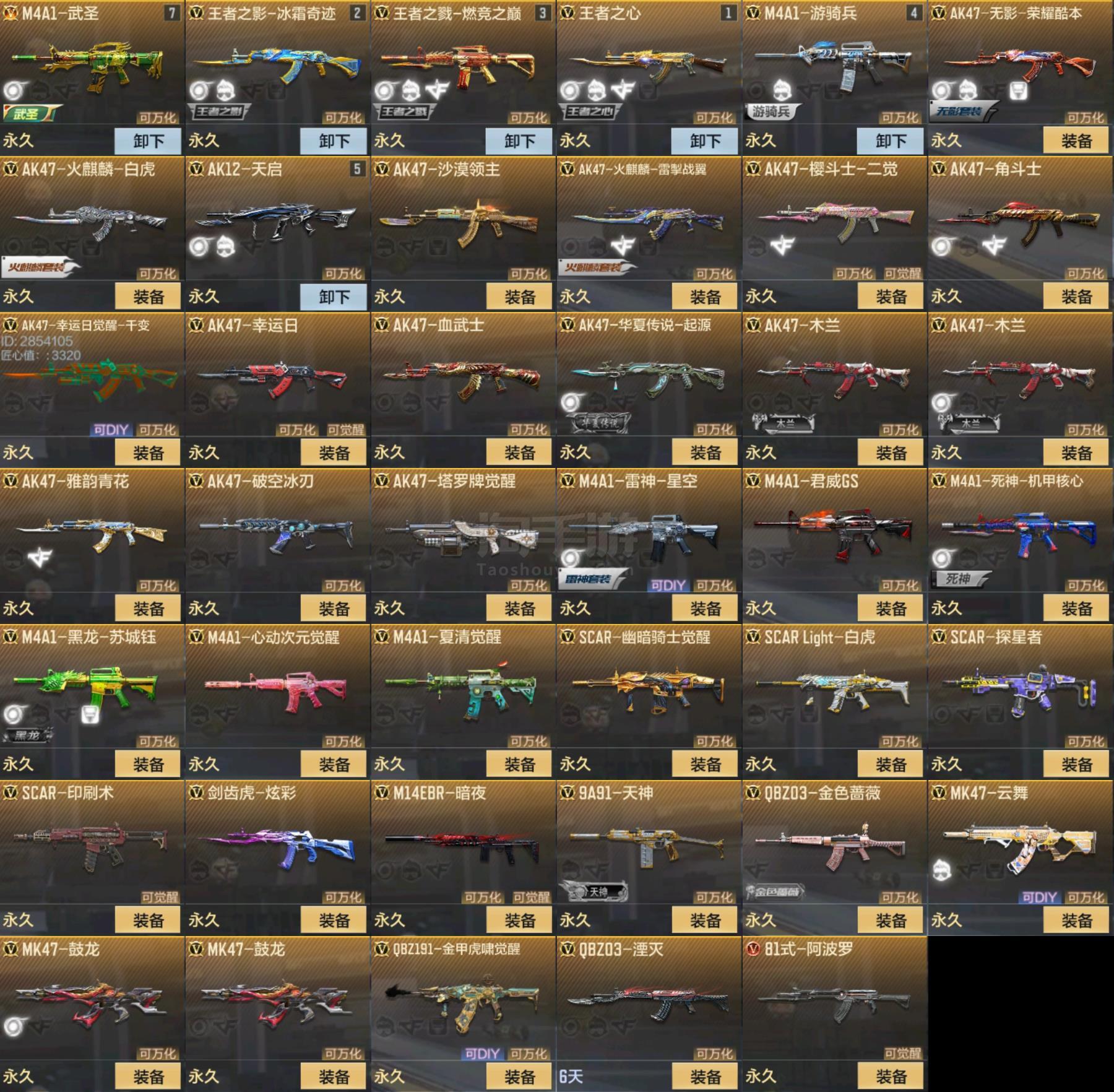 1352769_安卓Q【有二次可修改实名】V6-135V4王者【套装(仅含主武器副武器刀)】 火力竞放套 木兰套 【王者武器】 王者之戮-燃竞之巅 王者之影-冰霜奇迹 王者之心 王者之魂 【主武器】 KSG-孟获 M4A1-游骑兵 M4A1-武圣 81式-阿波罗 AK47-塔罗牌觉醒 AK47-沙漠领主 AK47-幸运日 AK47-破空冰刃 AK47-雅韵青花 AK47-木兰 AK47-血武士 A