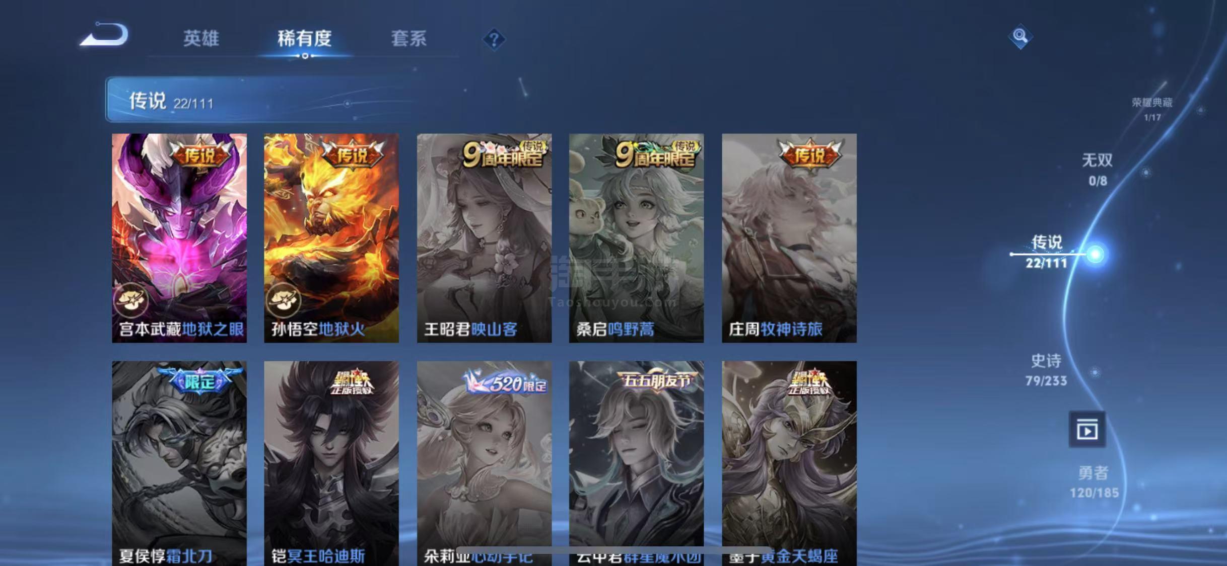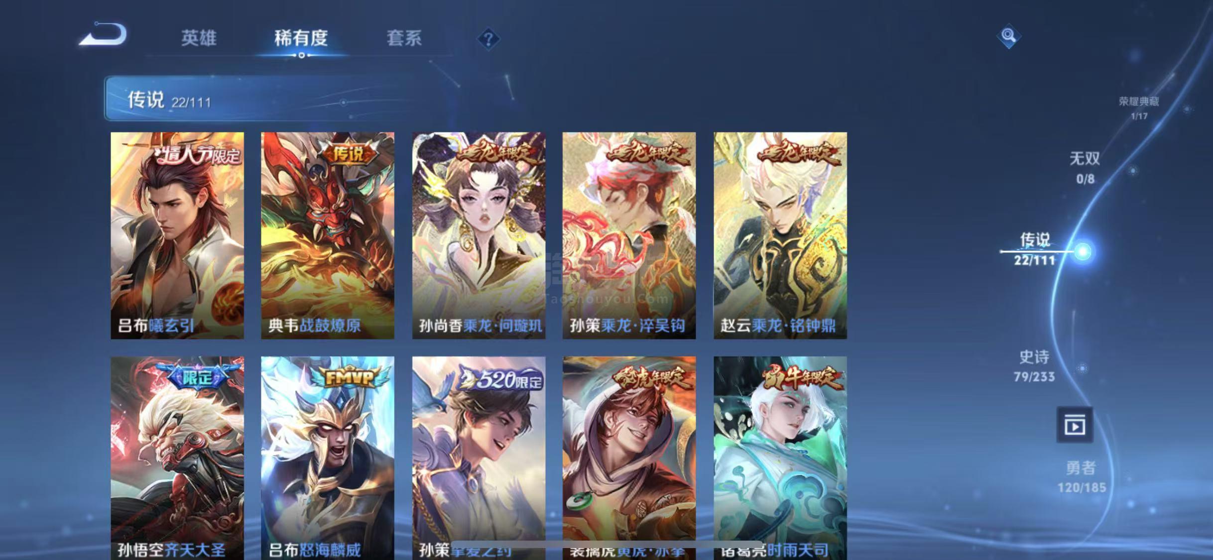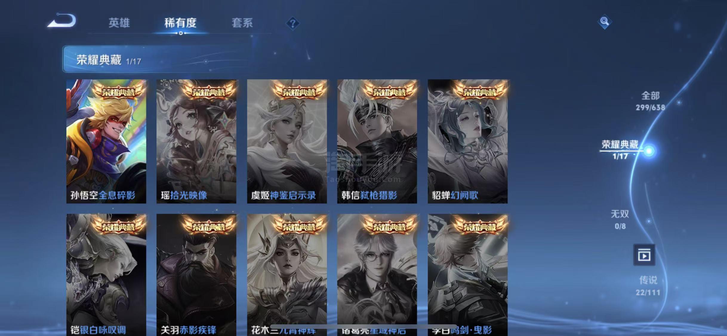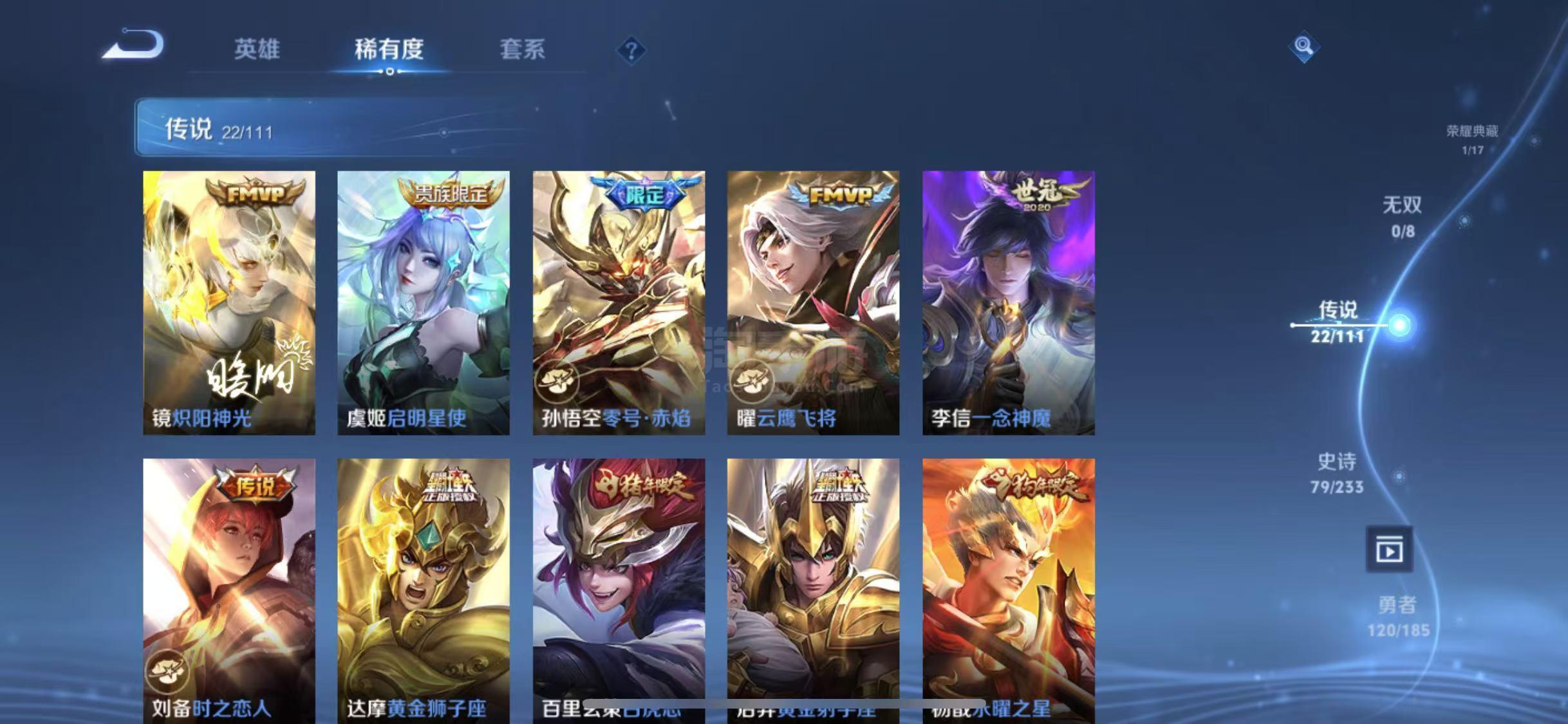 【传说皮肤】 百里玄策-白虎志 达摩-黄金狮子座 典韦-战鼓燎原 宫本武藏-地狱之眼 后羿-黄金射手座 镜-炽阳神光 吕布-怒海麟威 刘备-时之恋人 李信-一念神魔 吕布-曦玄引 裴擒虎-寅虎·赤拳 孙悟空-地狱火 孙悟空-