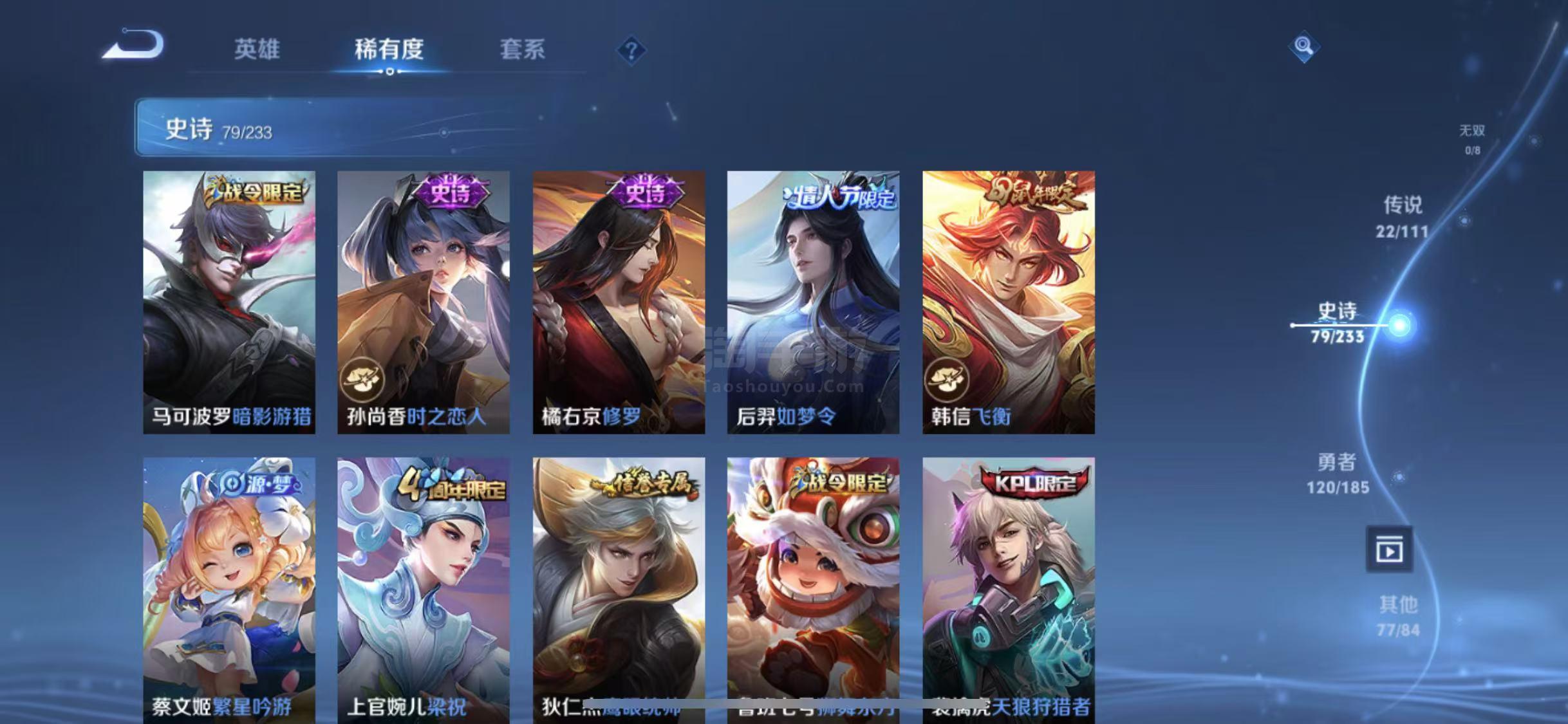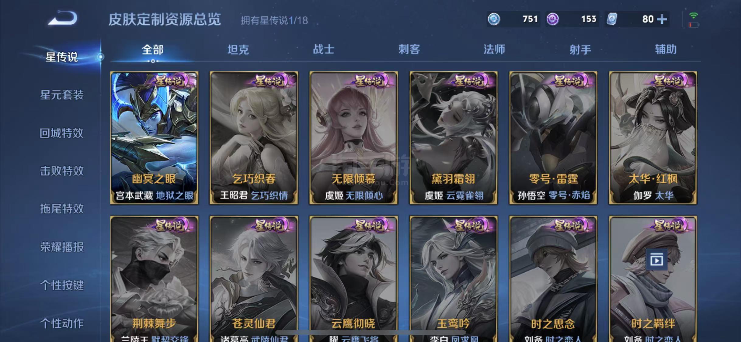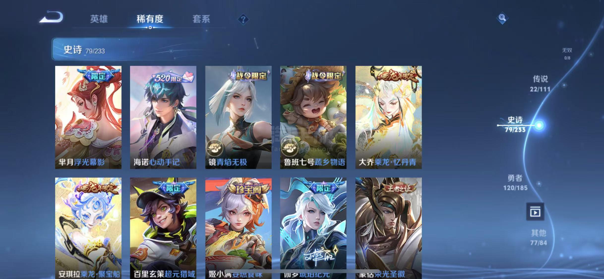 【传说皮肤】 百里玄策-白虎志 达摩-黄金狮子座 典韦-战鼓燎原 宫本武藏-地狱之眼 后羿-黄金射手座 镜-炽阳神光 吕布-怒海麟威 刘备-时之恋人 李信-一念神魔 吕布-曦玄引 裴擒虎-寅虎·赤拳 孙悟空-地狱火 孙悟空-