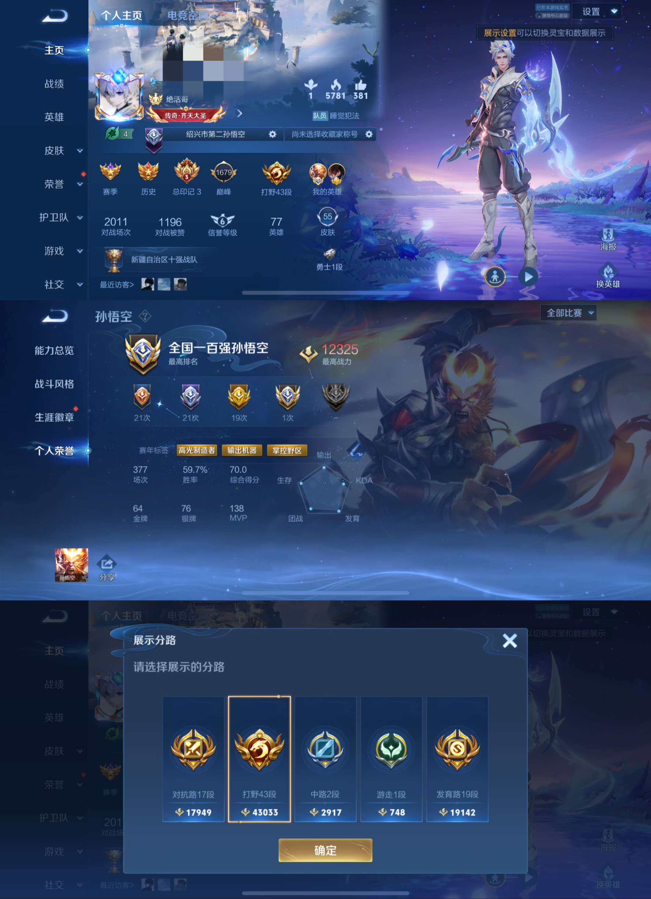 【打野43段1国服1省标3市标 国标孙悟空/国服猴子1.2万