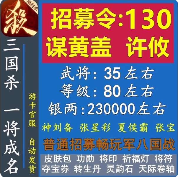 等级80级左右,20名左右永久武将,19左右招募令,50000银两,带刘备,SP星彩,多种皮肤包,将印,灵韵石等若干