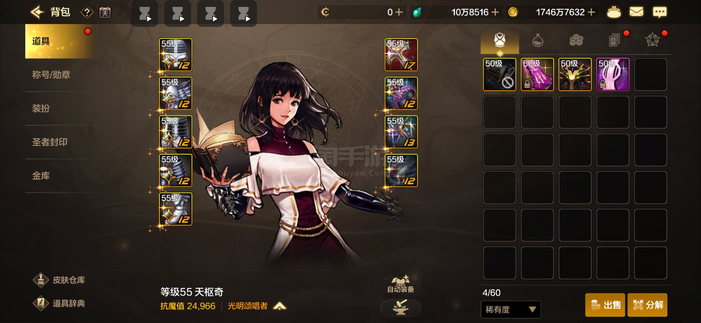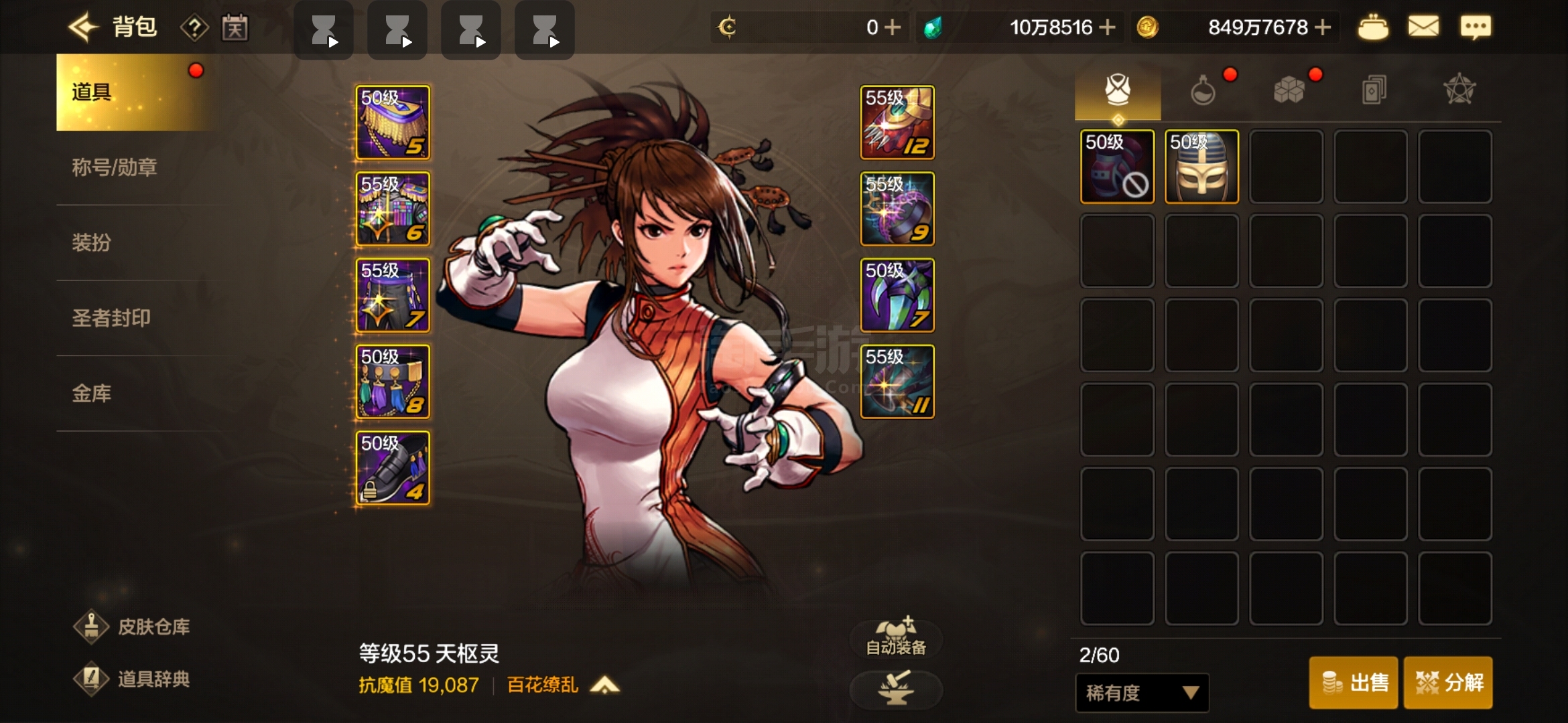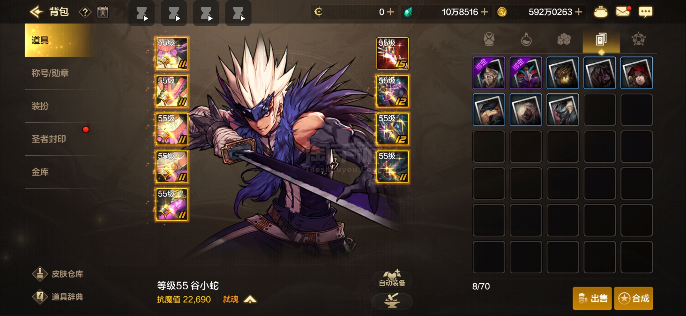 奶妈一套二期天空,背包还有一套高级时装,鬼泣光兵各一套高级时装,号上还有10W泰拉,全55级史诗套装
