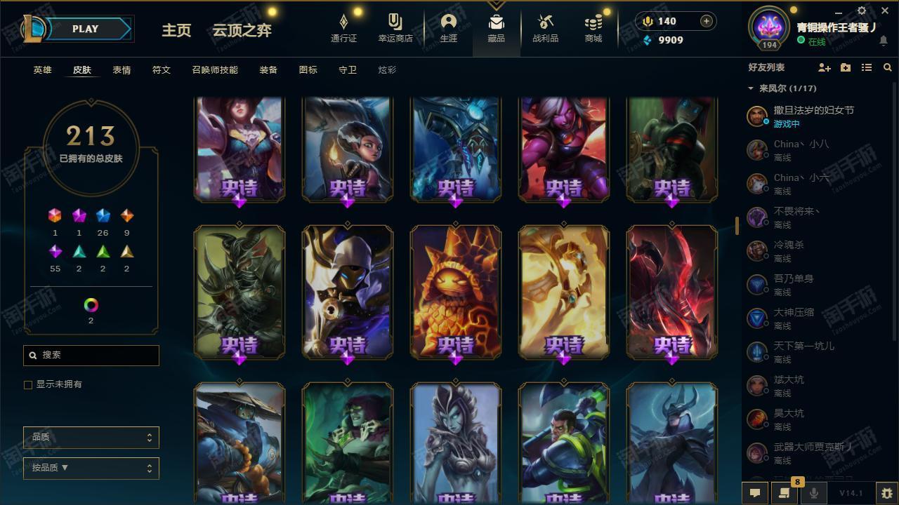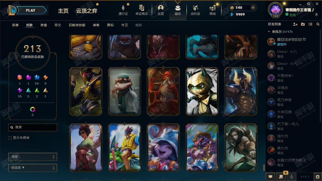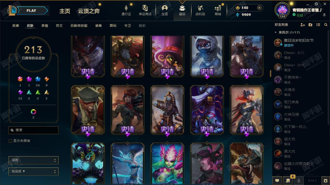 英雄联盟【端游】T991,151英雄-213皮肤-4炫彩-段位:未定级 勇者阿狸 碧玉之牙卡西
