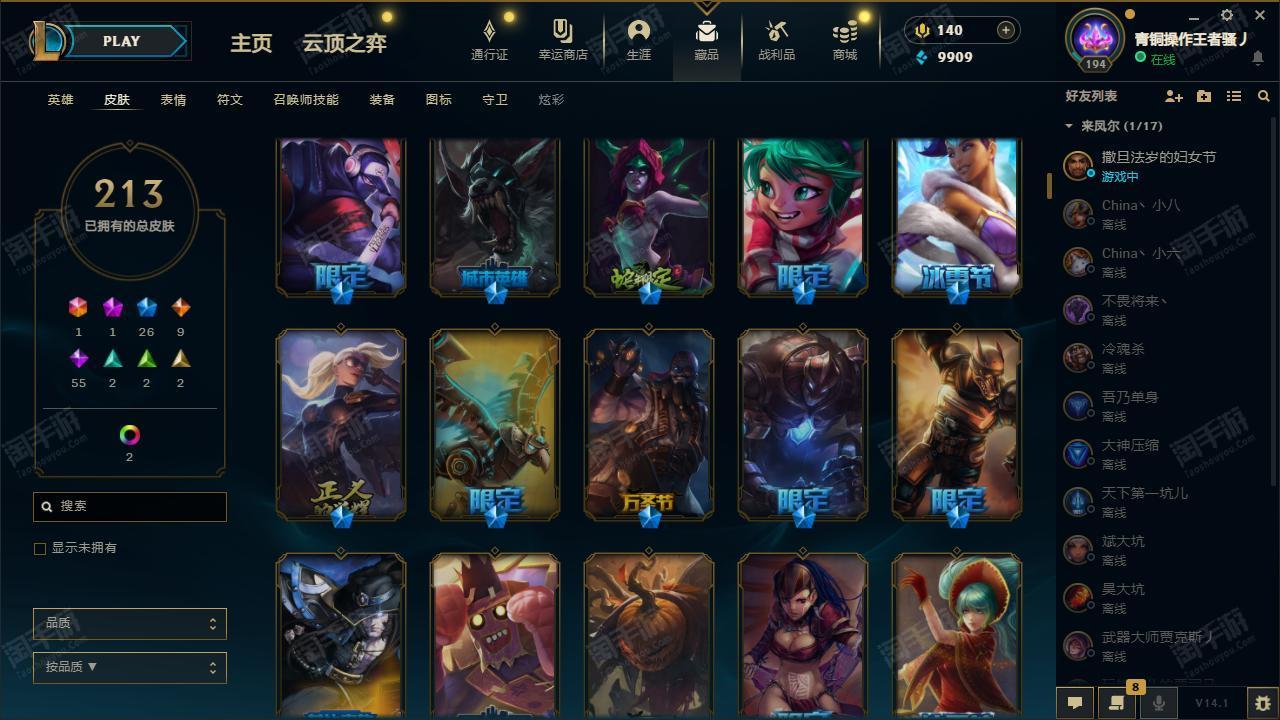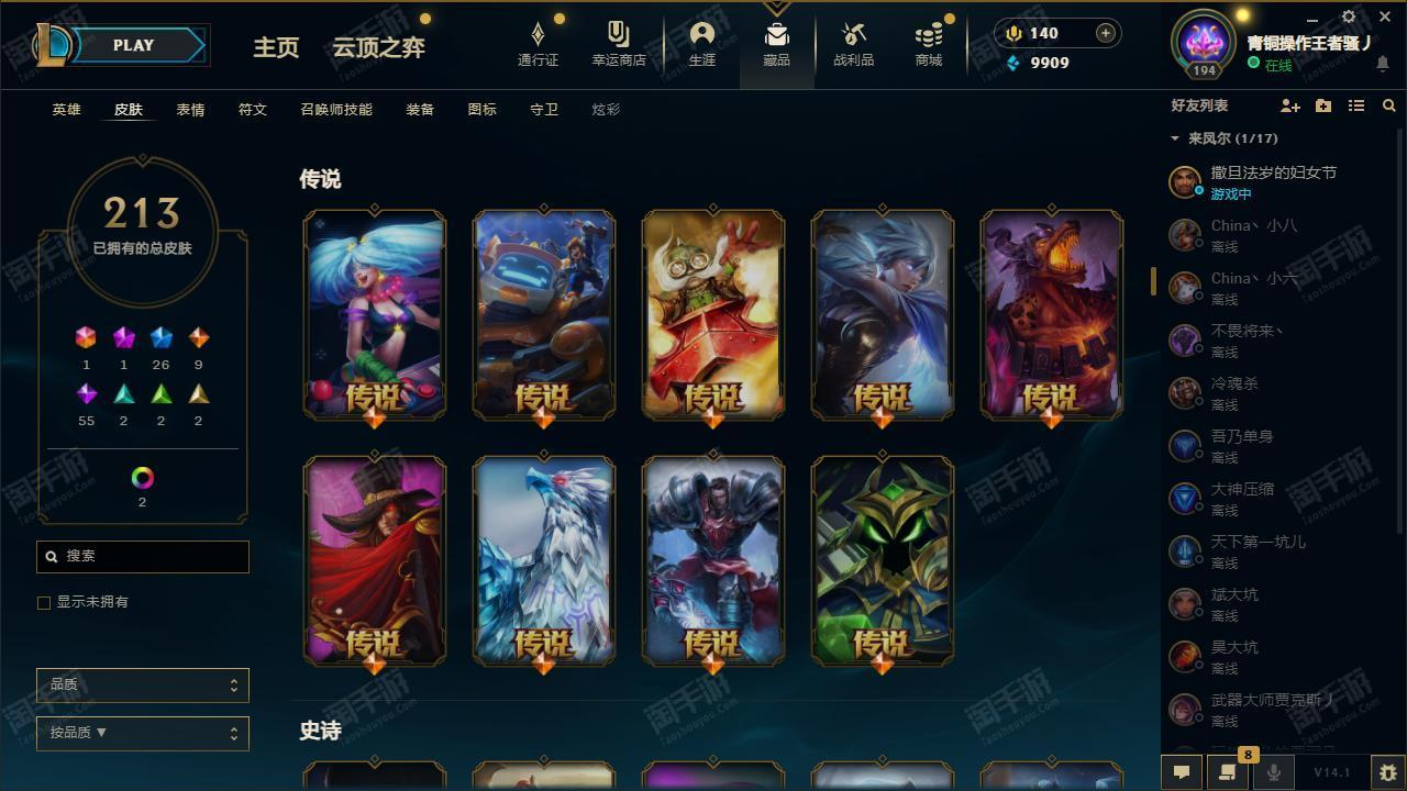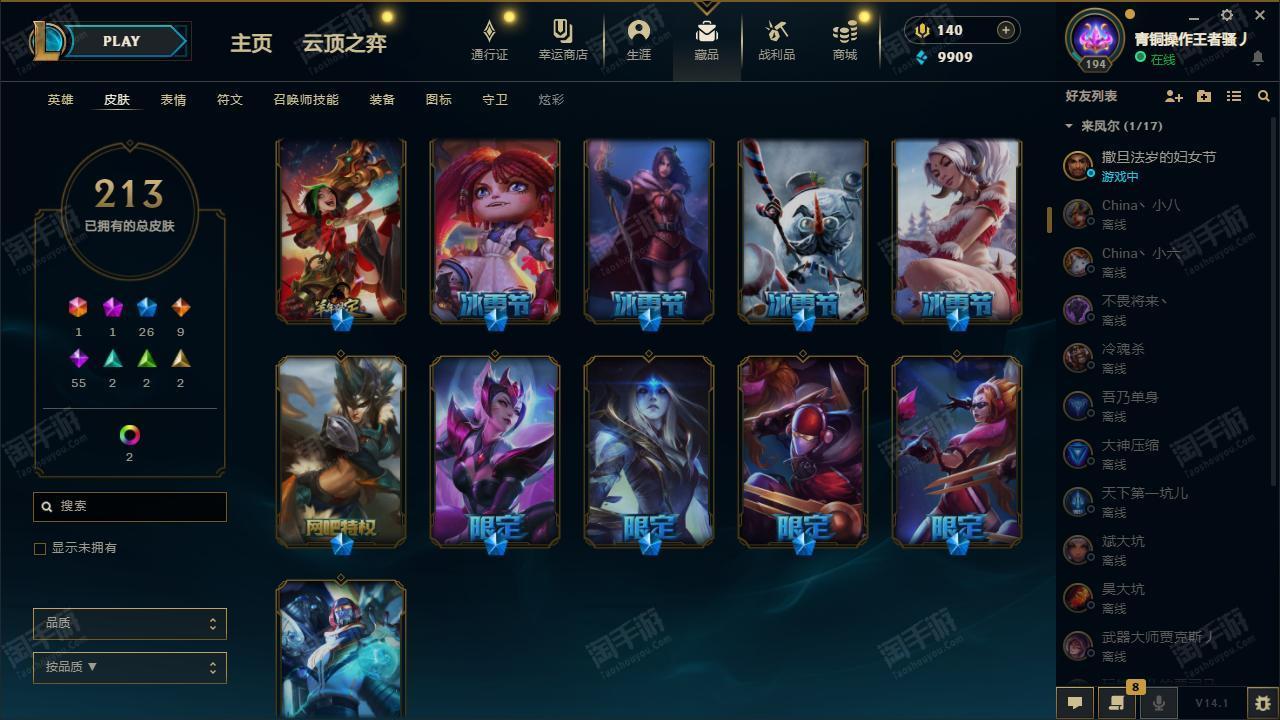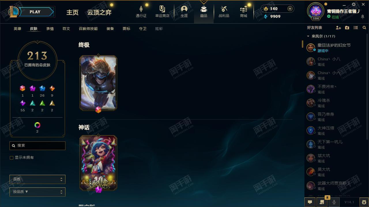 英雄联盟【端游】T991,151英雄-213皮肤-4炫彩-段位:未定级 勇者阿狸 碧玉之牙卡西