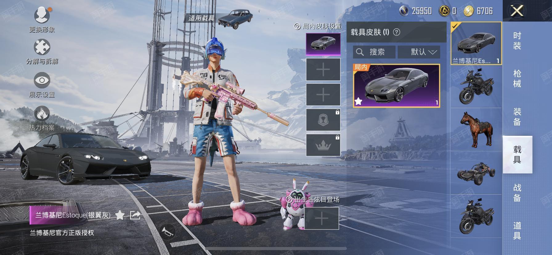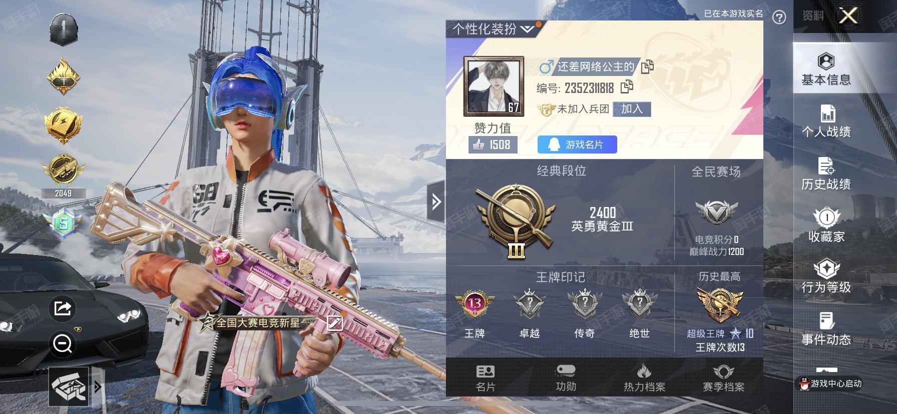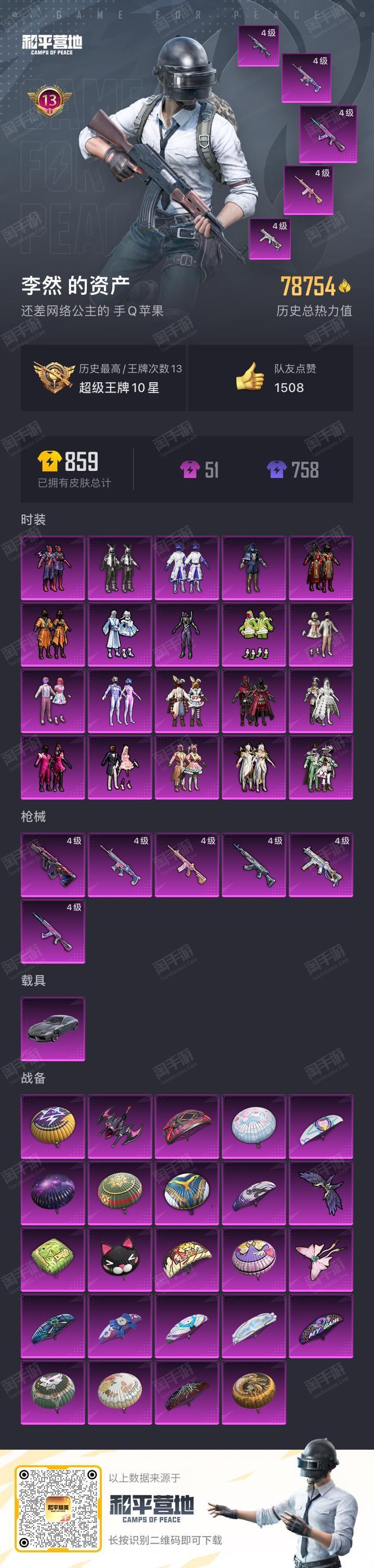 和平精英【苹果QQ】苹果 手Q-20粉装-6特效枪-1载具-78754热力值-13印记-186套装