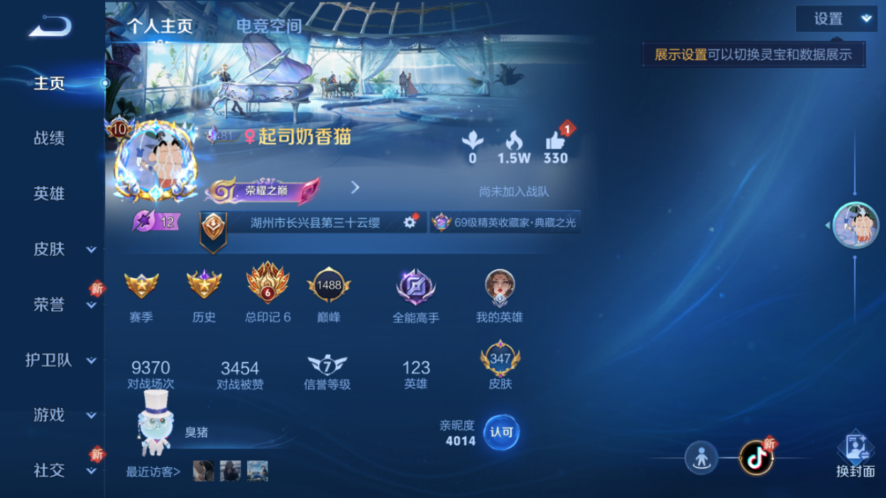[4938693]英雄数: 123 皮肤数: 347 实名: 可修改 贵族等级: V10 性别: 男号 荣耀水晶: 武则天,鸣剑·曳影,全息