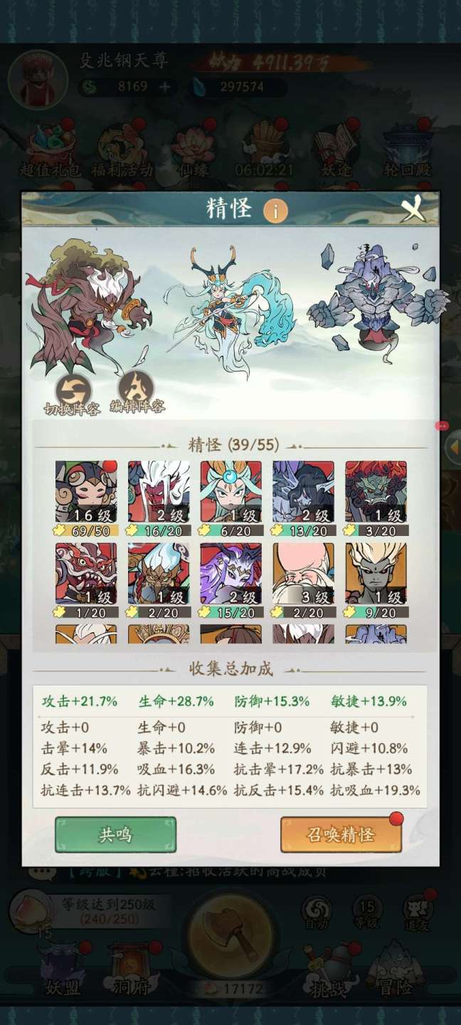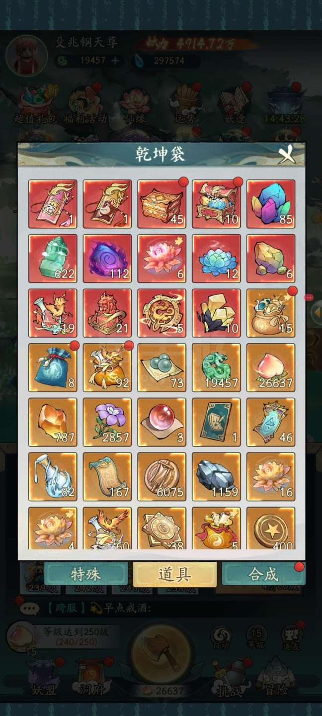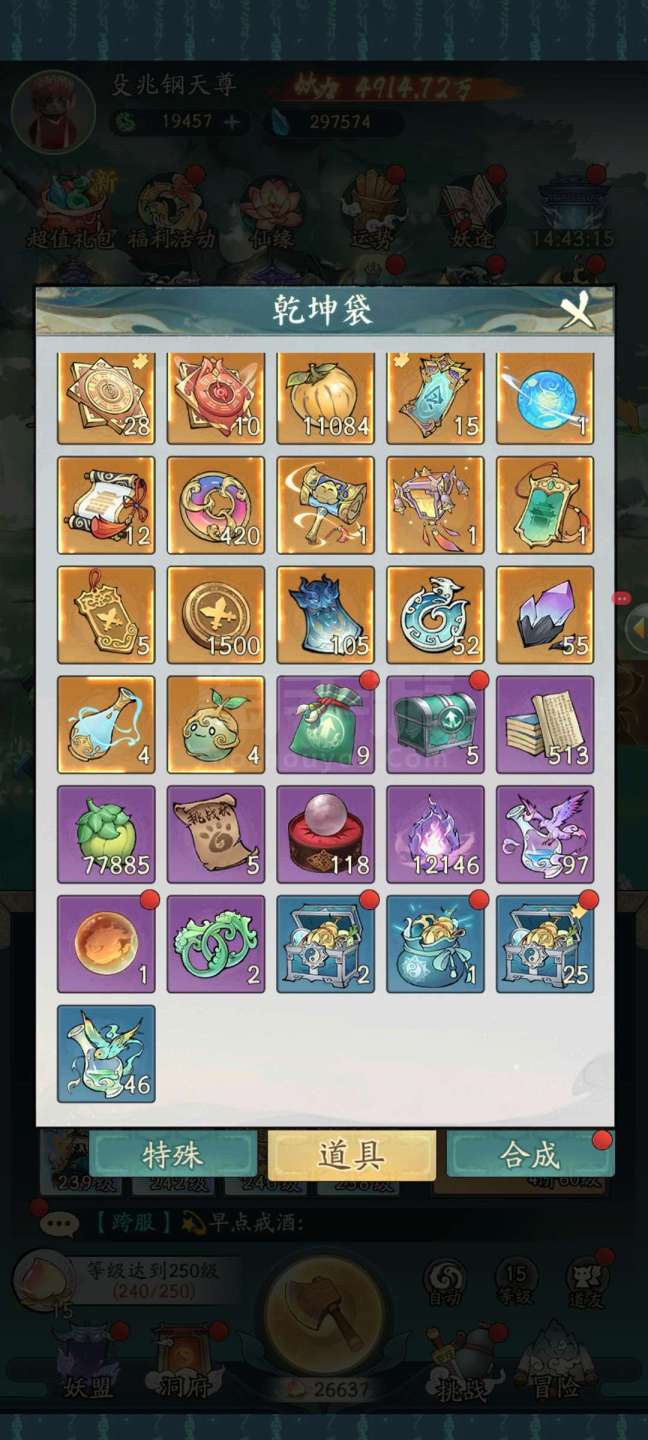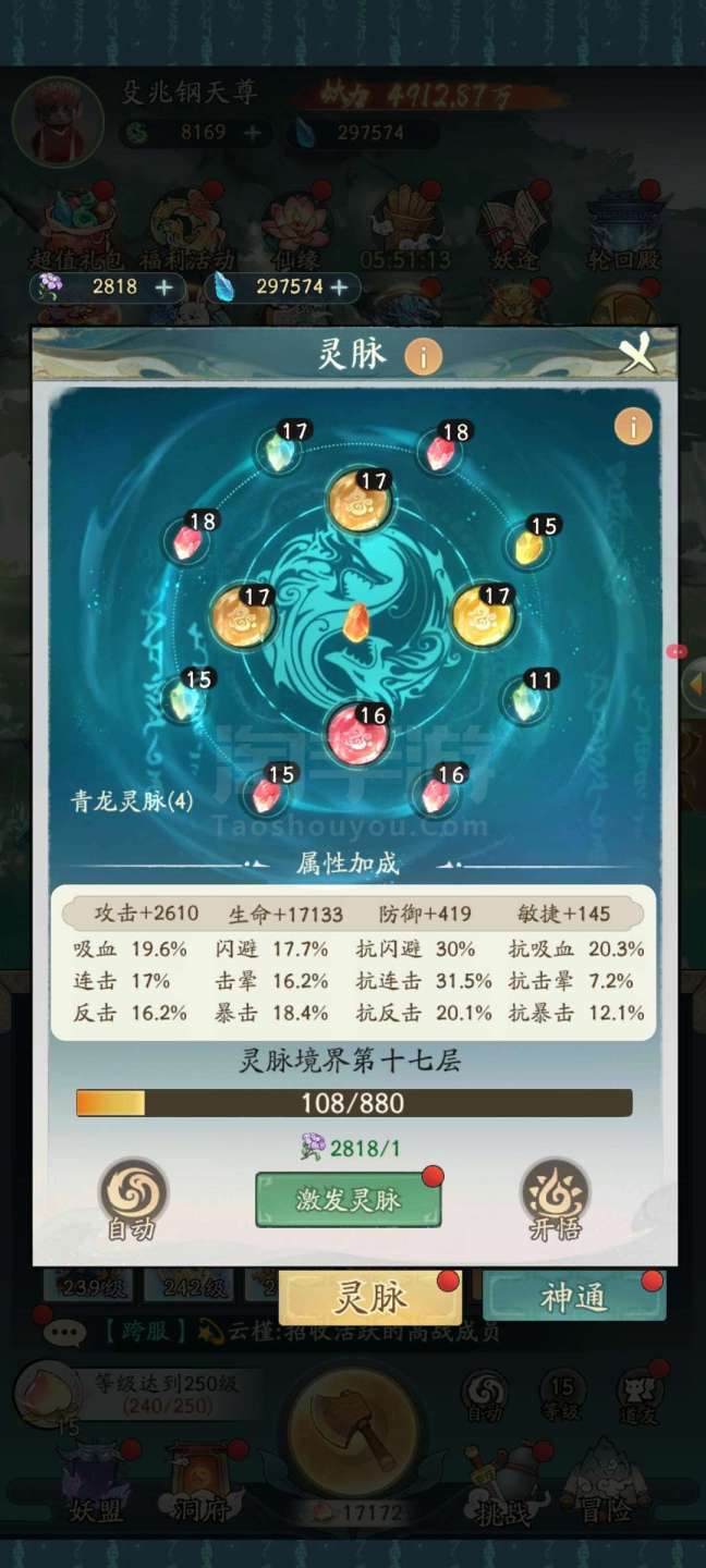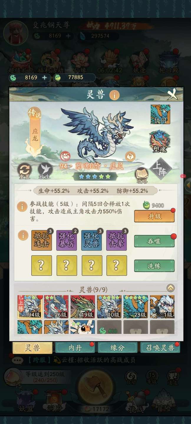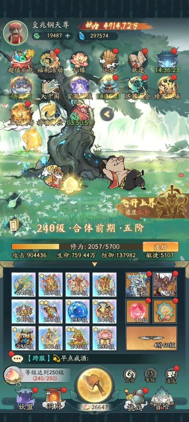 永久卡4912万战力合体前期240,精怪39只,应龙青龙孪鸟玄武都有,还有八千多的机缘,灵脉17级,