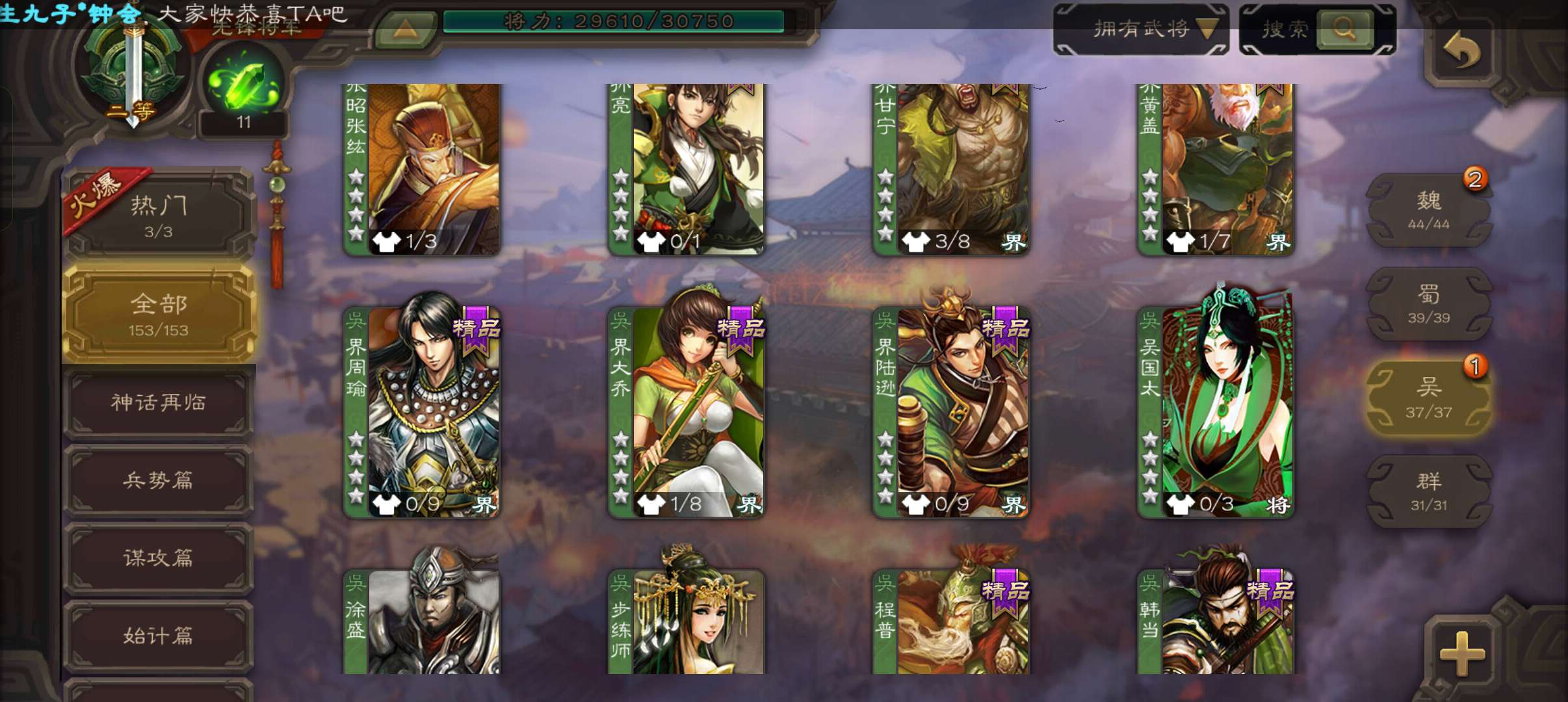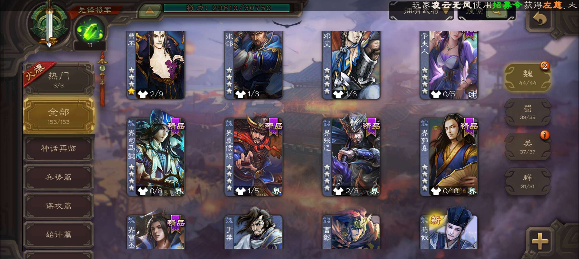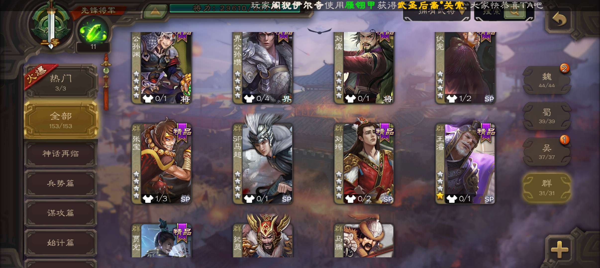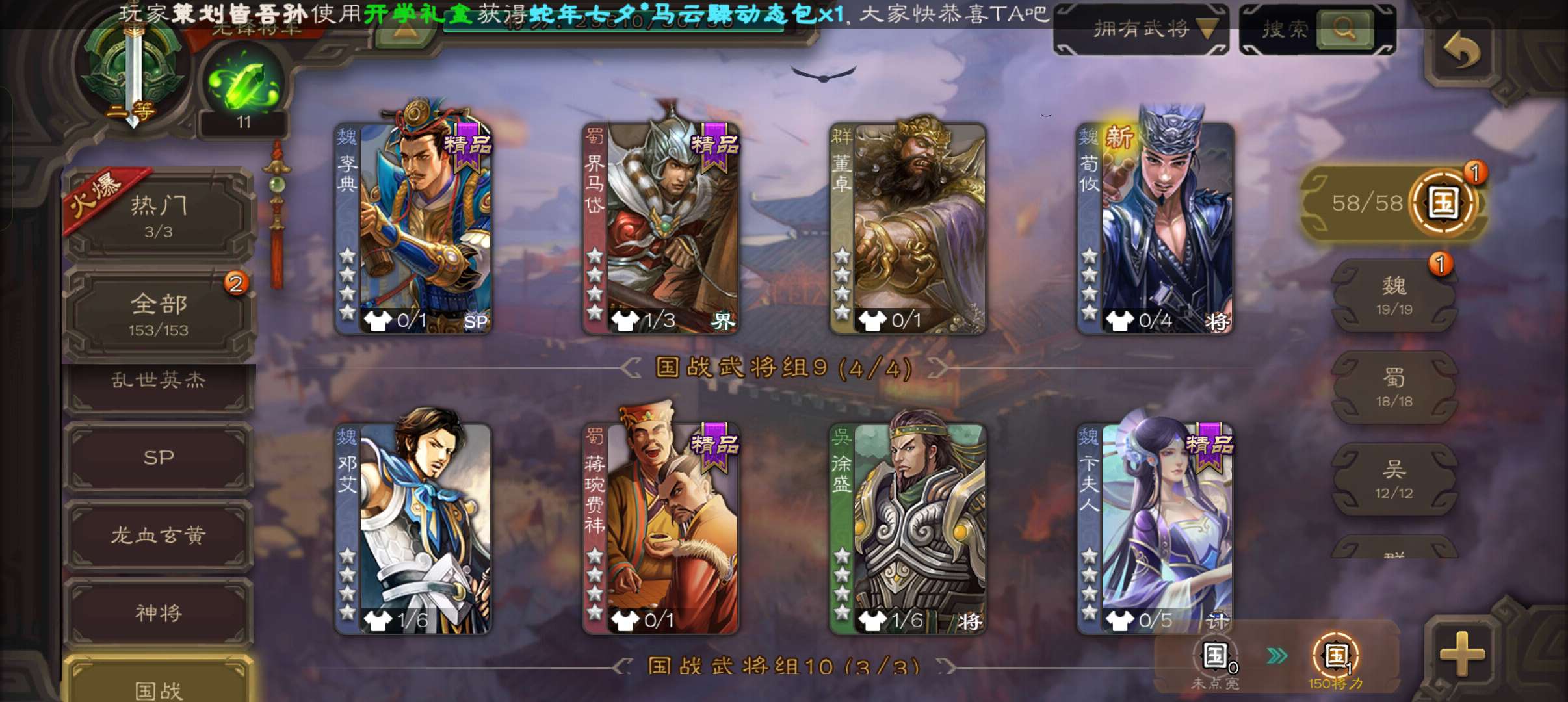 7史诗双神先锋,傅佥沙摩动态马云騄动态赵襄贺齐杨修左慈,神吕蒙神周瑜界孙休界曹植动界曹丕153将
