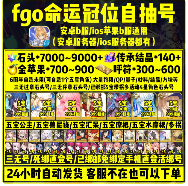 命运-冠位指定【全服通用】3千石头+3宝水汇呆+5宝水摩根5宝水伊吹+C呆水斯卡蒂黑杯六周年包
