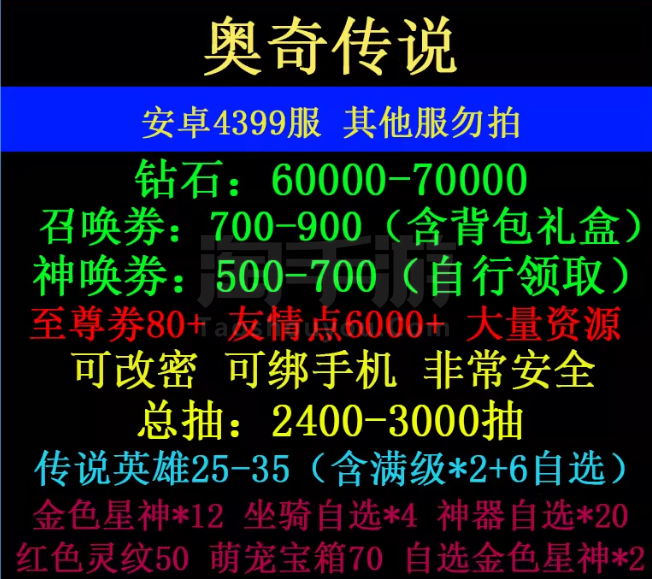 奥奇传说【安卓4399】♦单号2400+抽 必带23+传说精灵♦其中含【60000+钻 1000+总唤卷】♦