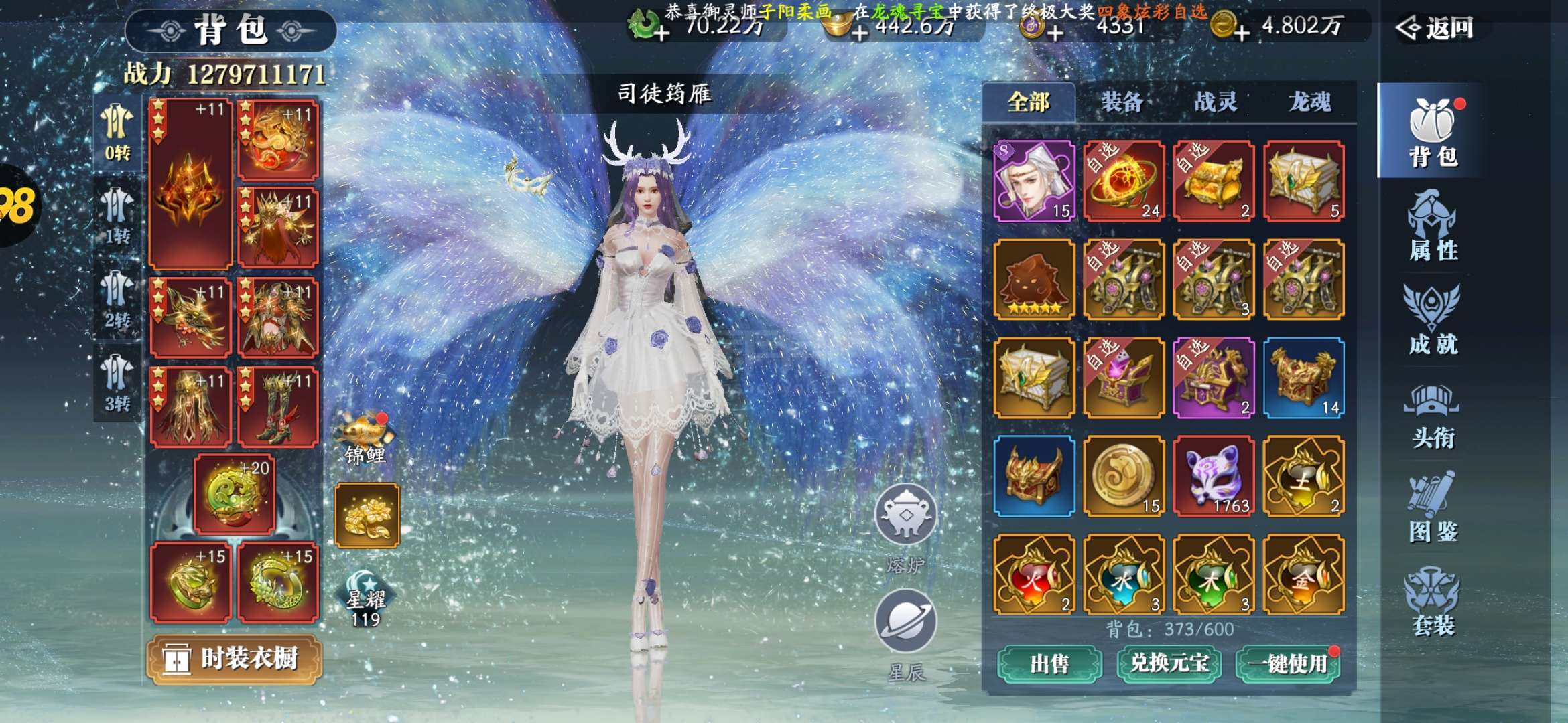 新服冠名号,八十多万宝玉,四百多万元宝,六万龙币,背包很多没开材料,有多个SP羽翼和坐骑