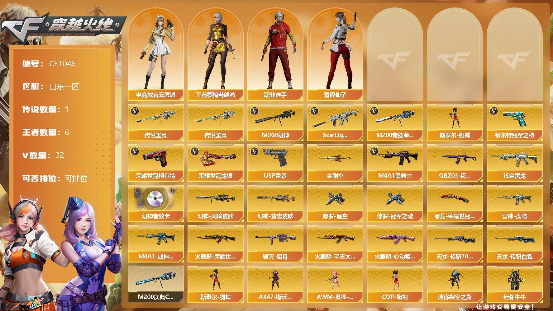1546147_河北/北部/实名可改/49V4王者【主武器类型】 M200-幻神 (宠儿+冠军之幻+N9-2022MVP+冠军之刃) QBZ03-云龙 HK417-朱雀 (音效卡) Barrett-毁灭 王者凰鸣觉醒版 M4A1-雷神 (巅峰荣耀+航星+LGD+N9) QBZ03-金色蔷薇 (巅峰荣耀) AK47-火麒麟 (大唐荣光) 黑武士-锦绣游龙 AN94-超新星 超新星-热带奇洋 烈龙-云