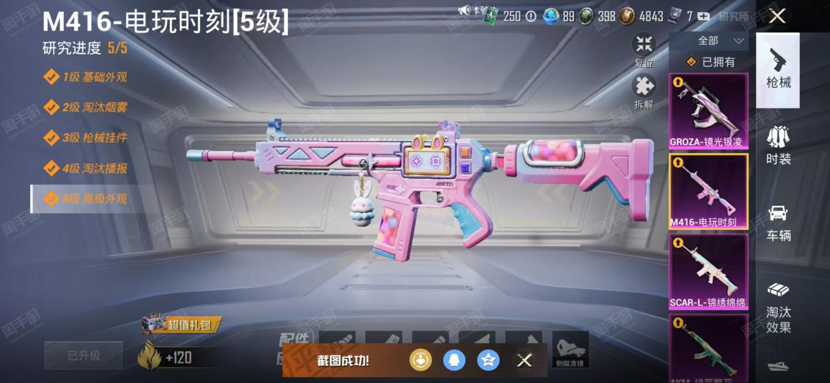 【特效枪等级】:AKM-绿萝繁花(五级AKM-绿萝繁花),AKM-白勺歌姬(五级AKM-白勺歌姬),SCAR-L-锦绣绵绵(五级SCAR-L-锦绣绵绵),M416-五爪金龙(七级M416-五爪金龙),M416-电玩时刻(五级M416-电玩时刻),GROZA-镜光银