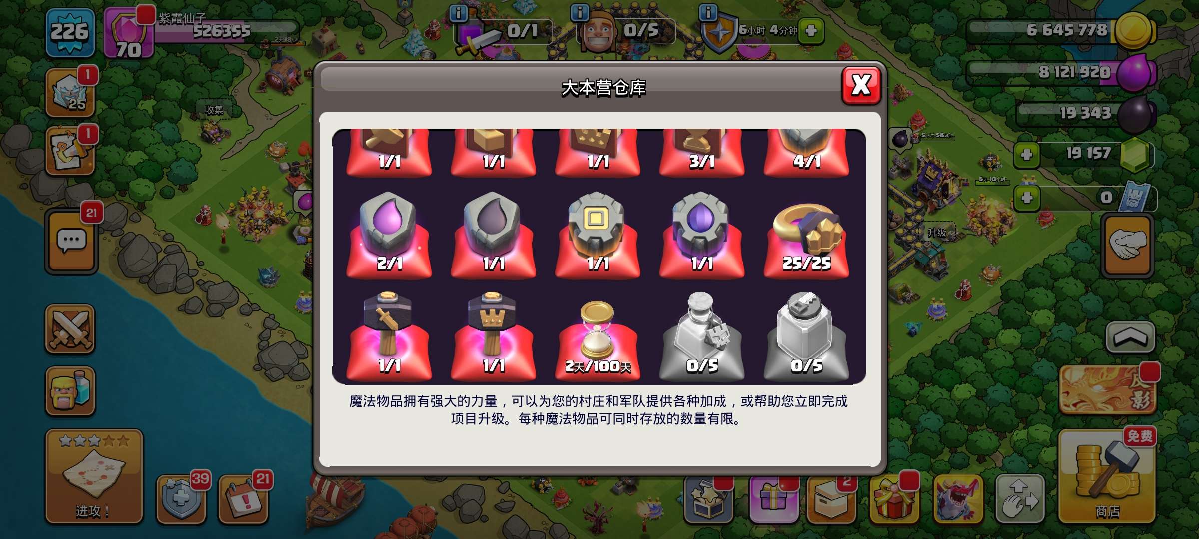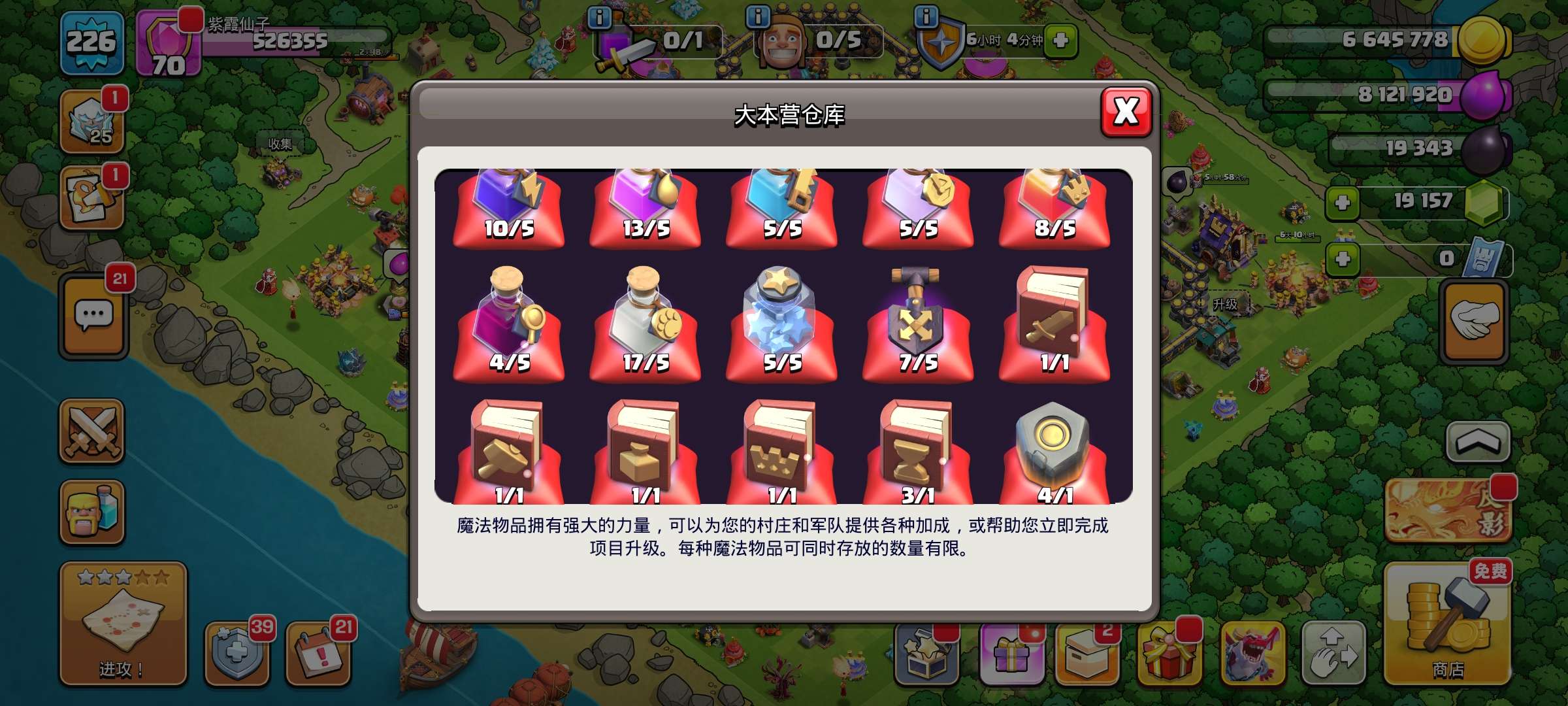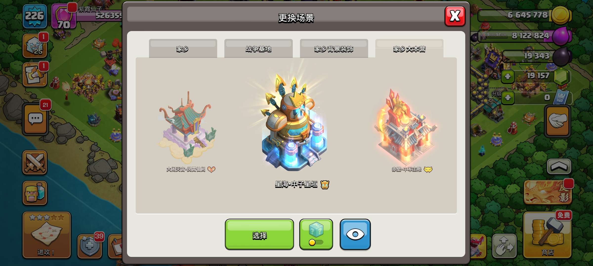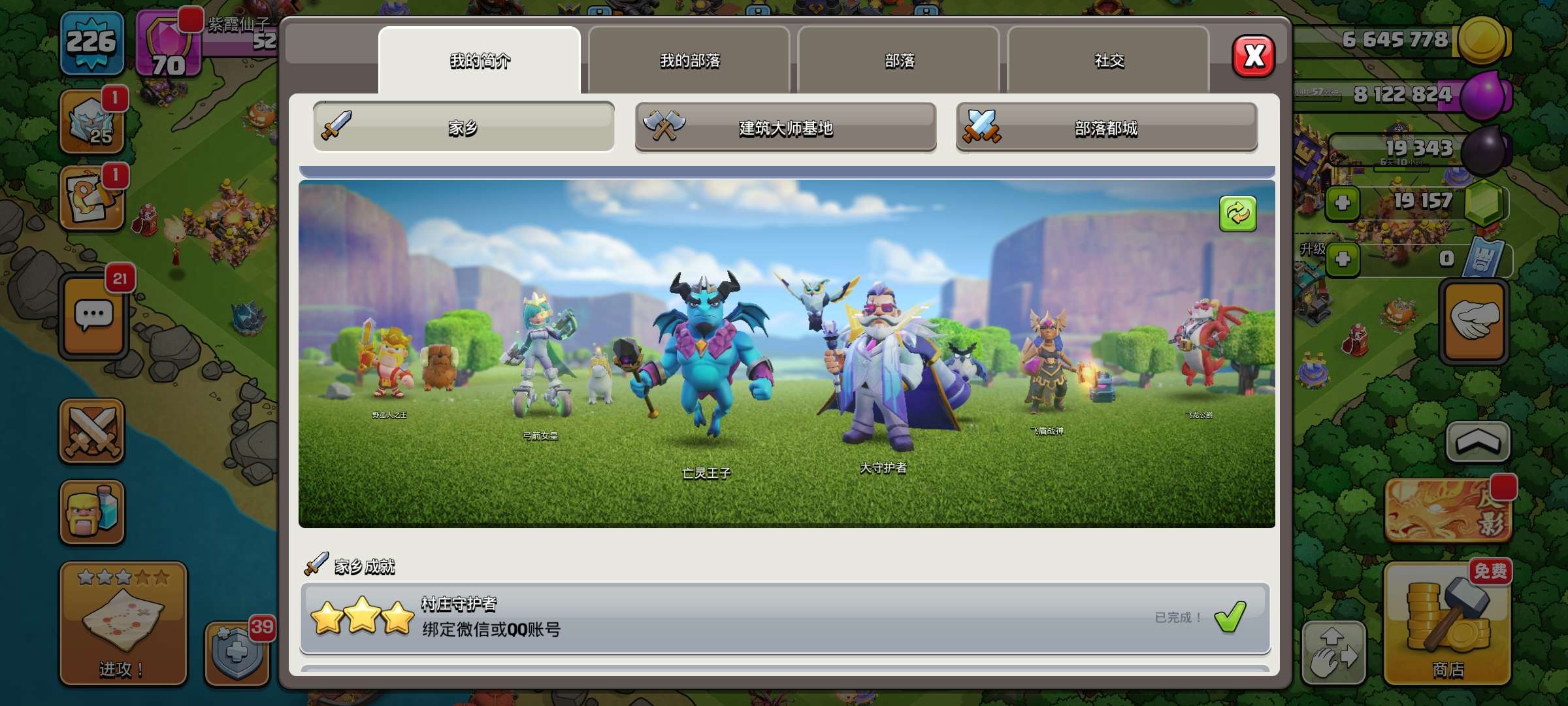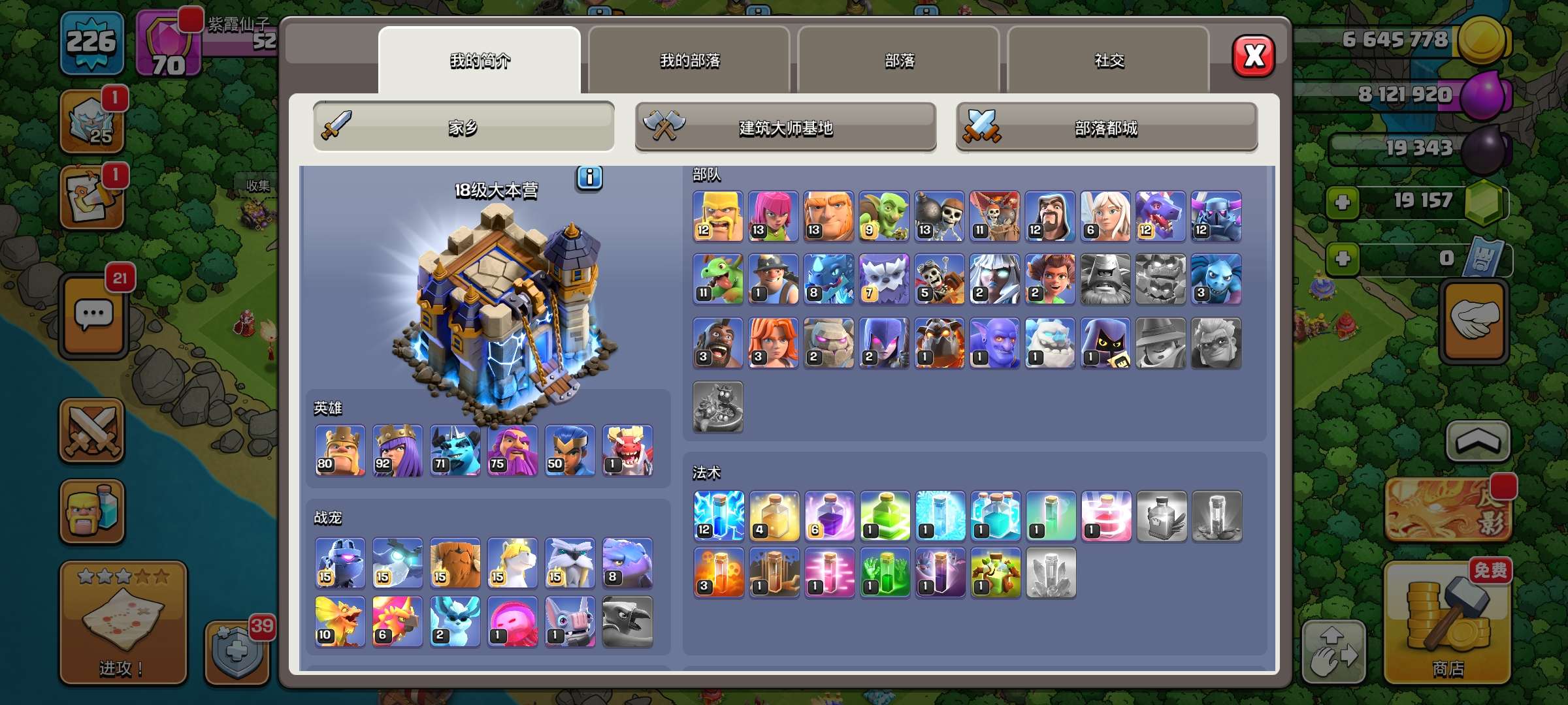 部落冲突国服18本带皮肤,5个建筑工人,17本城墙全升满,高兵种,高级英雄各种英雄皮肤,19000多