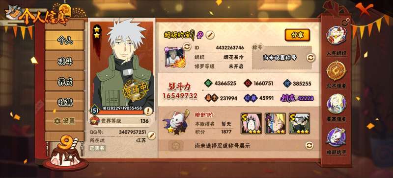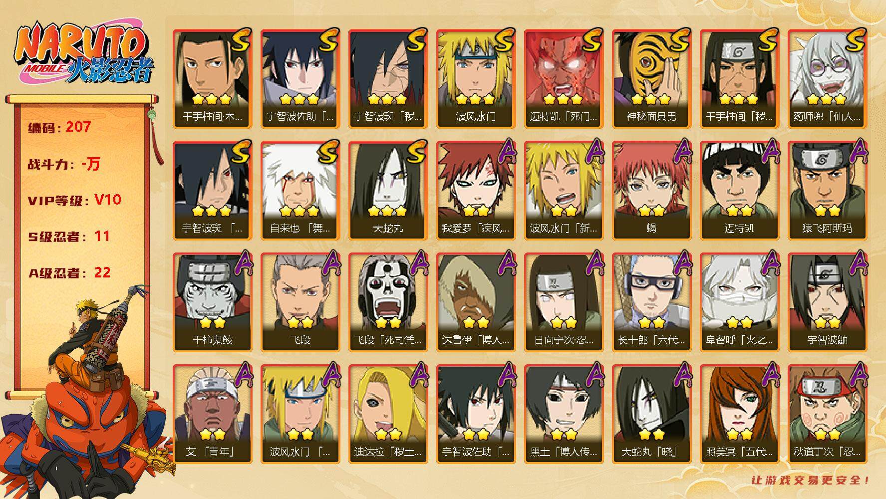 【高战力号1320万】安卓Q区2700-2750区,Lv148,V11特权,21 S【须佐止水、百战佩恩、忍战艾、红夜面具男、白面具、纲手、大蛇丸、九喇嘛、永恒佐助、舞杰自来也、死门凯、百战水门、猿飞日斩、秽土日斩、秽土扉间、秽土扉间、创立柱间、秽土斑、创立斑、解斑、秽土长门】A忍【青年艾、博人传达鲁伊、骨架、鹰佐、青水、忍战李、最终章雏田、新春水门、漂泊小南、新春小南、博人传长十郎、博人传黑土】