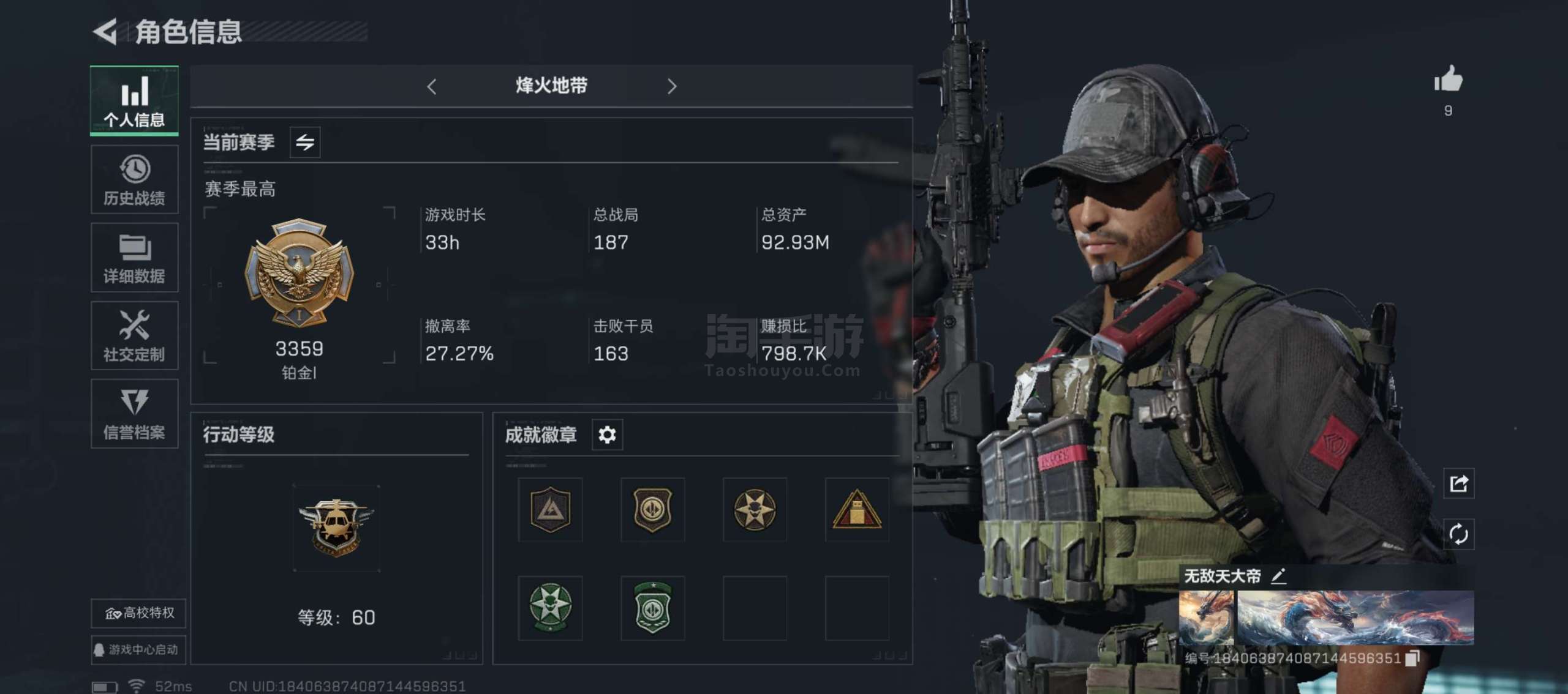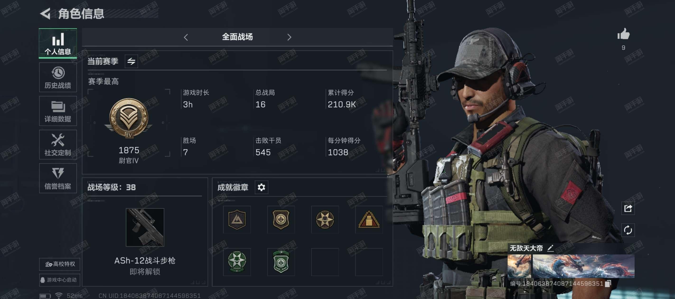 三角洲行动【安卓QQ】92m账号,只有两把绑定武器3x3体验卡还在,一颗非洲之心大战场拿过天才少年徽章