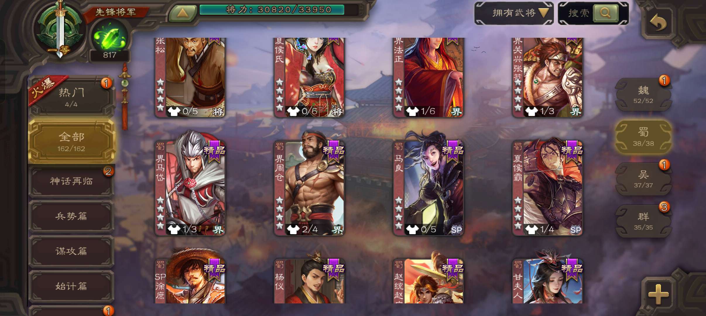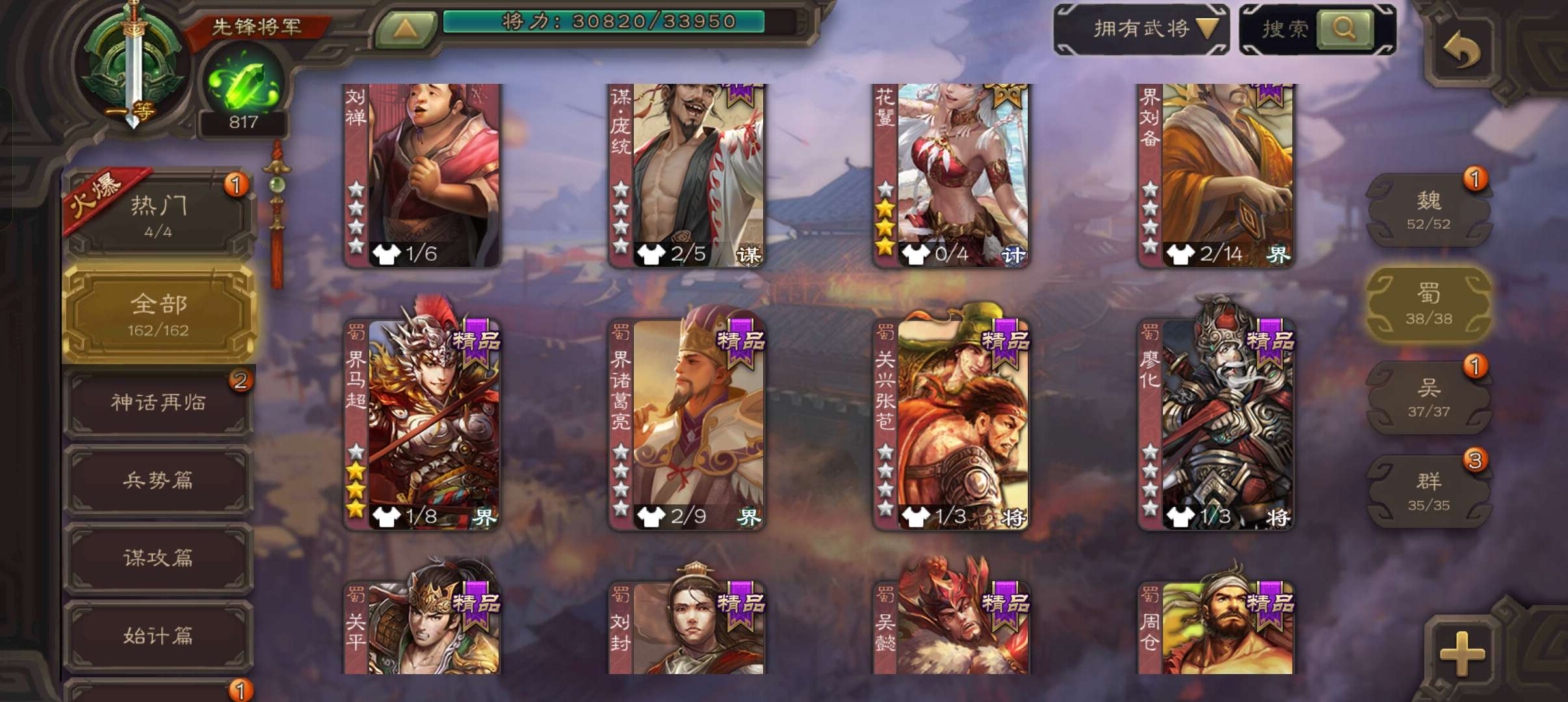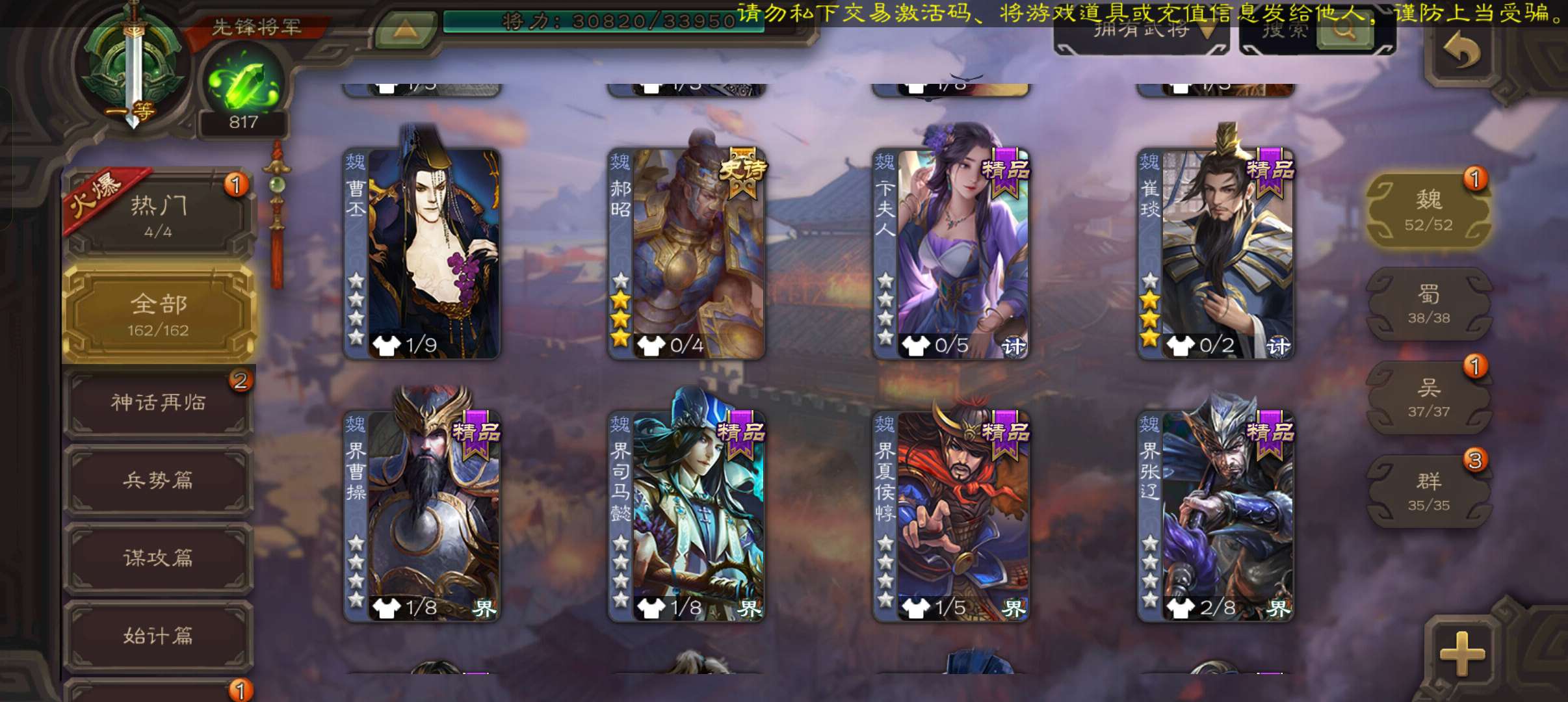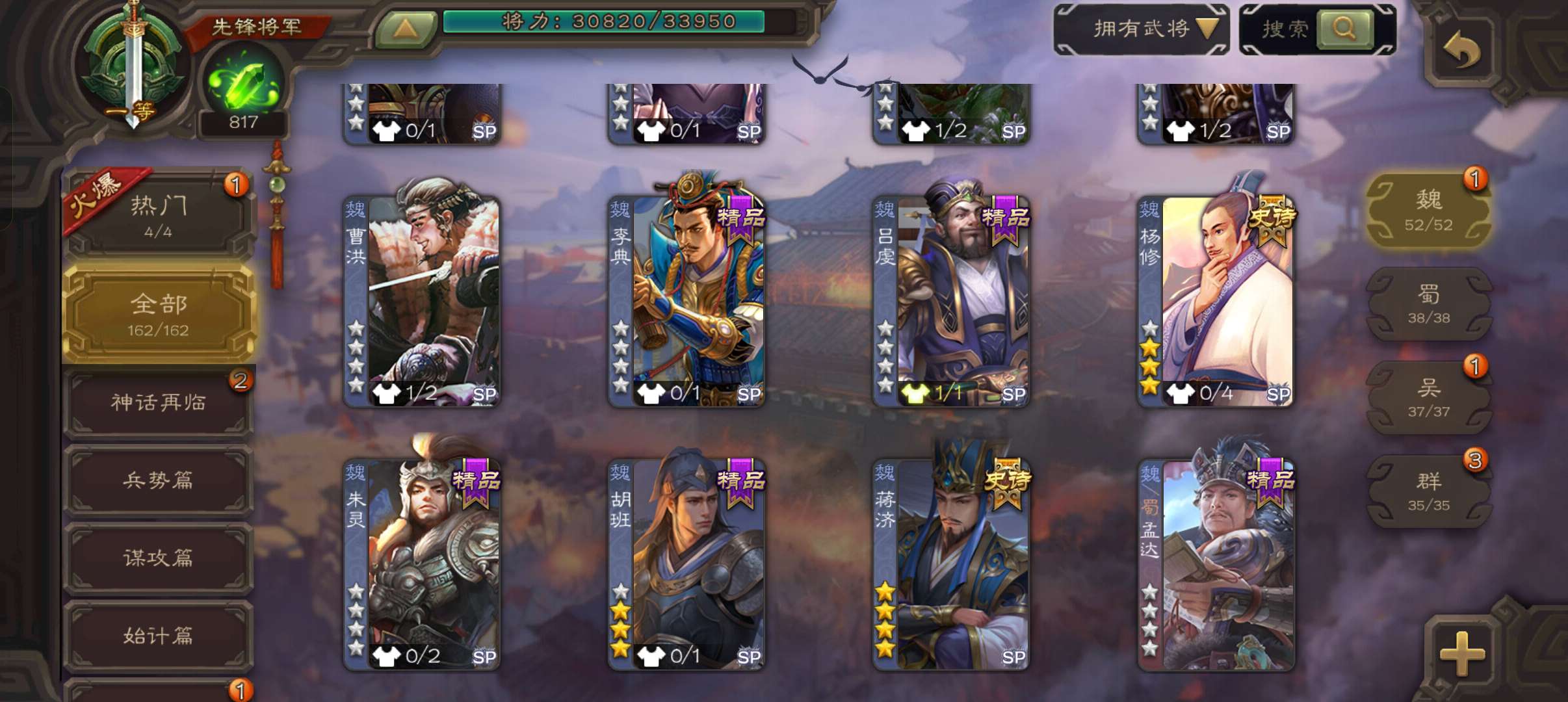 8史诗双神一等先锋,玉龙蒋济界钟会郝昭花鬘嵇康贺齐杨修左慈,神周瑜神吕蒙崔琰甘夫人界曹植162将