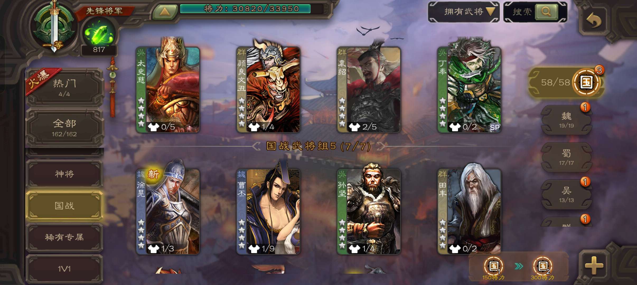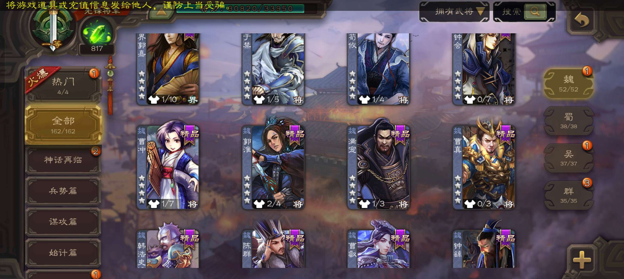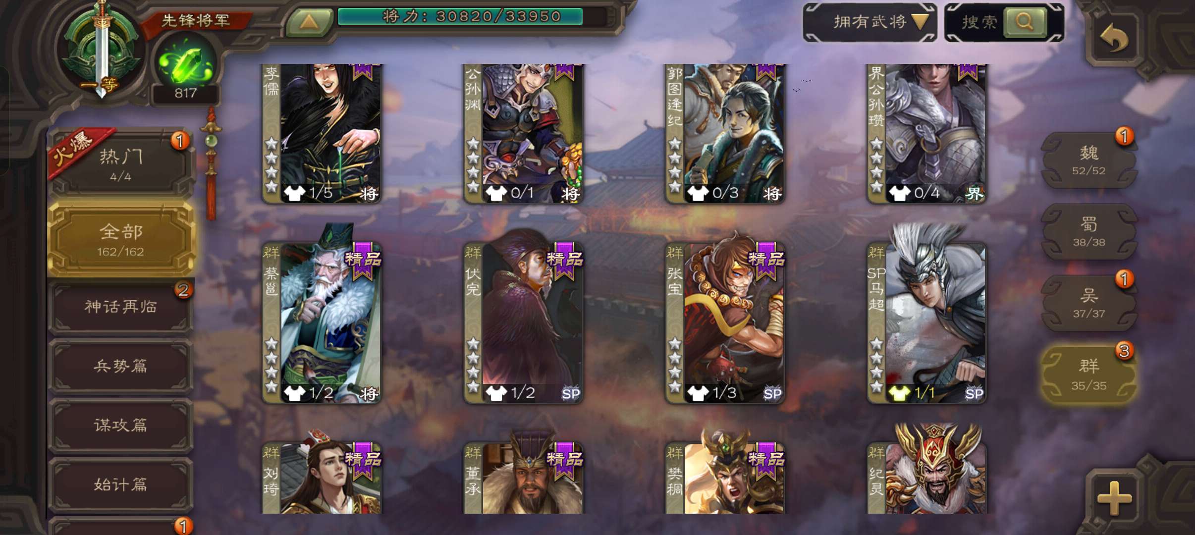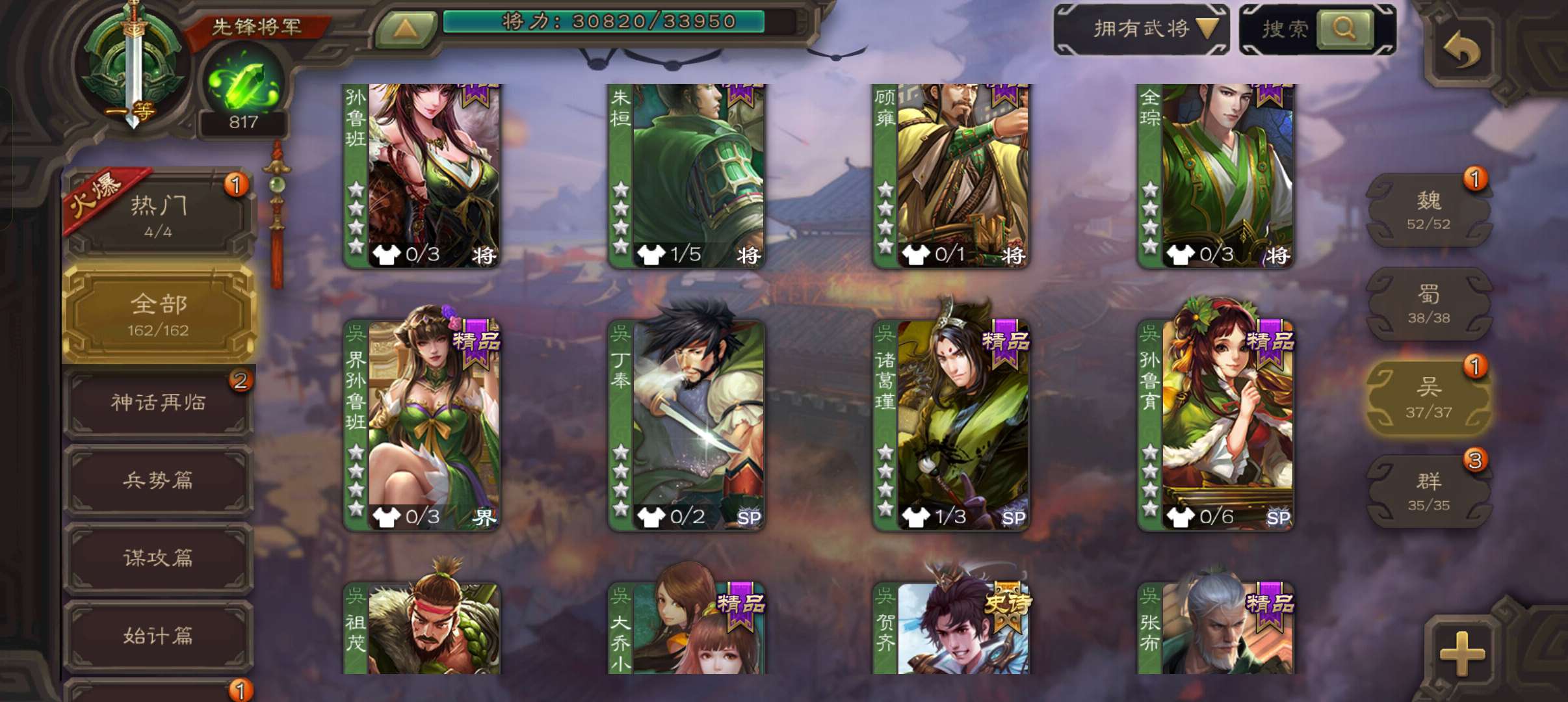 8史诗双神一等先锋,玉龙蒋济界钟会郝昭花鬘嵇康贺齐杨修左慈,神周瑜神吕蒙崔琰甘夫人界曹植162将