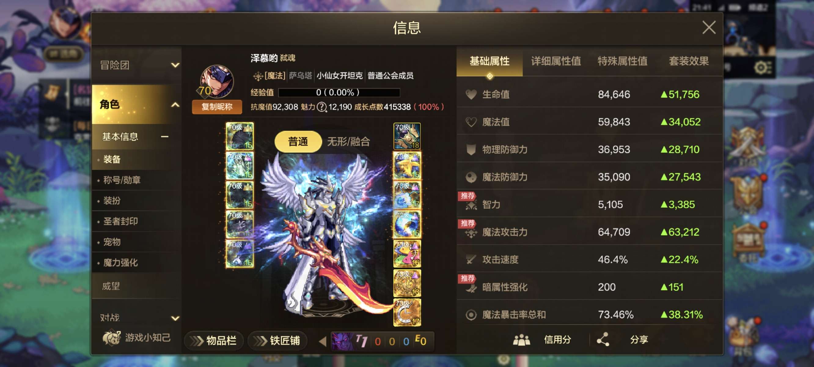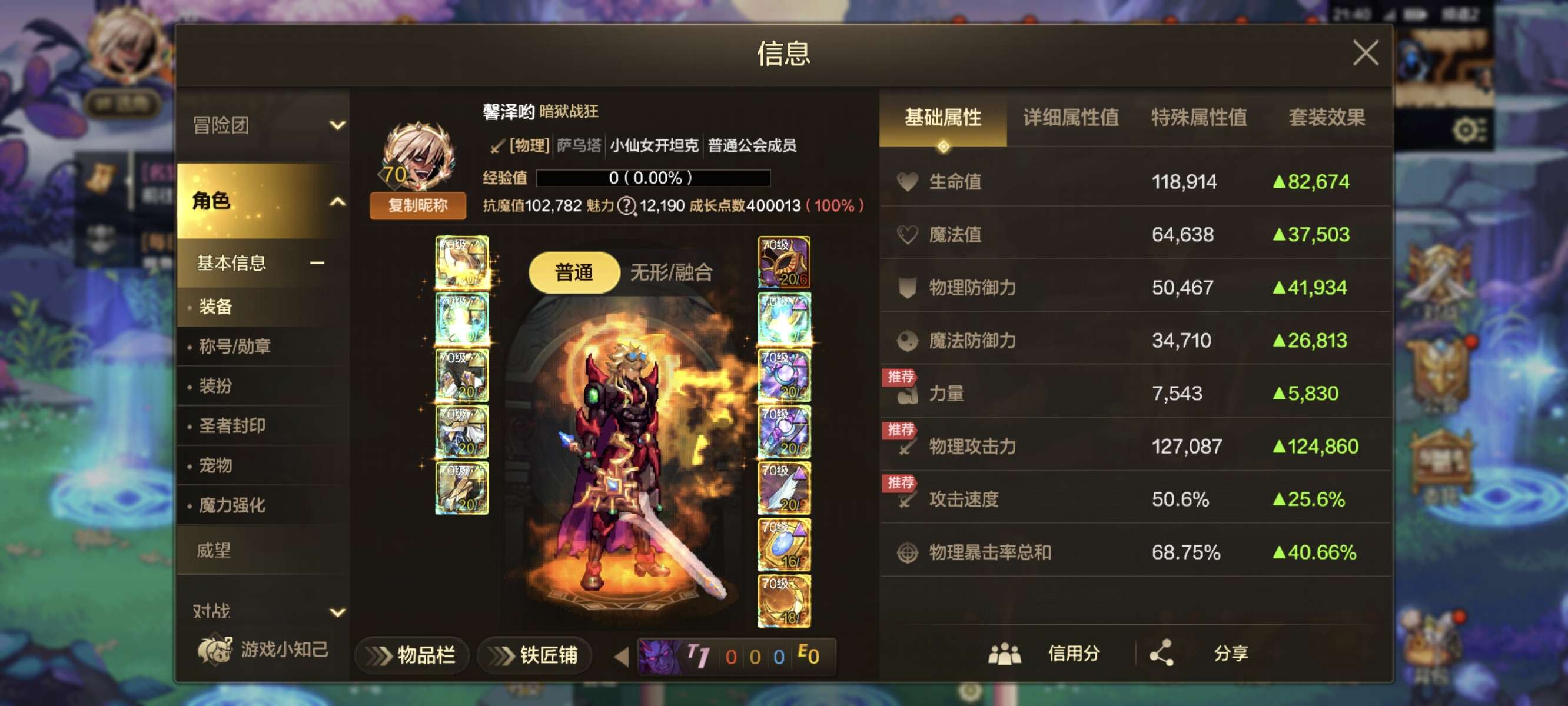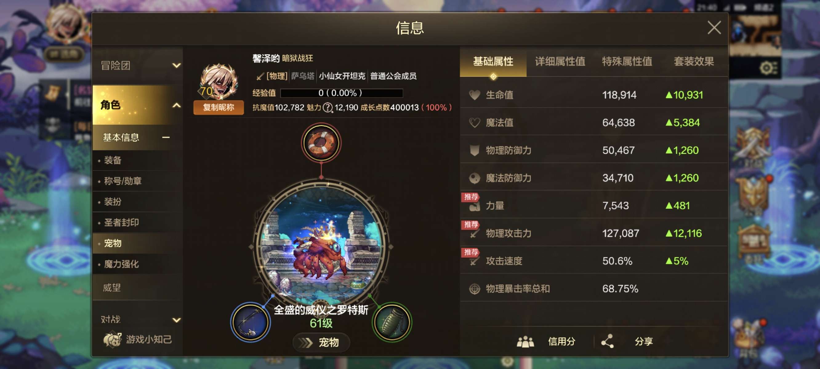 抗魔值102782,狂战、鬼泣天空套,超凡,无形,白金称号,灿烂光环。ss宠物和宠物装备齐全。