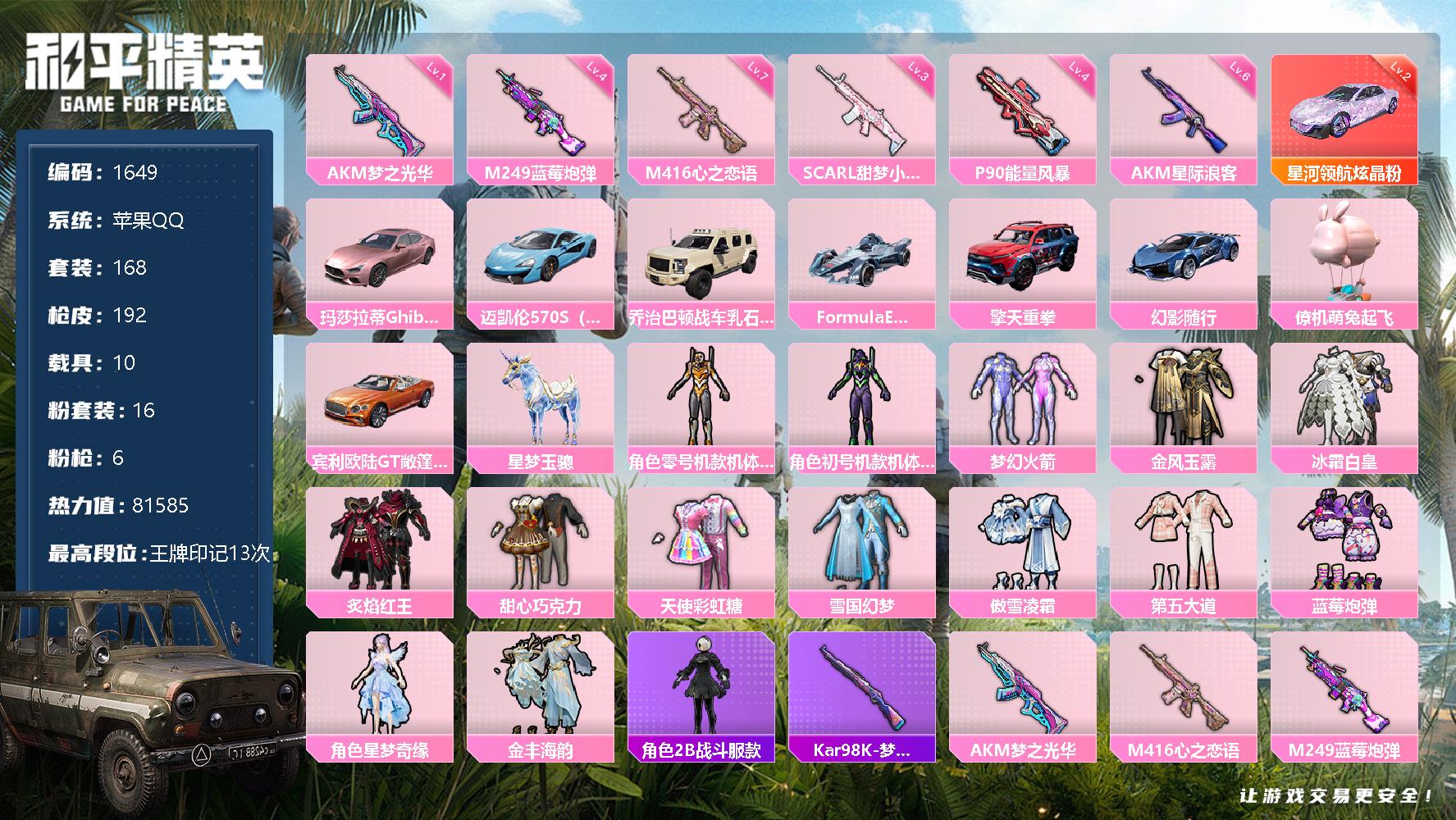 苹果Q-113254热力值 13王牌印记 历史无敌战神 270套装 307枪皮 【4载具】 仰望U9(赤霞丹朱) 晶梦灵驹 星梦玉骢 萌兔起飞僚机 【1神装】 精灵之光-露米娜 【3稀有】 奇异狩猎者 浪漫天命 破片手榴弹-秋玉花灯 (5级) 【10粉装】 梦幻火箭