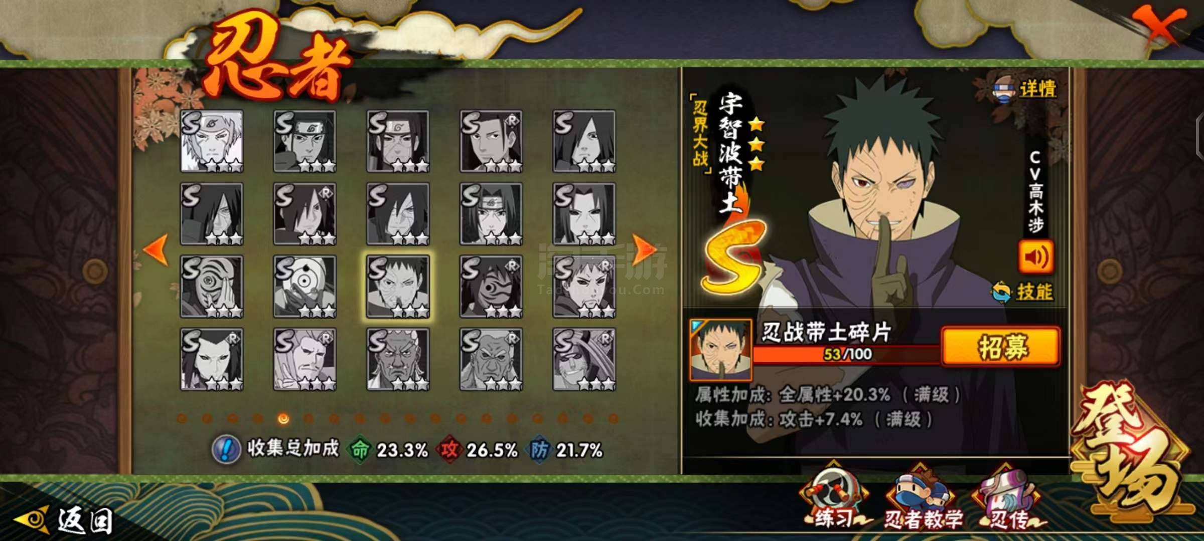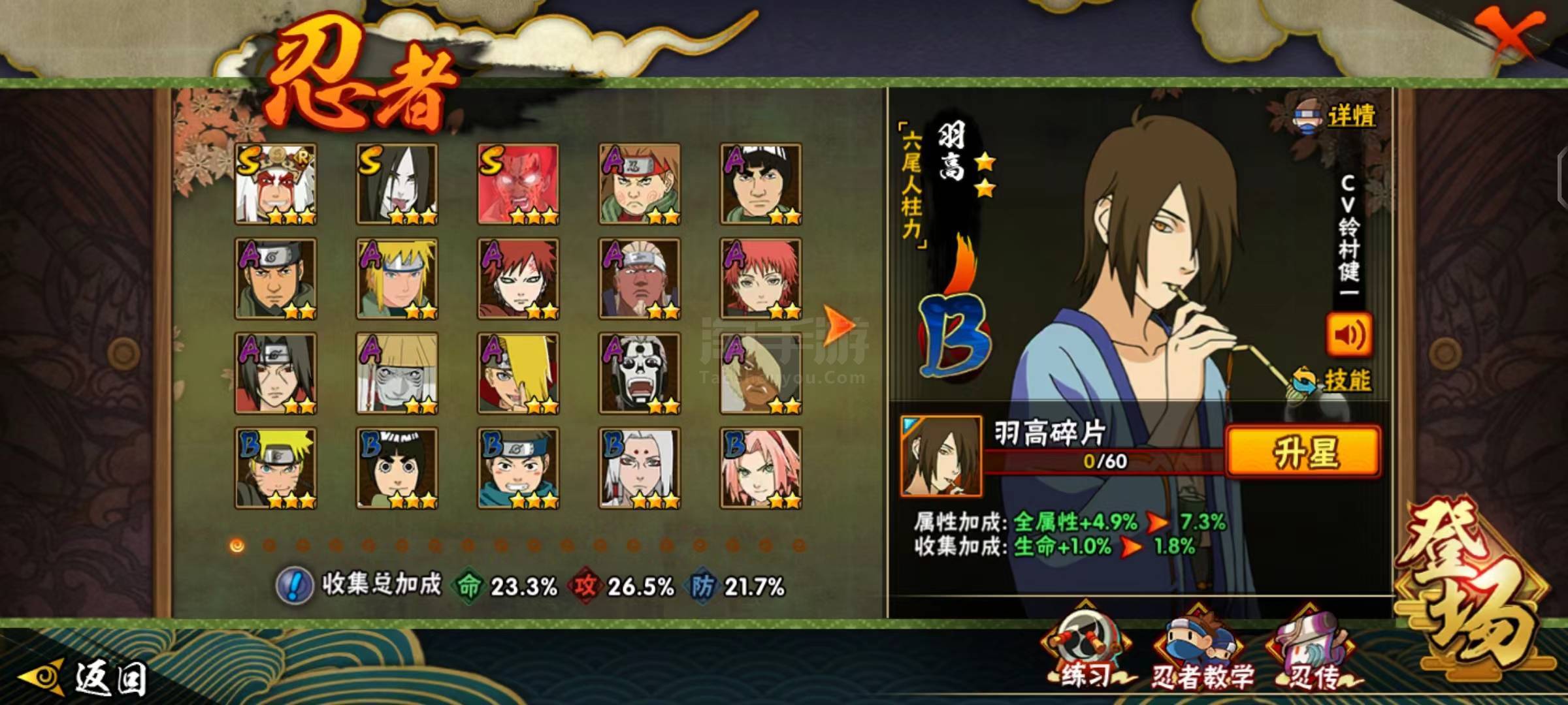 【A级忍者】:艾 「青年」(2星艾 「青年」),波风水门 「青年」(2星波风水门 「青年」),迪达拉(2星迪达拉),飞段「死司凭血」(2星飞段「死司凭血」),干柿鬼鲛(2星干柿鬼鲛),迈特凯(2星迈特凯),秋