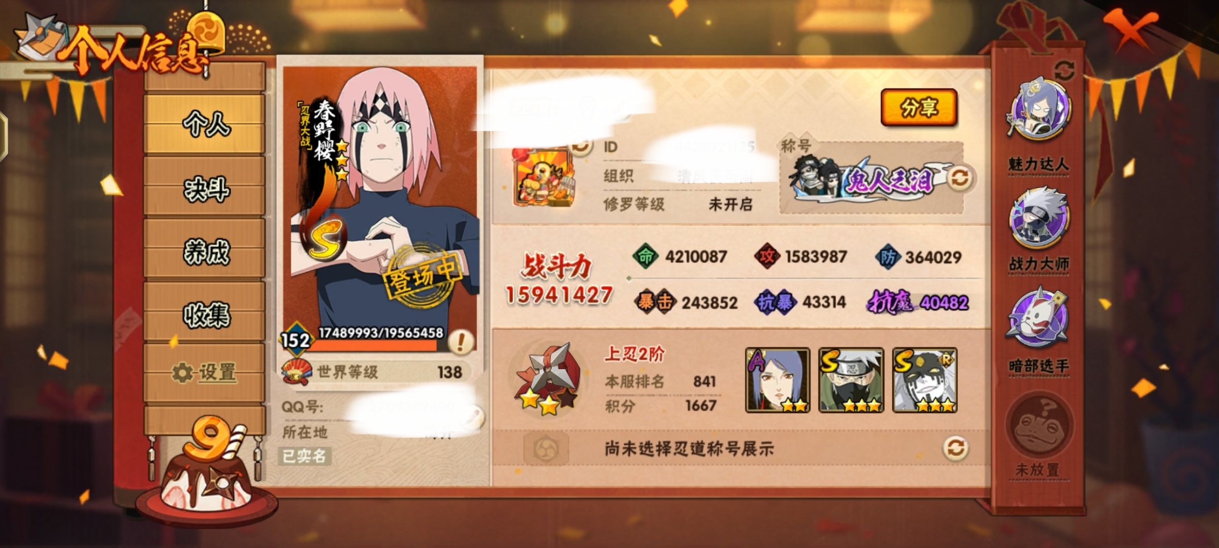 火影忍者【安卓QQ】急出可刀1594w战力,三代风,其他差不多都过半,有熊猫,有榜,忍发帖已开下赛季可续,月卡还在