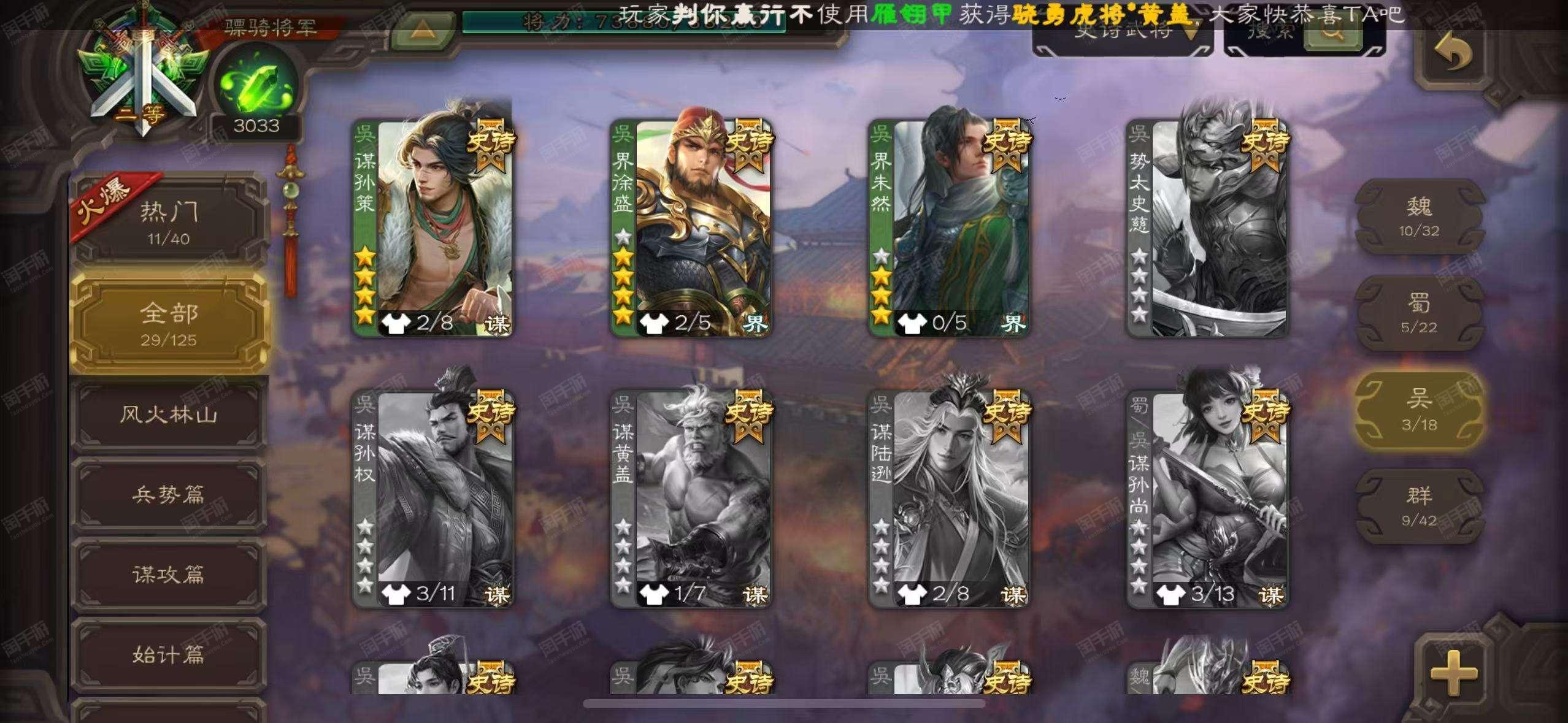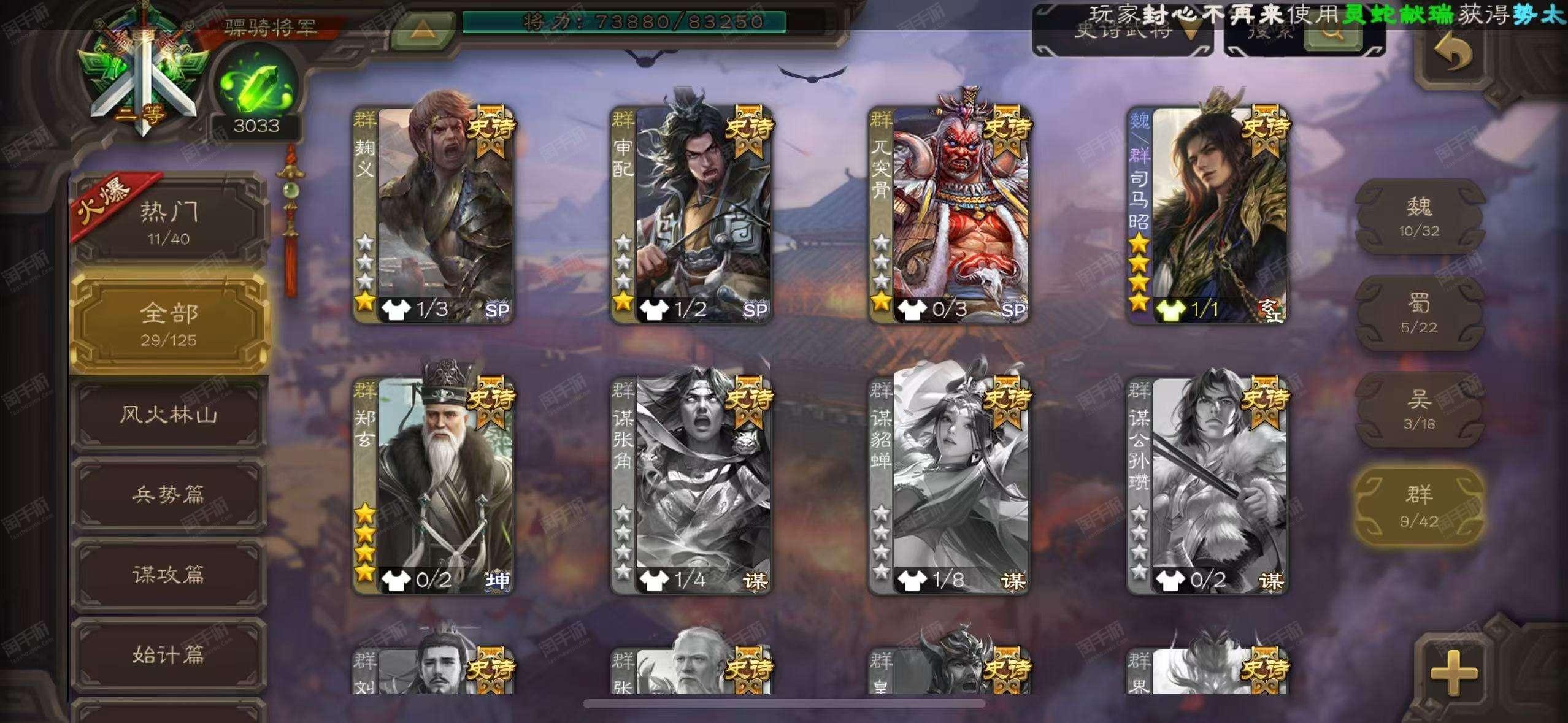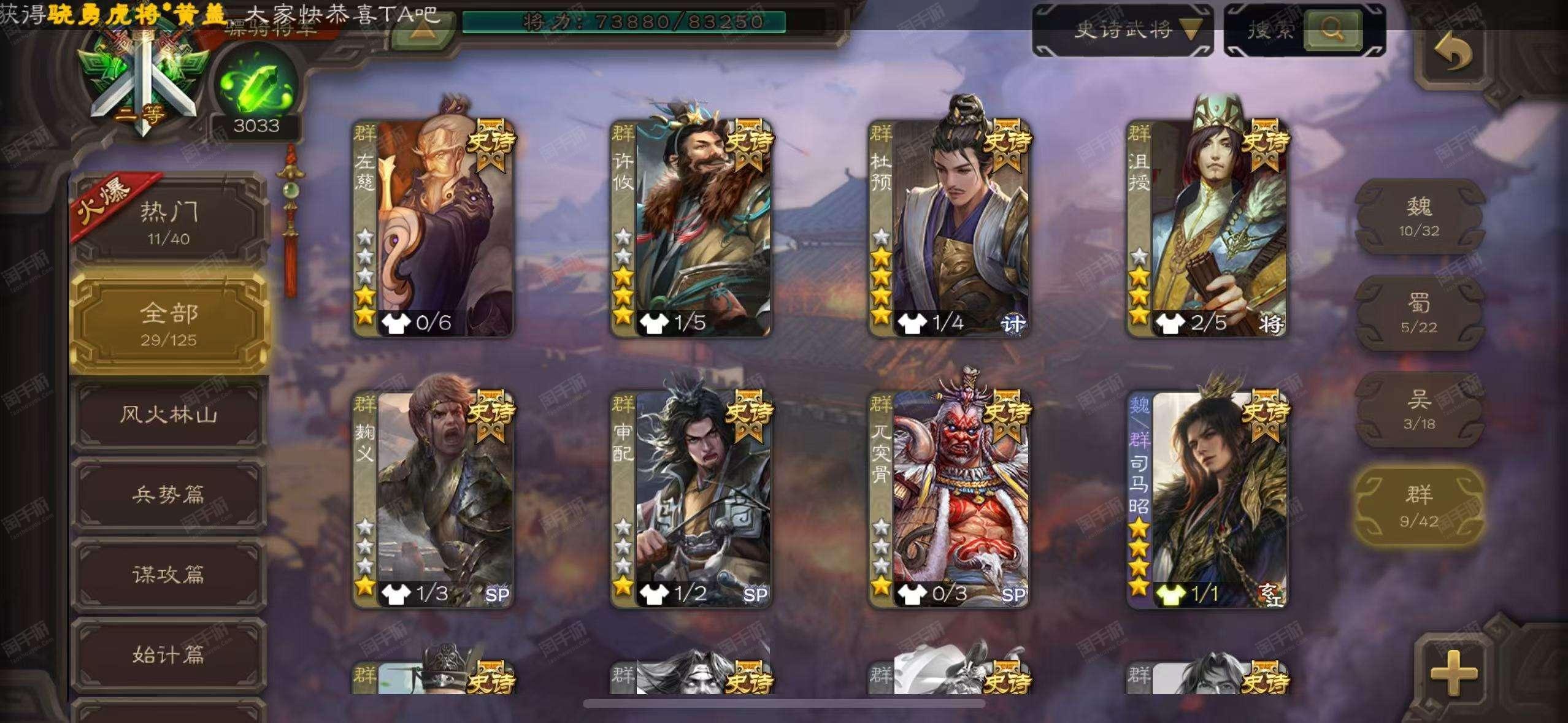 八军皇帝杜预大宝司马昭戏子水果忍者等30多个史诗武将神将吕赵辽布周葛羽7个带动皮含泪甩卖